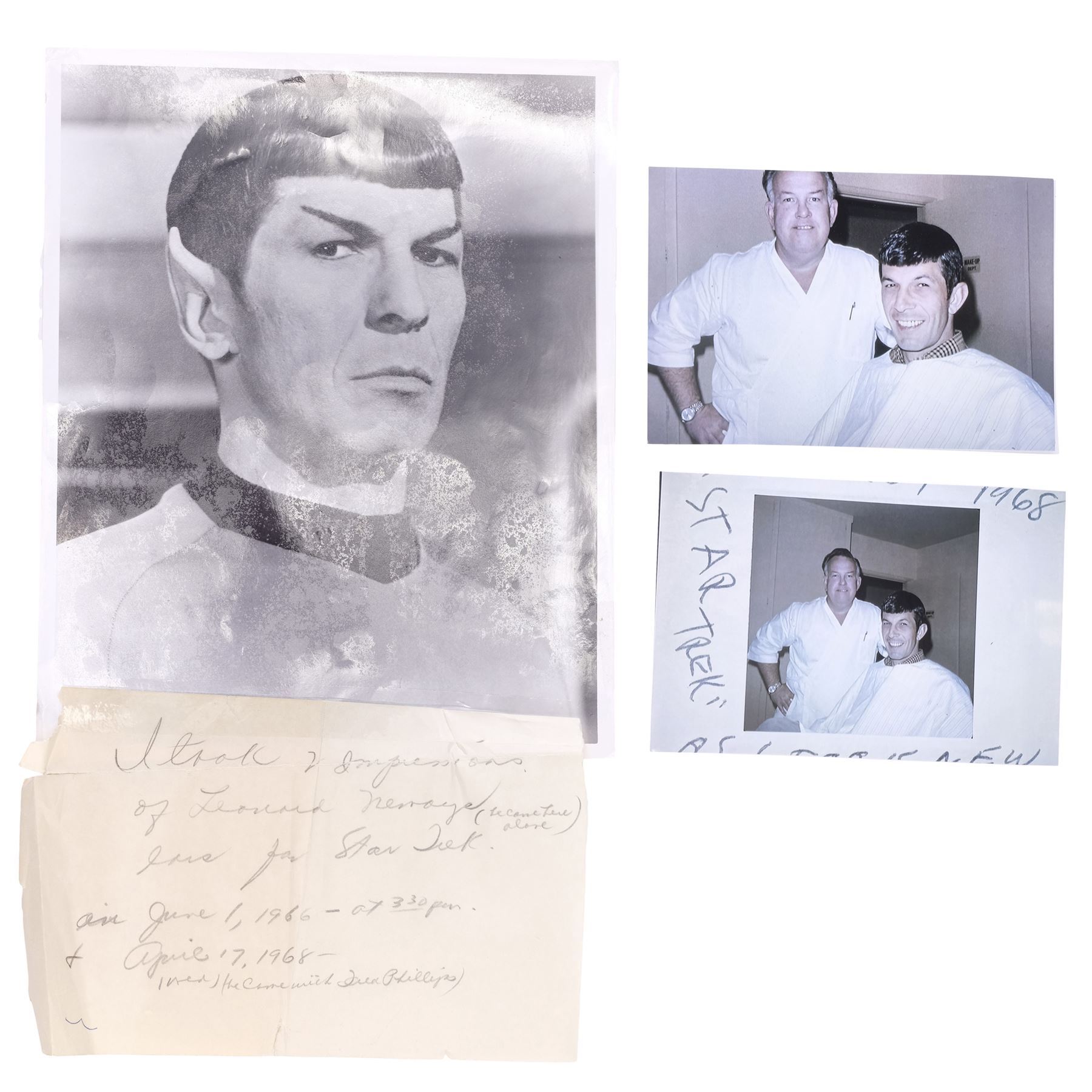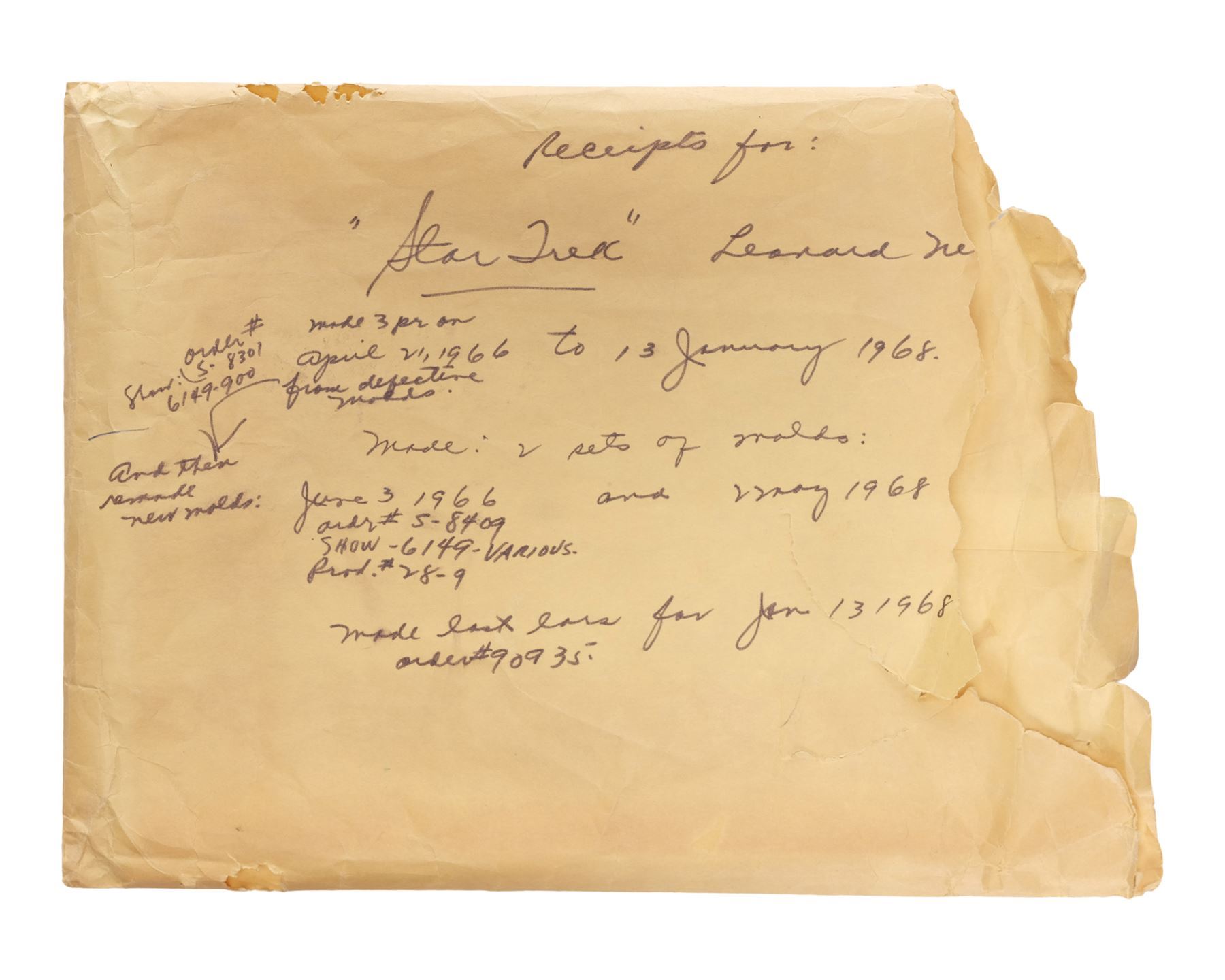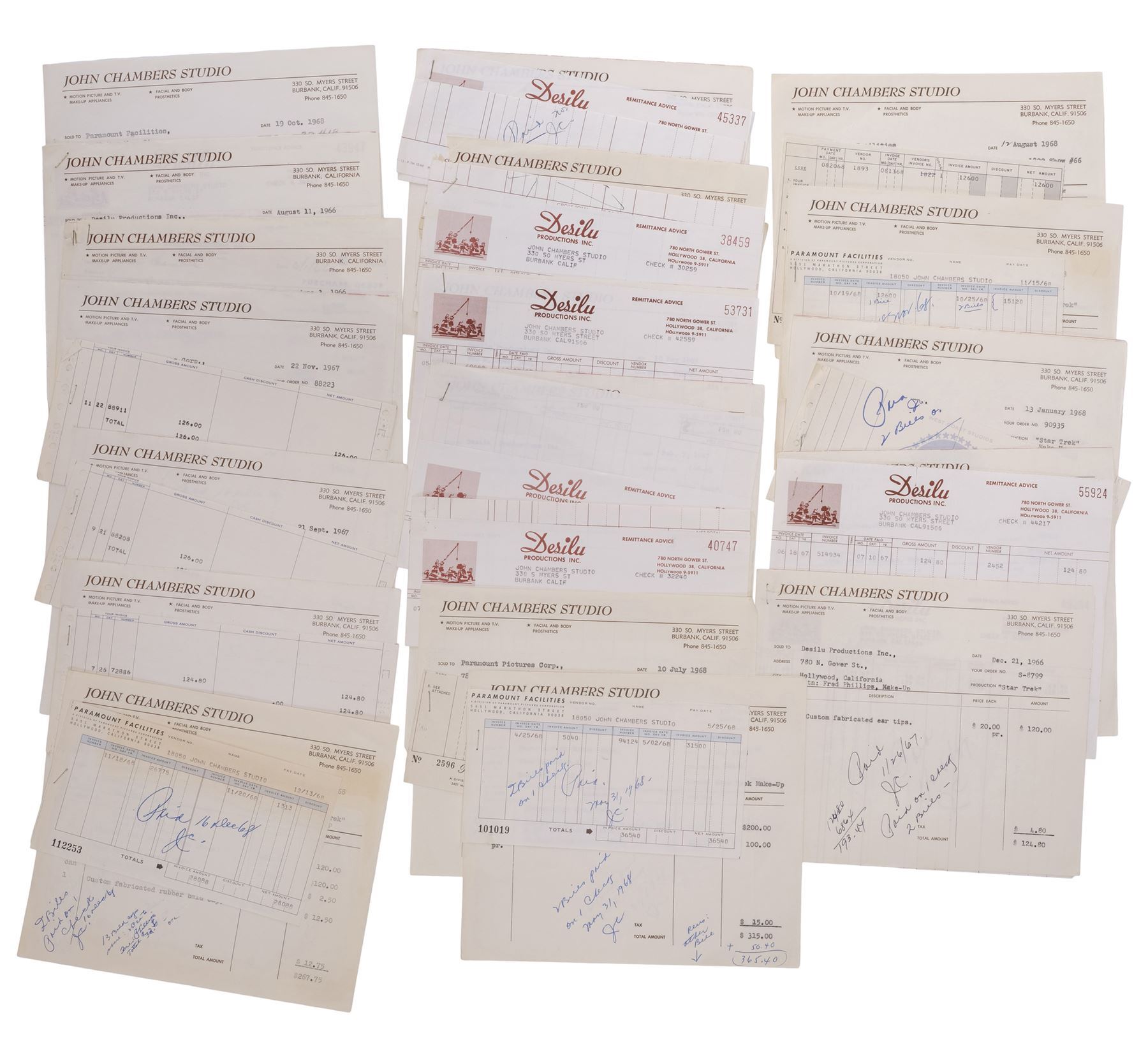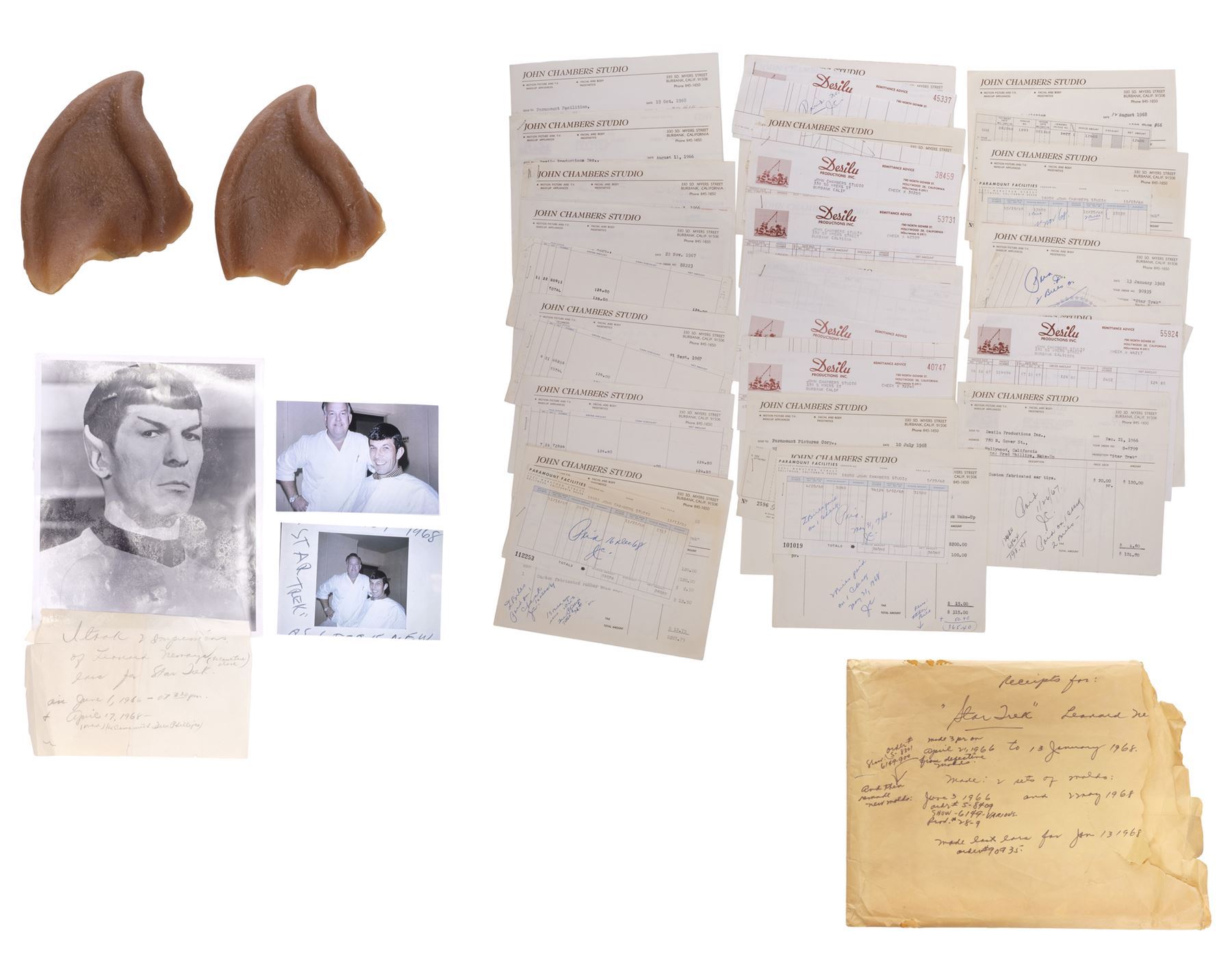 This lot comes from the collection of SFX makeup artist John Chambers. It consists of two wax pointed ear prosthetics; an 8.5" x 10" black-and-white photo of Spock with a label "Leonard Nimoy's Dr. Spock ears were a production of John Chambers expertise" and handwritten annotations "I created the ears for Mr. Spock in 1965 or 1966" and "I took 2 impressions of Leonard Nimoy's ears for Star Trek on June 1, 1966 at 3:30 pm and April 17, 1968"; two color images of Nimoy and Chambers in makeup; and 44 pages of receipts with handwritten annotations from Chambers inside a manila folder with hand annotations. This lot exhibits discoloration on the receipts and numerous tears in the folder from age. Dimensions: 8.5" x 10" (21.75 cm x 25.5 cm)