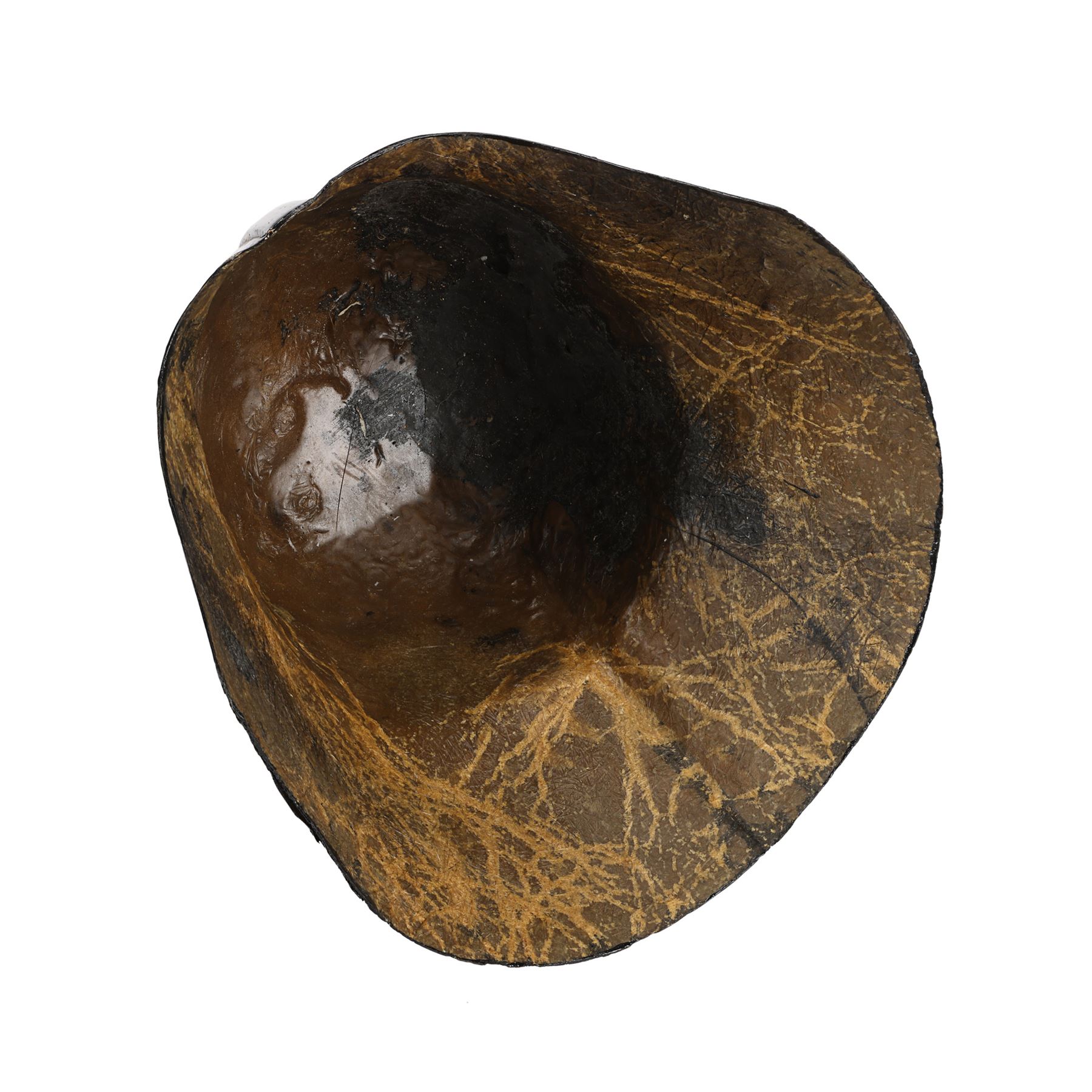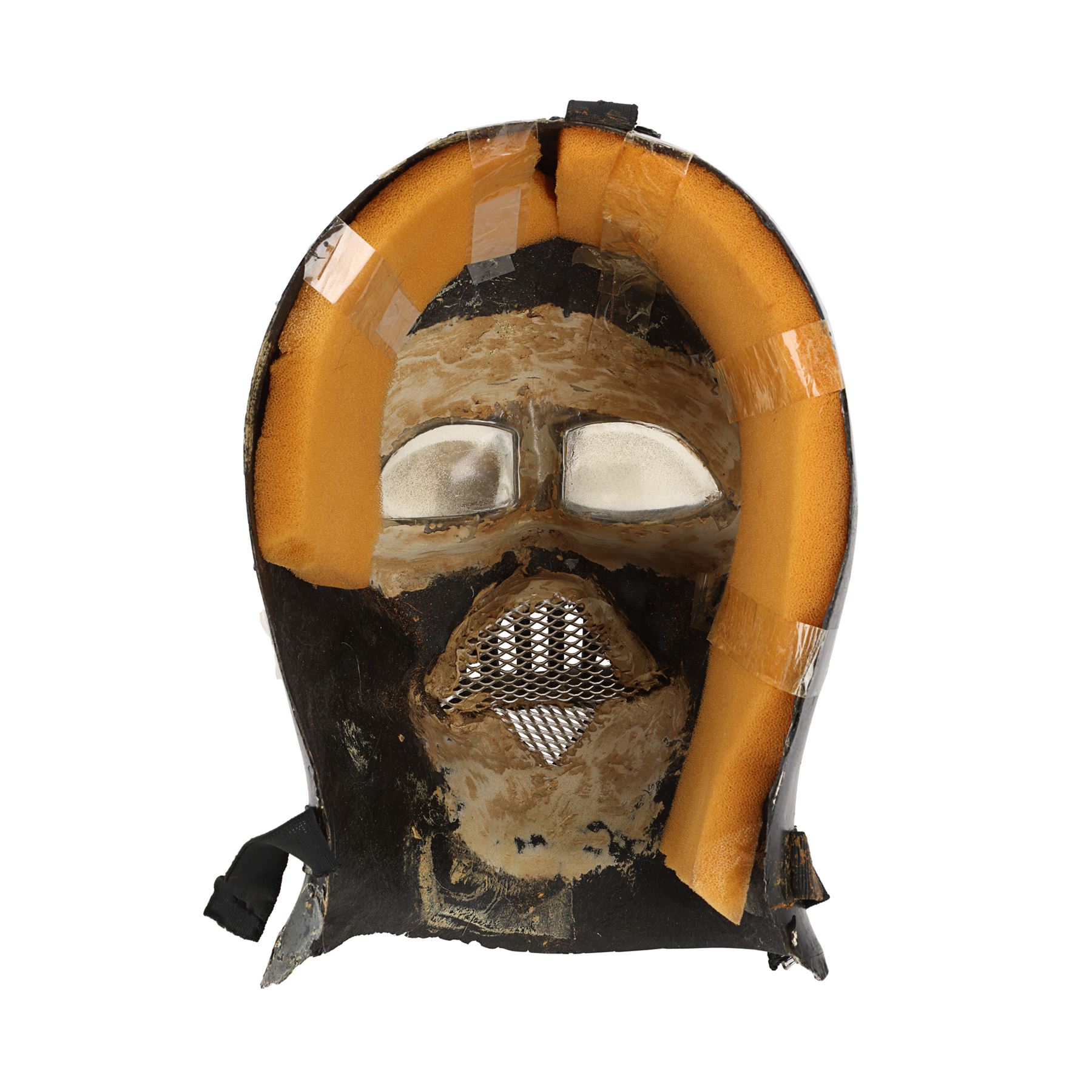 The helmet comes in two parts - the face mask and the dome - and is predominantly made of fibreglass, with a metal grate over the mouth, clear plastic eyes and a foam lining. It has been finished in black paint, although this is unlikely to have been during production. The mesh and foam are also likely added later. The face mask features elastic straps on the back. The lot has some wear from age - most notably cracked fibreglass around the throat and some of the edges, and chips to the paint work.