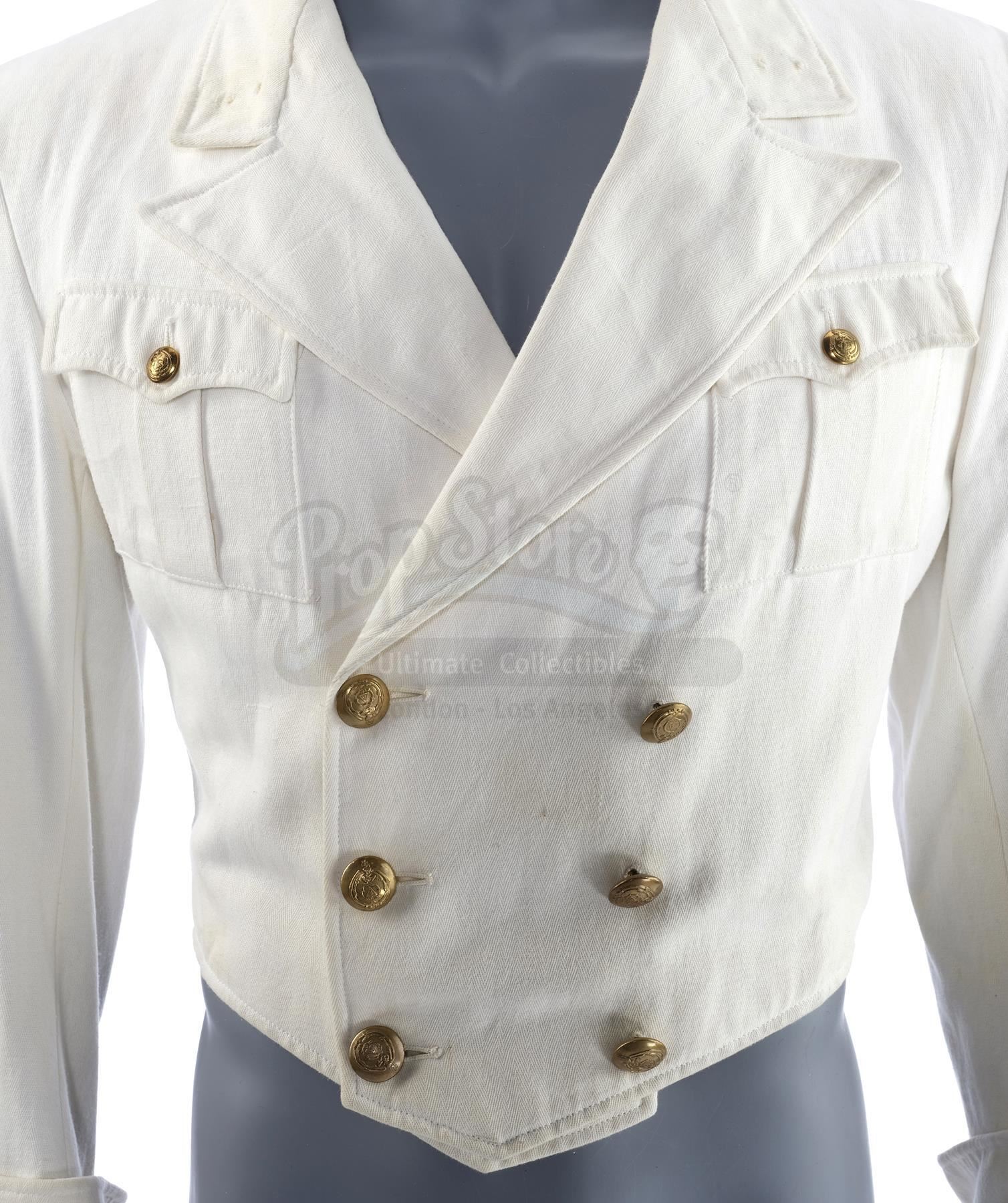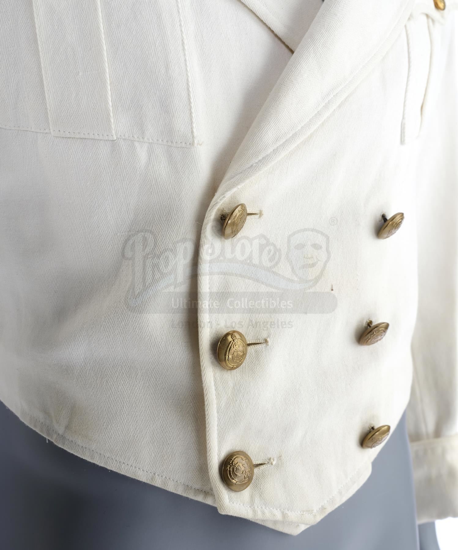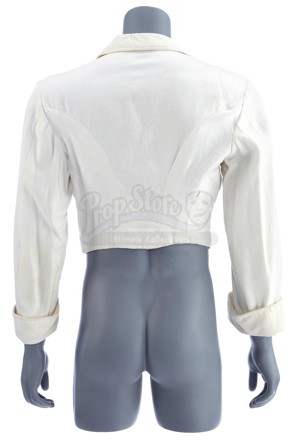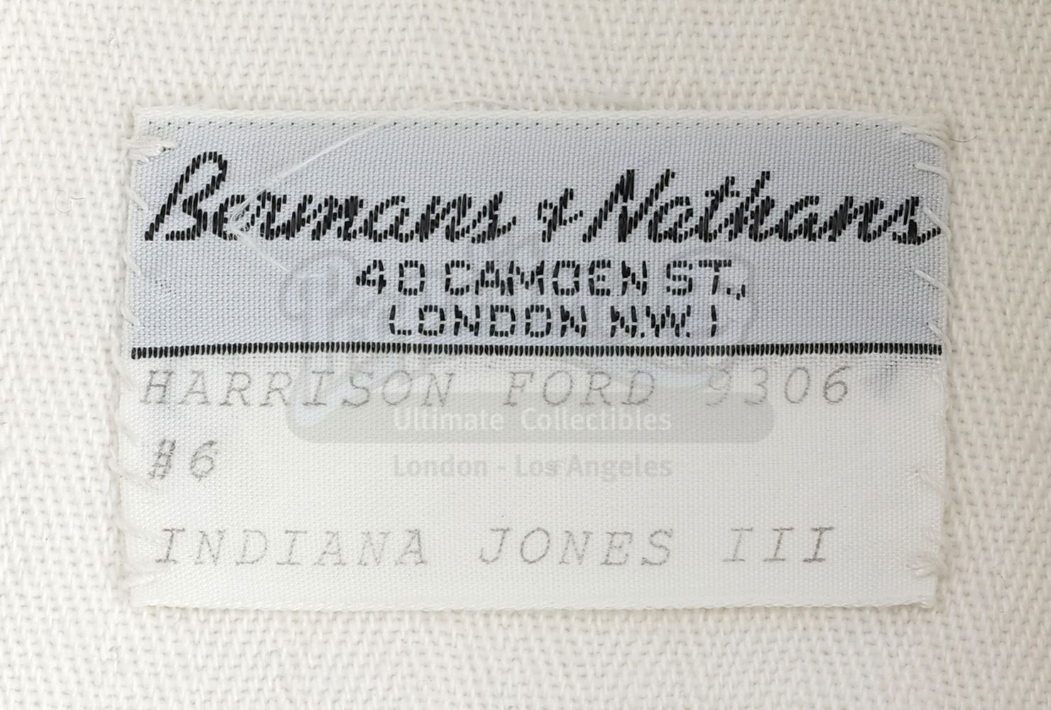 This high-waisted, double-breasted white twill jacket features front and wide lapels, goldtone buttons sewn onto the front and breast pockets, and A Bermans and Nathans costume tag on the interior labeled "Harrison Ford 9306 #6 Indiana Jones III". The jacket is in fair overall condition with light wear, including various stains and holes on the lapels where pins were once attached. Dimensions: 30" x 23" x 2" (76.5 cm x 58.5 cm x 5.5 cm)