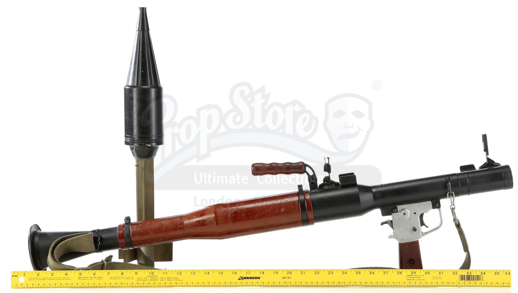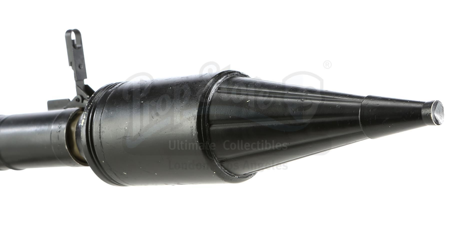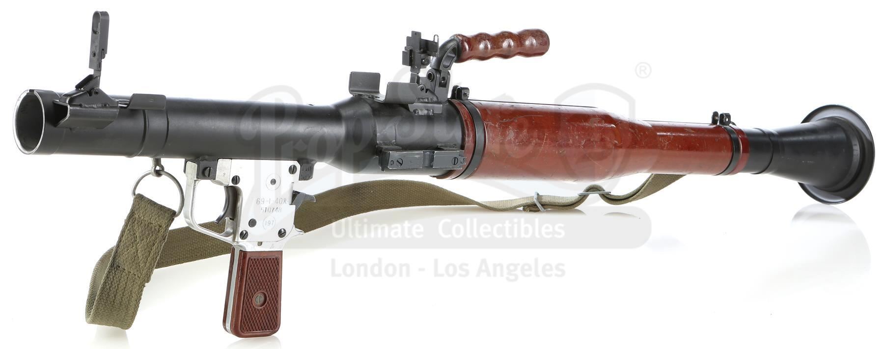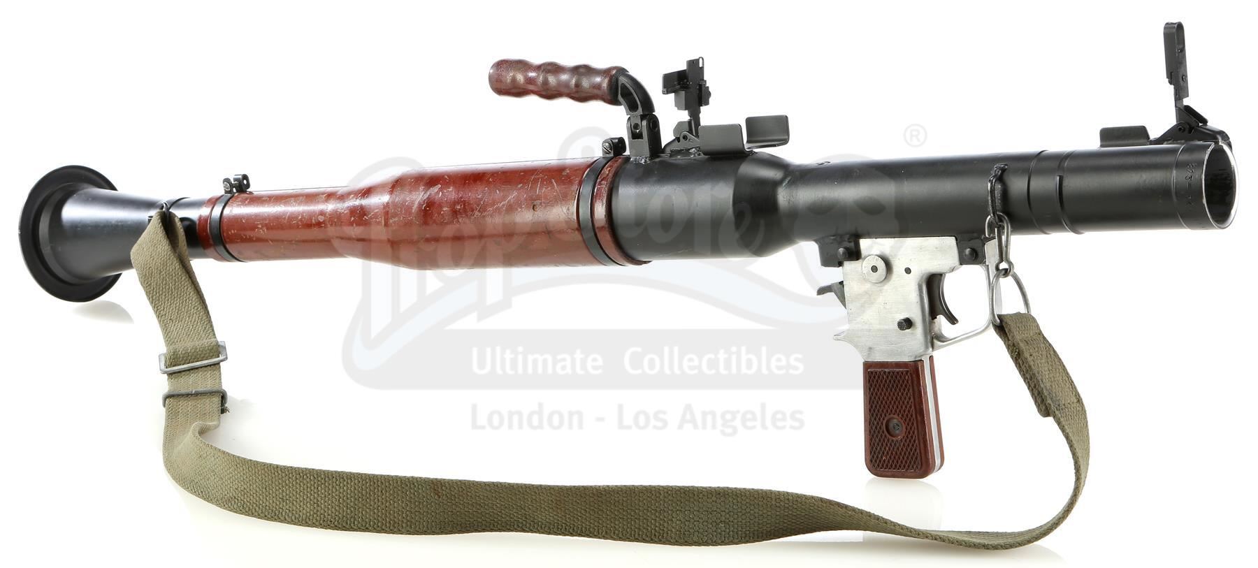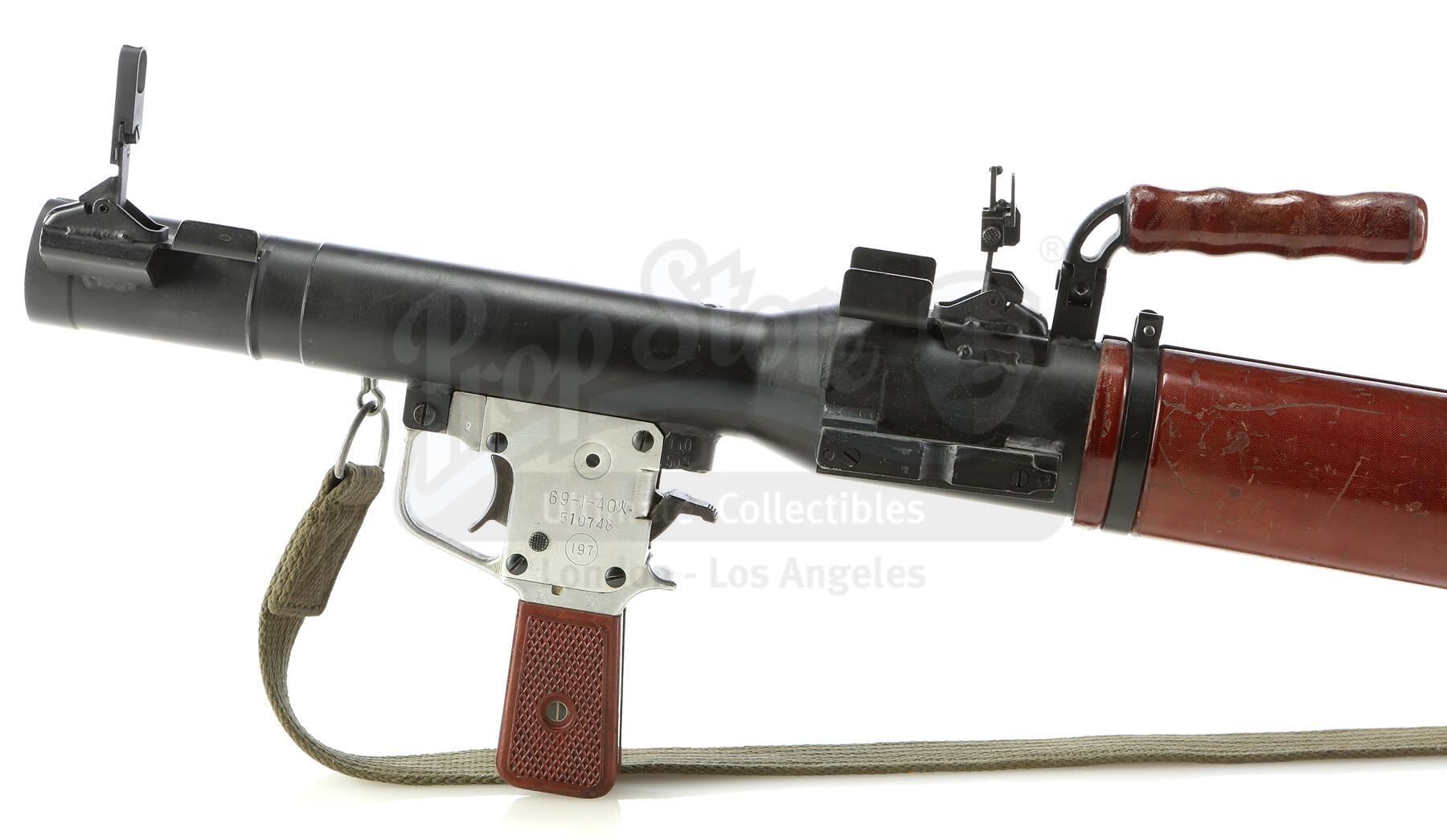This film-prop, non-functional Type 69 RPG launcher with a brown carrying handle was altered by production to more closely resemble a Soviet-style RPG-2, though the launched rockets themselves were computer-generated. The launcher screen matches based on scratches on the brown body sleeve. It is constructed of metal and resin components painted umber, chrometone, and charcoal with a green clip-on nylon shoulder strap and serial number "69-I-40-510748-197." Also included are two olive and black resin PG-2 anti-tank rockets with metallic finishes and a licensed glossy color still from the film.