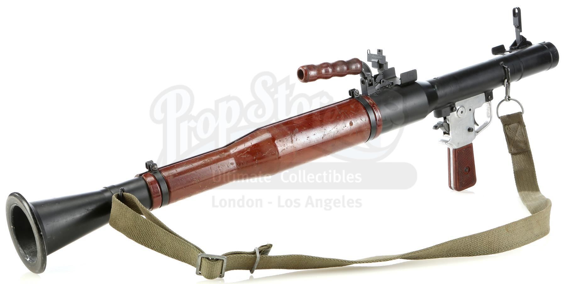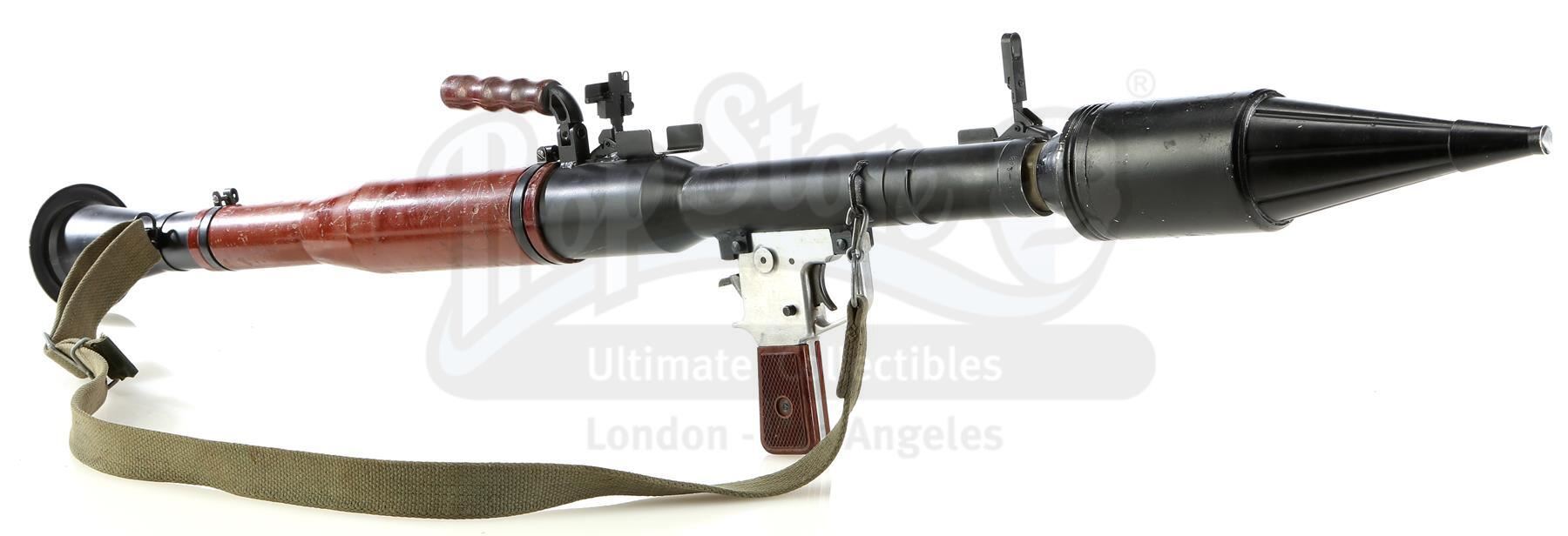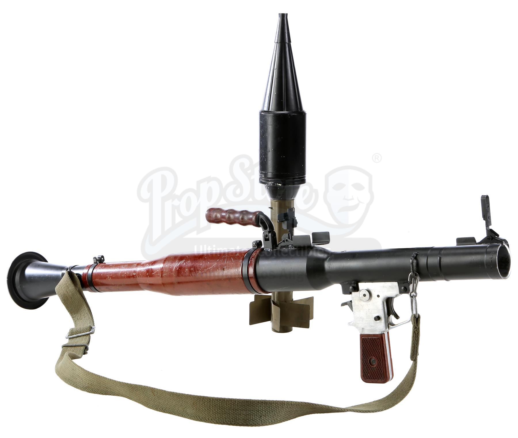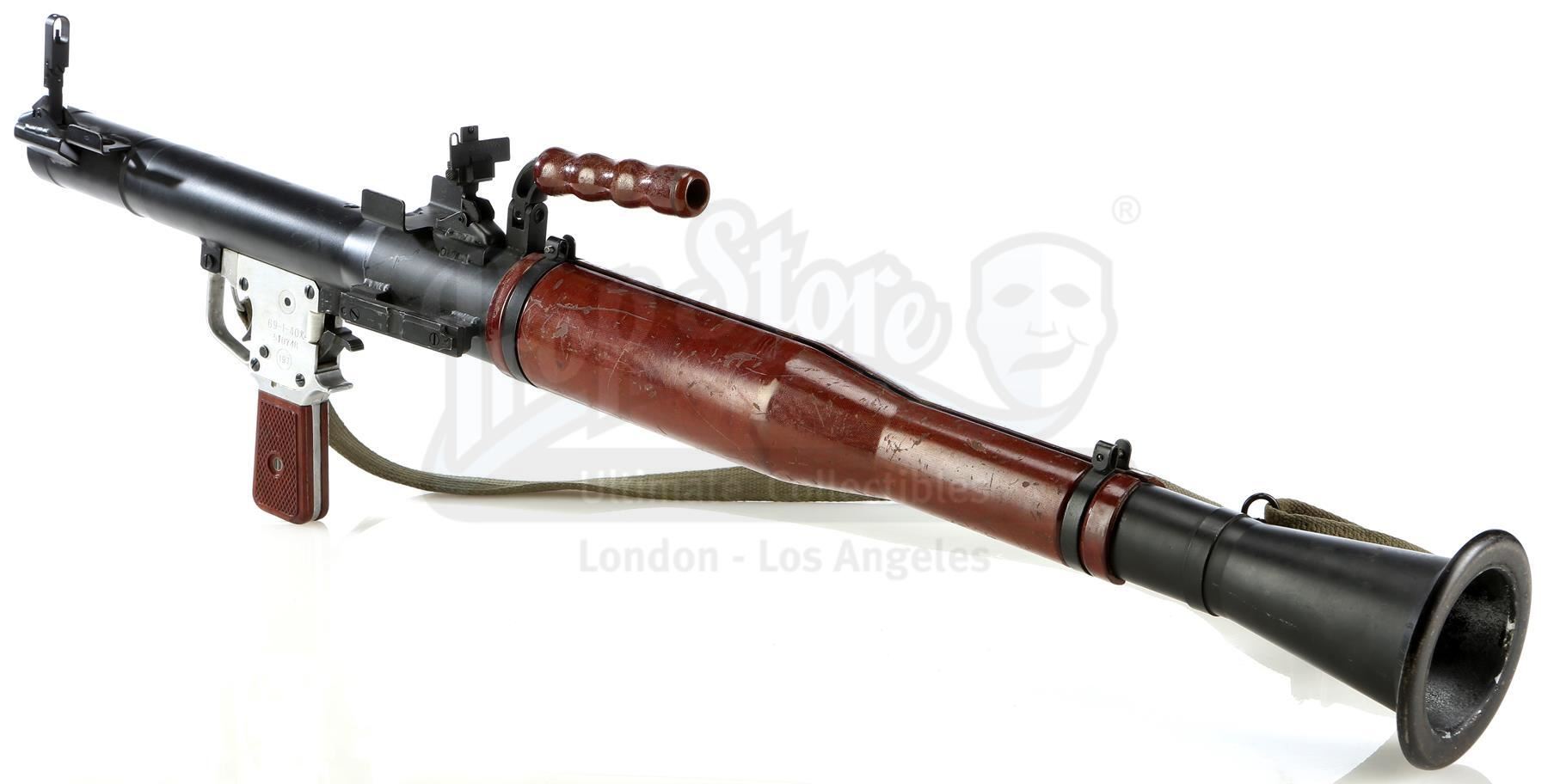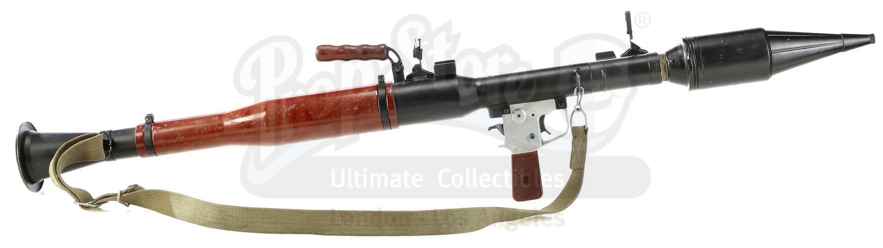 This film-prop, non-functional Type 69 RPG launcher with a brown carrying handle was altered by production to more closely resemble a Soviet-style RPG-2, though the launched rockets themselves were computer-generated. The launcher screen matches based on scratches on the brown body sleeve. It is constructed of metal and resin components painted umber, chrometone, and charcoal with a green clip-on nylon shoulder strap and serial number "69-I-40-510748-197." Also included are two olive and black resin PG-2 anti-tank rockets with metallic finishes and a licensed glossy color still from the film.