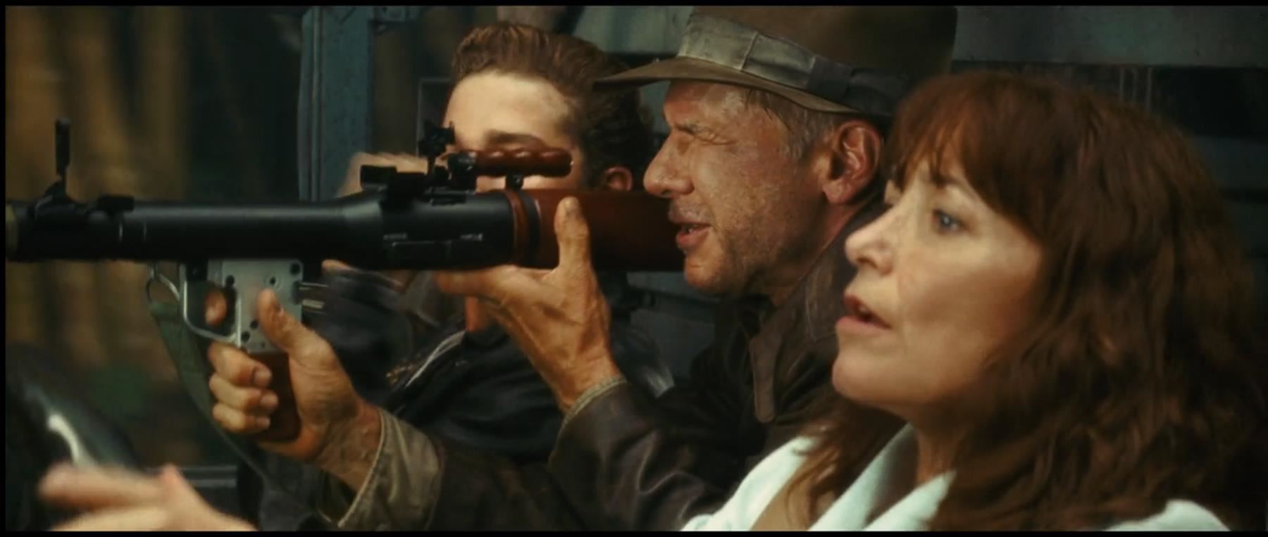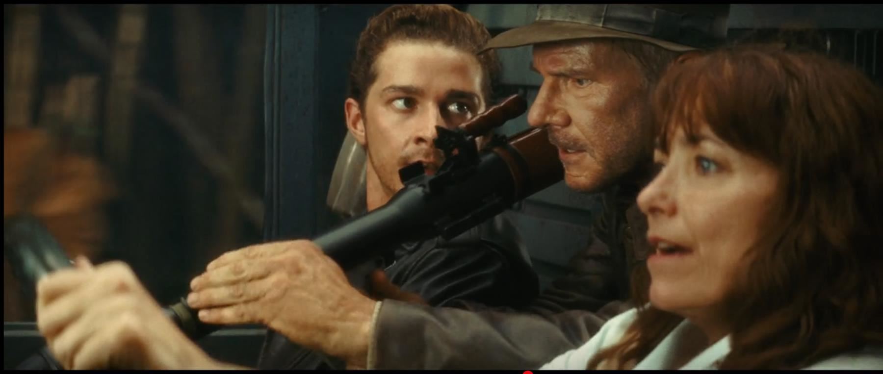 Indiana Jones' (Harrison Ford) screen-matched rocket-propelled grenade launcher from Steven Spielberg's action-adventure sequel Indiana Jones and the Kingdom of the Crystal Skull. Jones fired an RPG-2 during the jungle chase sequence, scaring Marion Ravenwood (Karen Allen), and Mutt Jones (Shia LaBeouf).