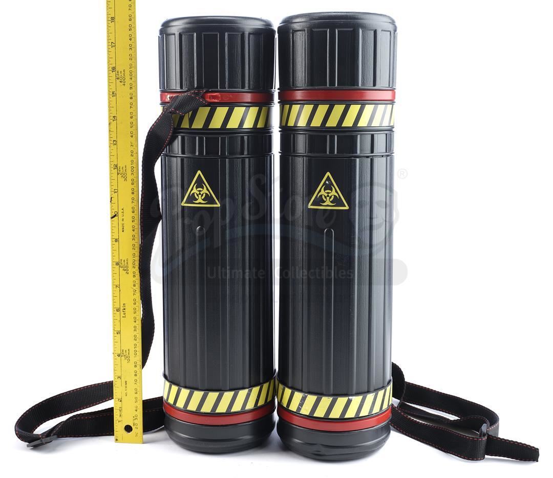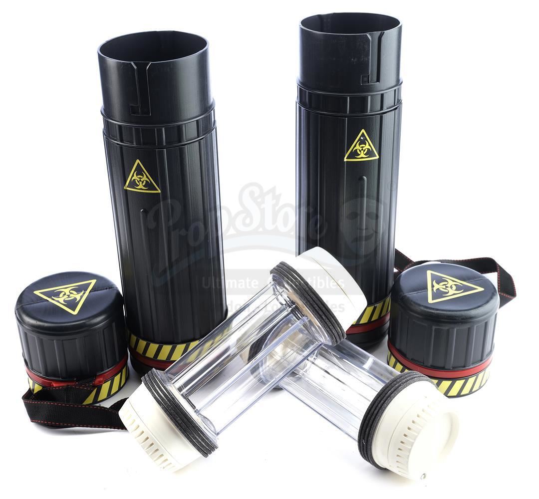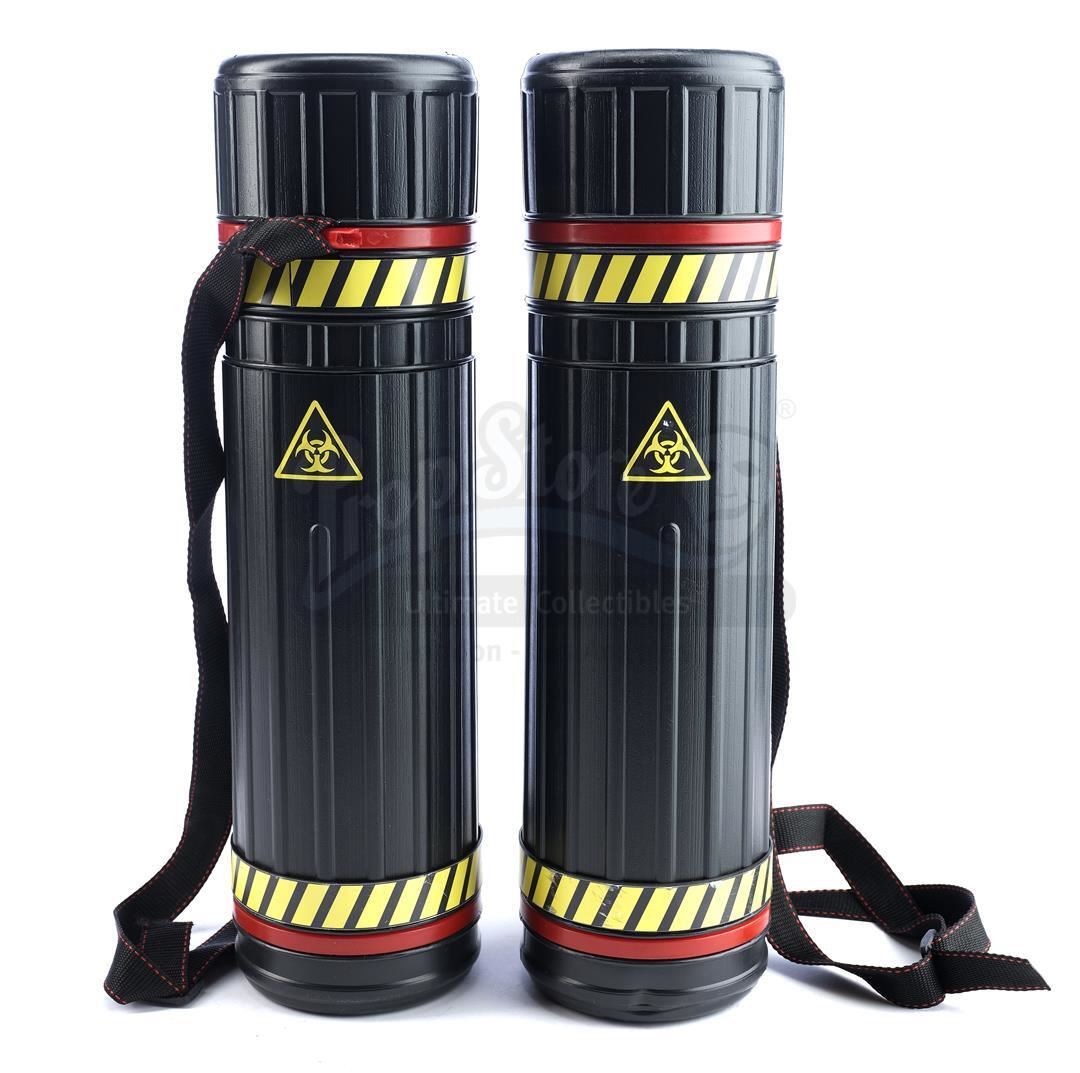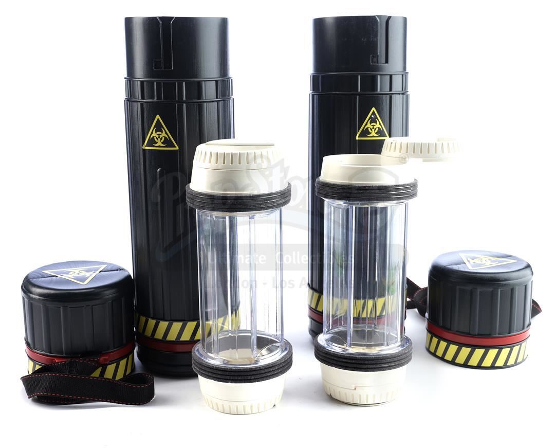 Two Gravitonium cases with containment canisters from the episode 'Option Two' (519) of Marvel's Agents of S.H.I.E.L.D. In the episode, Leo Fitz and Jemma Simmons transfer a sample of the volatile element Gravitonium into a transportable container which Deke Shaw carries on his back. This lot consists of a pair of black urethane containers with red details, black and yellow decals and black nylon carrying straps, and a pair of transparent, black and cream-colored urethane and rubber containers with magnetized openings. It is in excellent overall condition with minor signs of wear from production on all items.