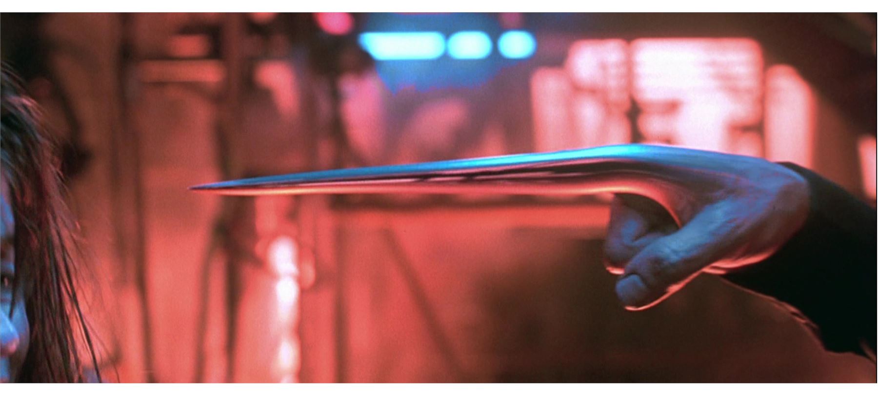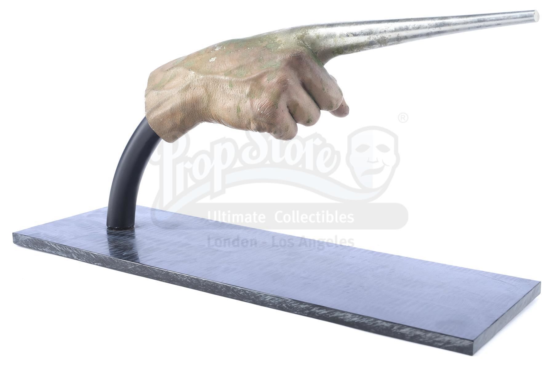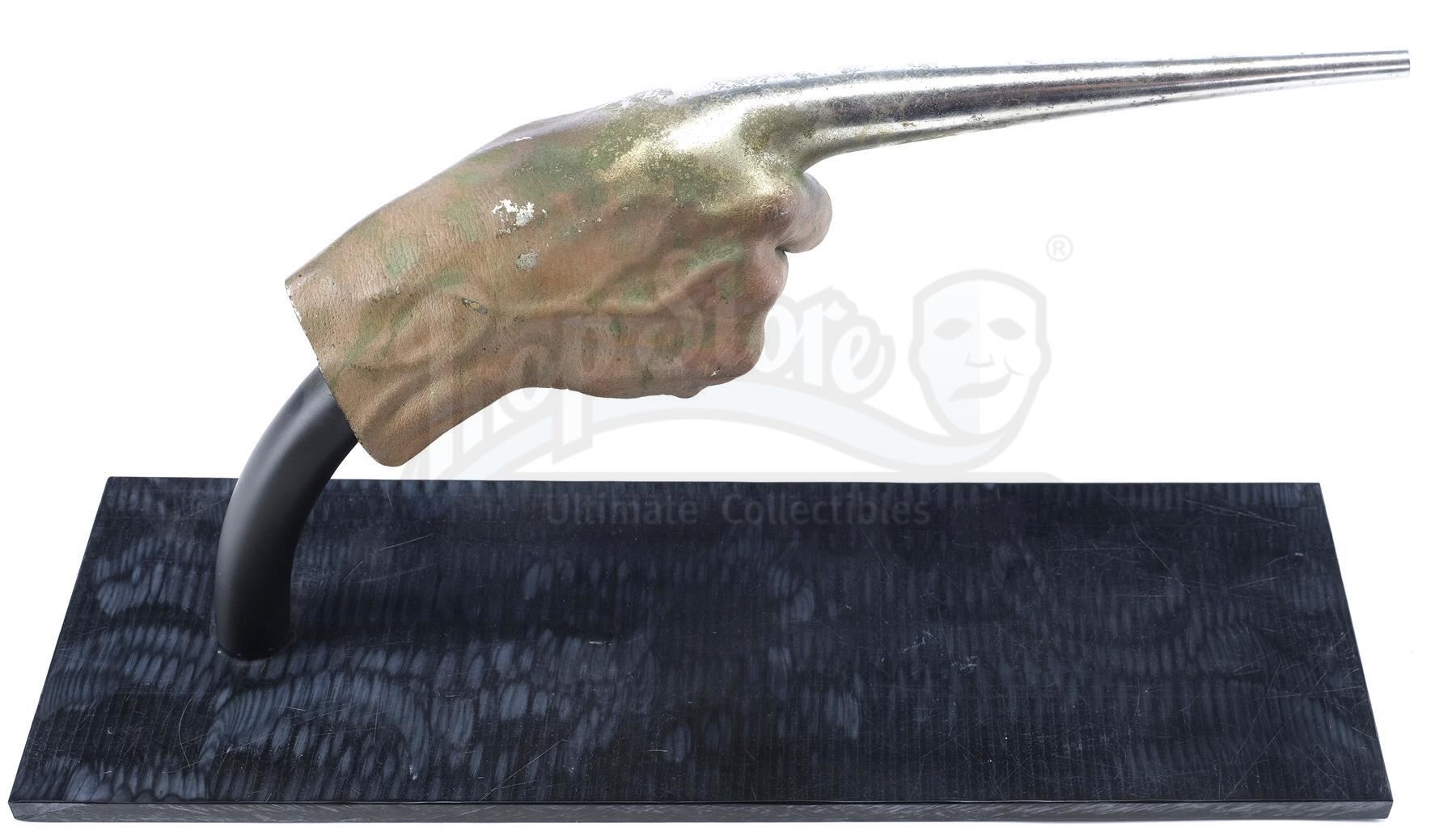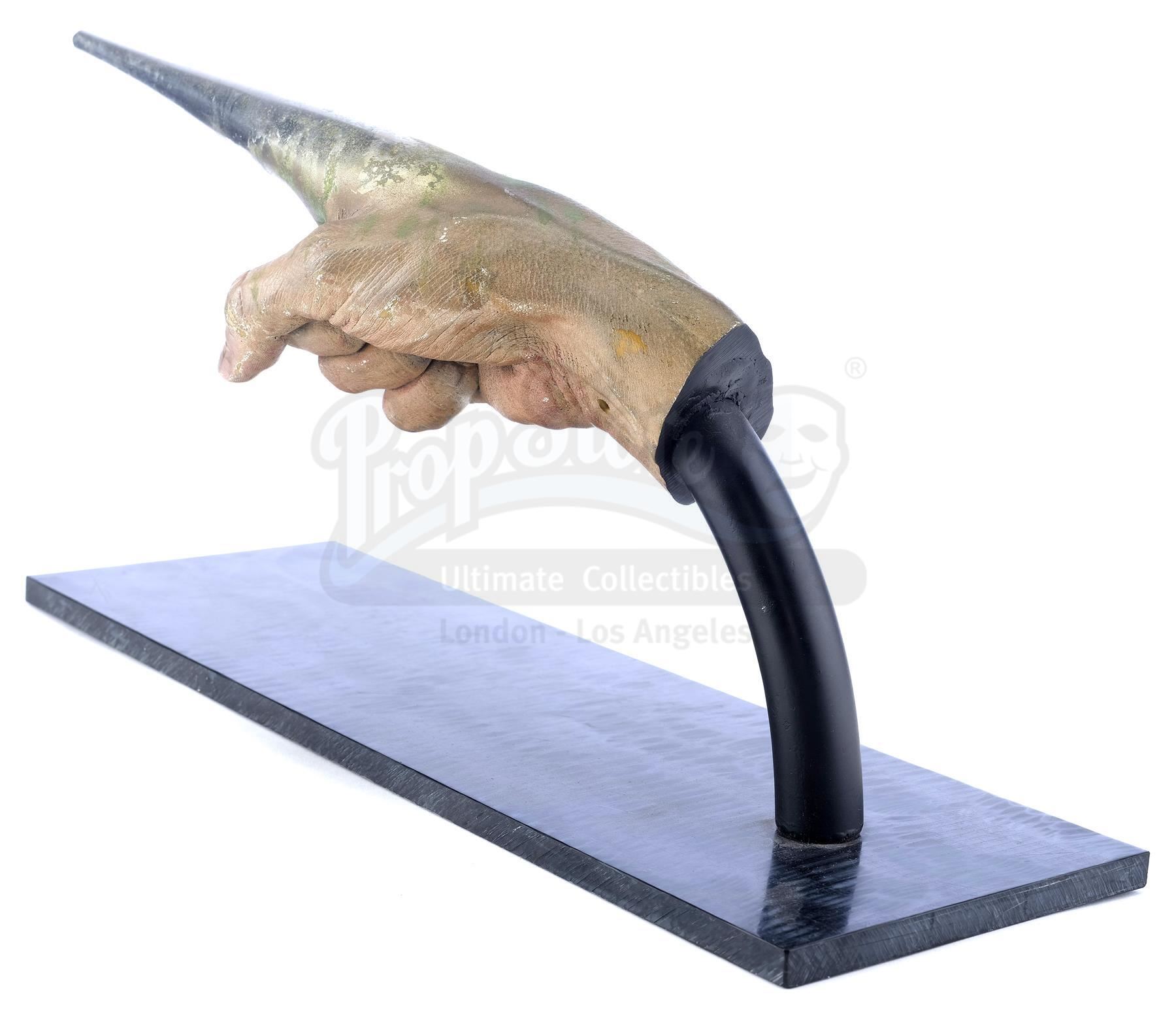 This lot will be auctioned on Tuesday, June 29th. The auction will begin at 9:00am PDT and lots are sold sequentially via live auctioneer; tune in to the live streaming broadcast on auction day to follow the pace. Note other lots in the auction may close on June 30th or July 1st. A T-1000 (Robert Patrick) SFX finger reference model from James Cameron's sci-fi action sequel Terminator 2: Judgment Day. The T-1000 liquid terminator turned its finger into a long blade on several occasions throughout the film, and used it as a deadly weapon. The character's transformations were rendered with a combination of live-action photography and rotoscope animation, and this served as a reference model for animators of the transitioning finger. The hand is made of resin, painted in flesh tones and finished with green and silver-color paint. It is mounted on a curved black metal and stone display base. It is in good overall condition with some wear from production and age, including paint flaking throughout. Dimensions: 16" x 6" x 10" (40.75 cm x 15.25 cm x 25.5 cm) Estimate: $4,000 - 6,000