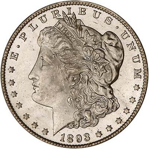1893-CC Morgan Dollar. A better than average central impression was left by the stamp of the dies that struck this 1893-CC, (these are often found with weakness in the hair and on the eagle's breast). The sleek silver-white surfaces are smooth from rim to rim with no carbon to report and only the usual small coin-to-coin contact marks on the cheek and hair, also along the tops of the eagle's wing feathers -- consistent with this grade. Scarce when fully lustrous, both sides possess eye appeal to spare. (#7222)