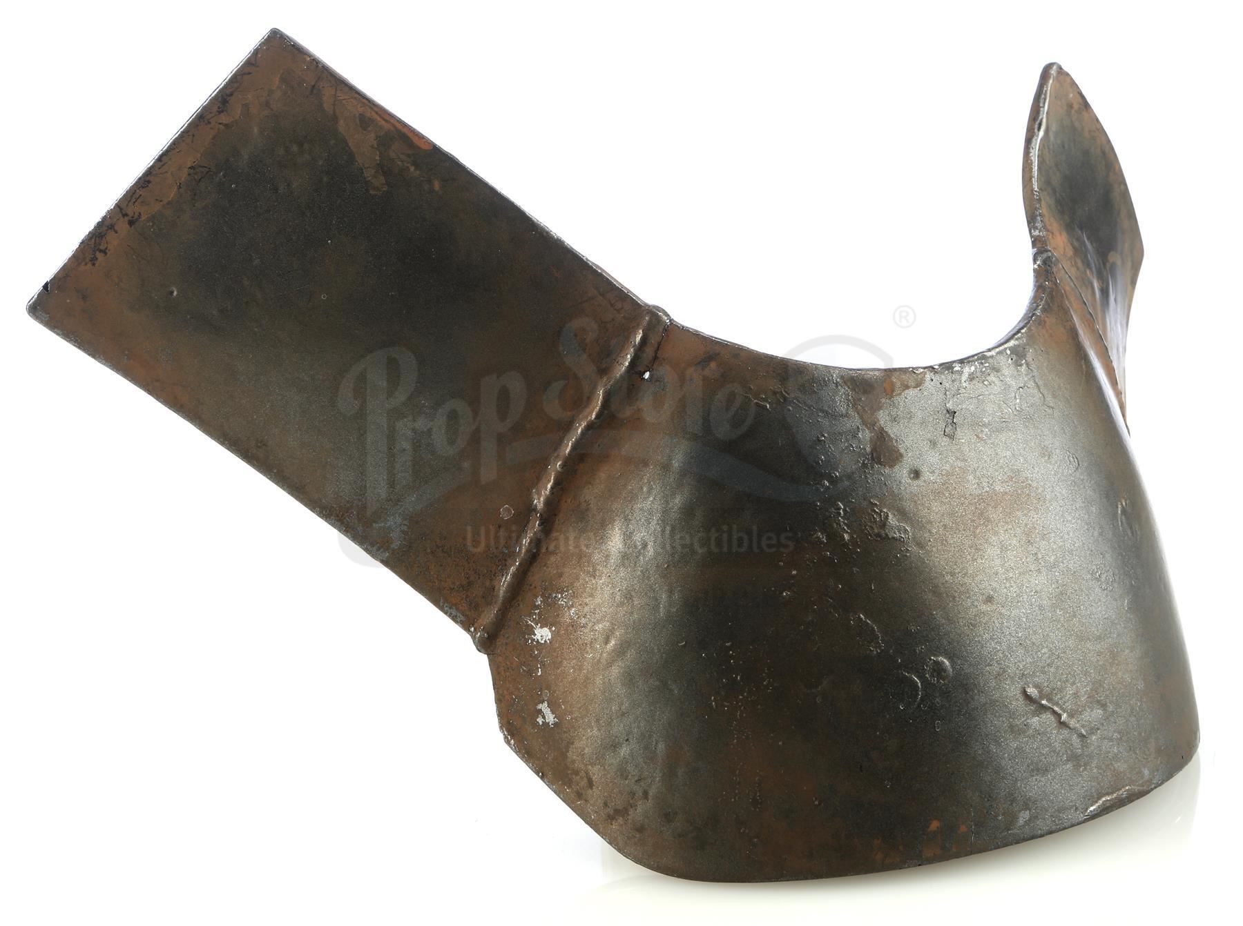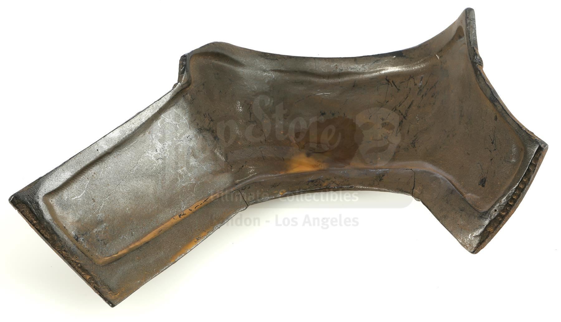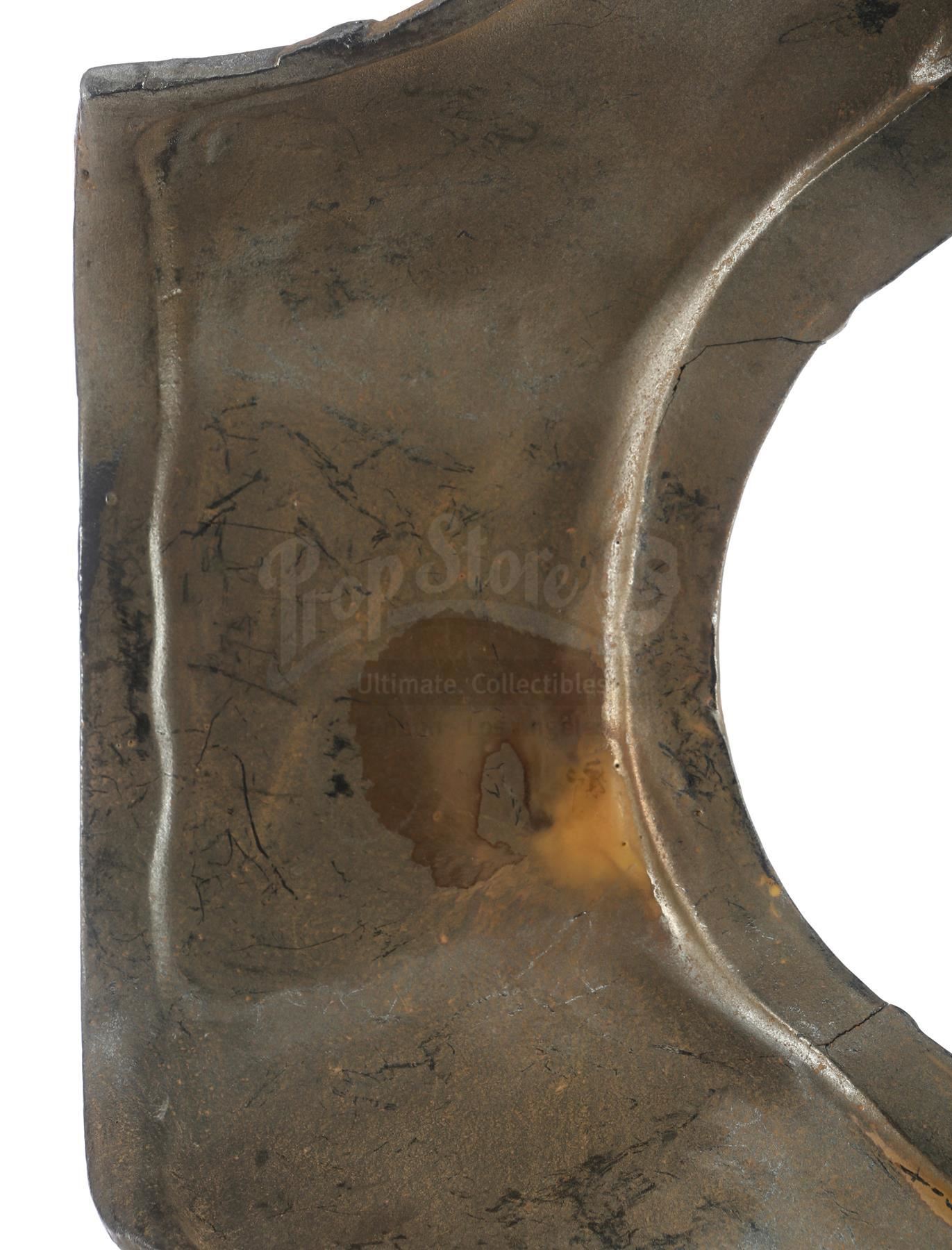 This custom-molded piece of hard resin is one of several which would combine to form the full costume. This particular piece would be affixed to the bottom section of the chest directly underneath the mini-arc reactor power source. It features irontone paint with deliberate rust and wear details. This armor piece is in excellent overall condition with minor signs of wear from production and some scuffing and discoloration on the interior.
