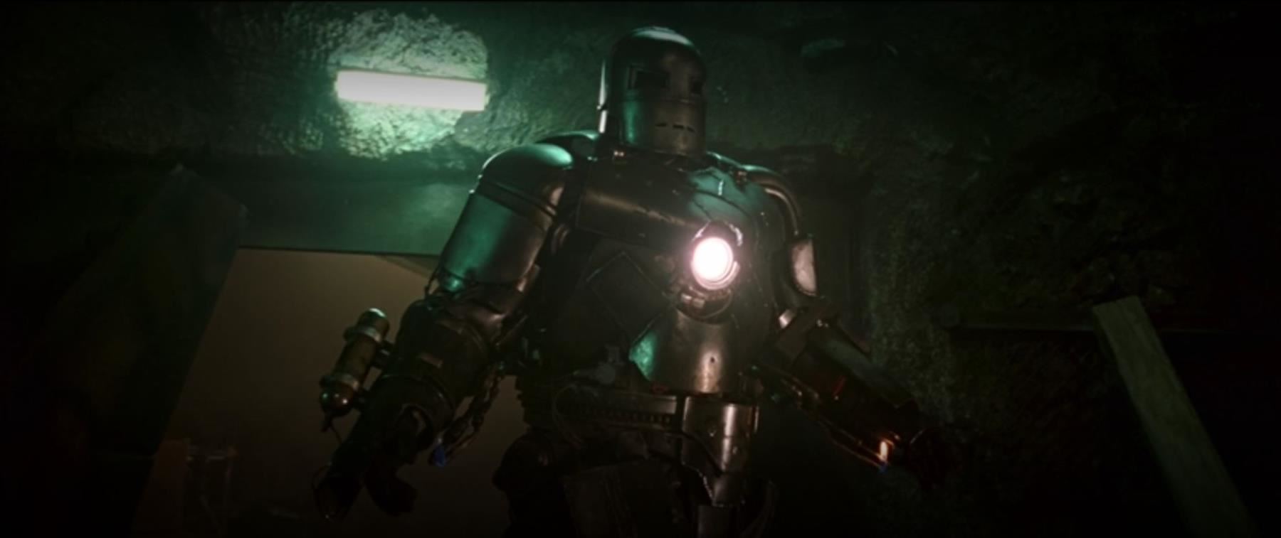 A Mark 1 armor piece from Jon Favreau's superhero adventure Iron Man. Brilliant inventor Tony Stark (Robert Downey Jr.) created an iron battle suit to escape from being held as the hostage of terrorist organization The Ten Rings.