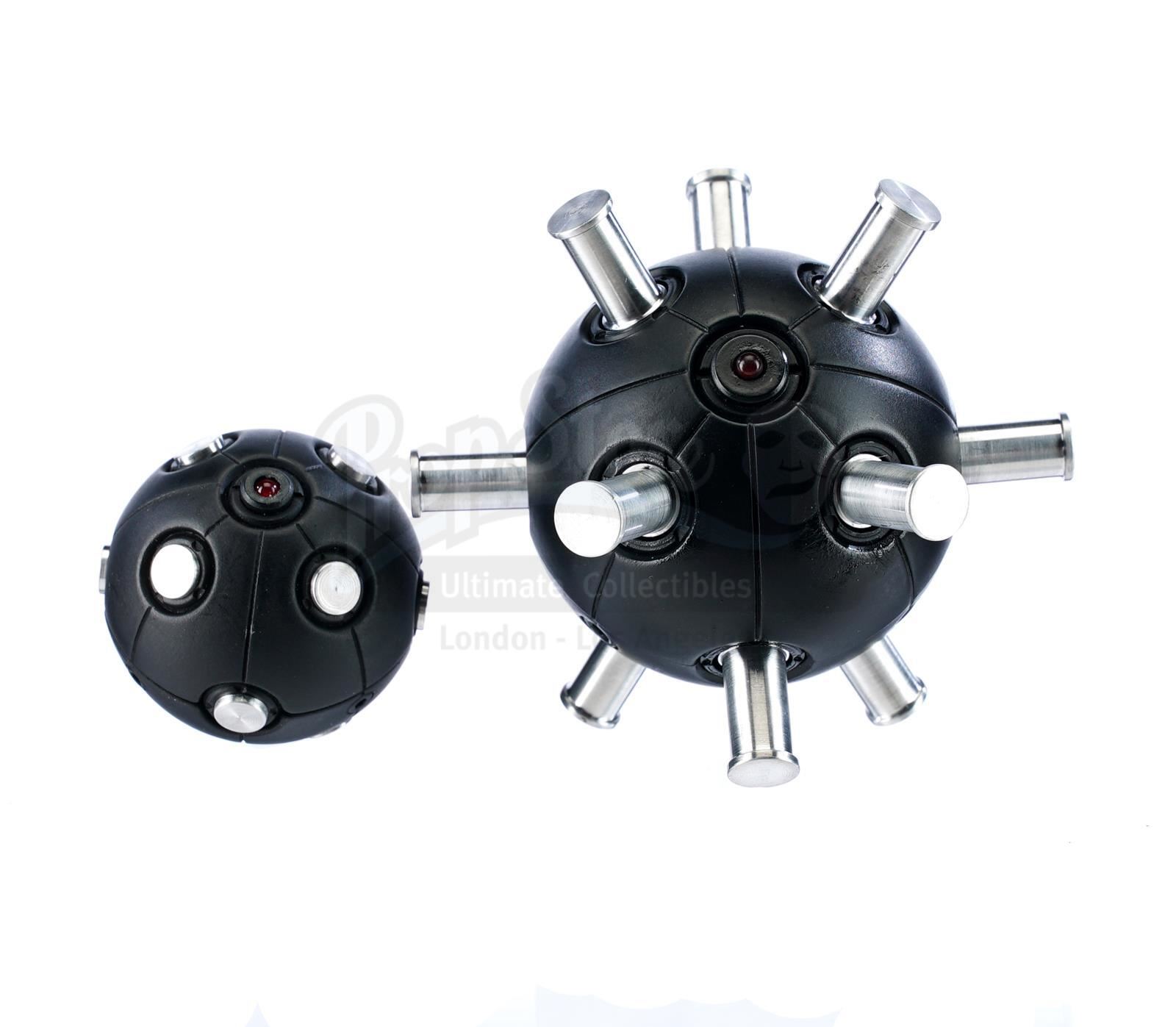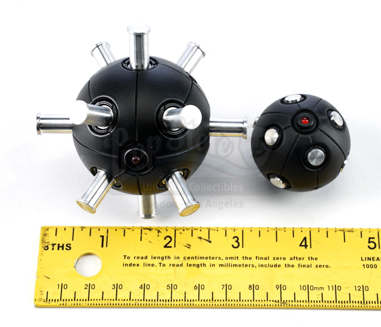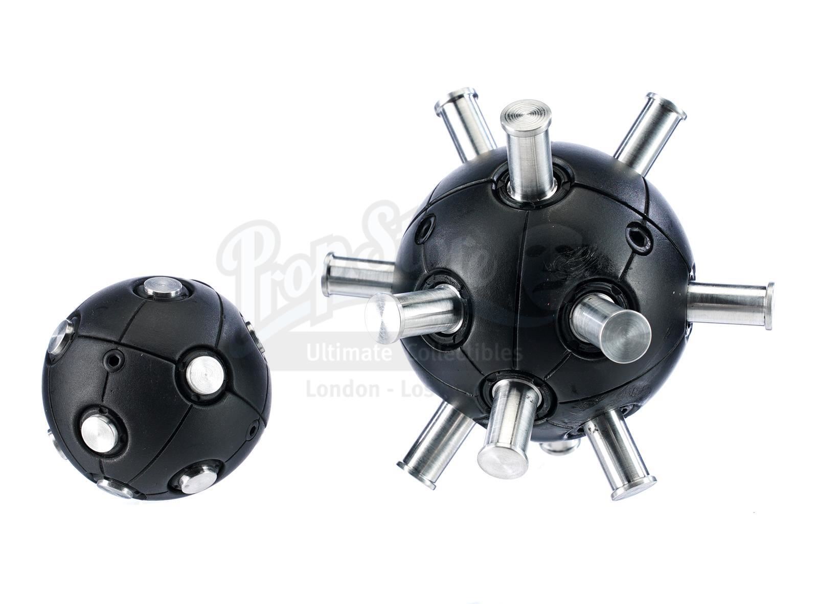 This lot will be auctioned on Tuesday, June 29th. The auction will begin at 9:00am PDT and lots are sold sequentially via live auctioneer; tune in to the live streaming broadcast on auction day to follow the pace. Note other lots in the auction may close on June 30th or July 1st. A pair of bat-bombs from Christopher Nolan's superhero origin film Batman Begins. Batman (Christian Bale) used high-tech bombs made by Wayne Industries to escape from Arkham Asylum. The bombs are constructed of paneled black resin with metal spikes and red plastic lenses. The larger bomb's spikes are extended, while the smaller's spikes are retracted. Both are in good overall condition with adhesive residue along the spikes' edges and scuffs from being rolled during production. Dimensions: 5" x 3" x 4" (12.75 cm x 7.75 cm x 10.25 cm) Estimate: $4,000 - 6,000