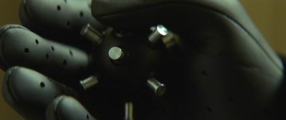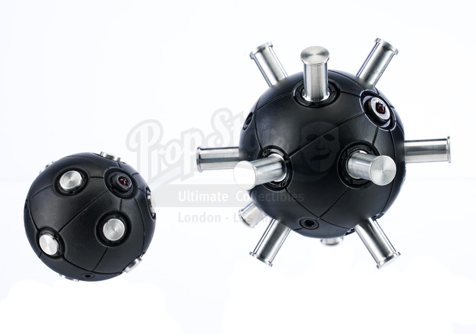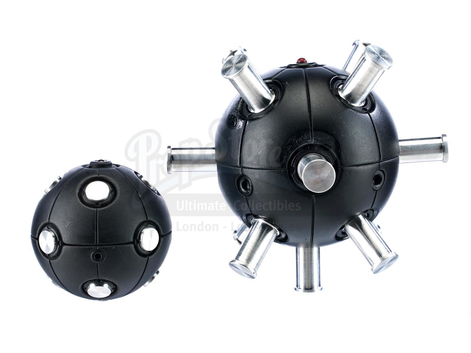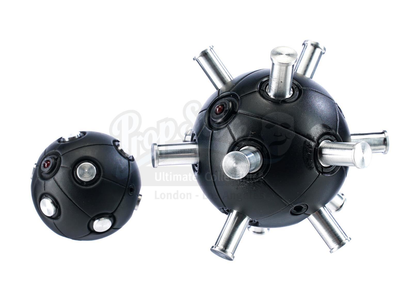This lot will be auctioned on Tuesday, June 29th. The auction will begin at 9:00am PDT and lots are sold sequentially via live auctioneer; tune in to the live streaming broadcast on auction day to follow the pace. Note other lots in the auction may close on June 30th or July 1st. A pair of bat-bombs from Christopher Nolan's superhero origin film Batman Begins. Batman (Christian Bale) used high-tech bombs made by Wayne Industries to escape from Arkham Asylum. The bombs are constructed of paneled black resin with metal spikes and red plastic lenses. The larger bomb's spikes are extended, while the smaller's spikes are retracted. Both are in good overall condition with adhesive residue along the spikes' edges and scuffs from being rolled during production. Dimensions: 5" x 3" x 4" (12.75 cm x 7.75 cm x 10.25 cm) Estimate: $4,000 - 6,000