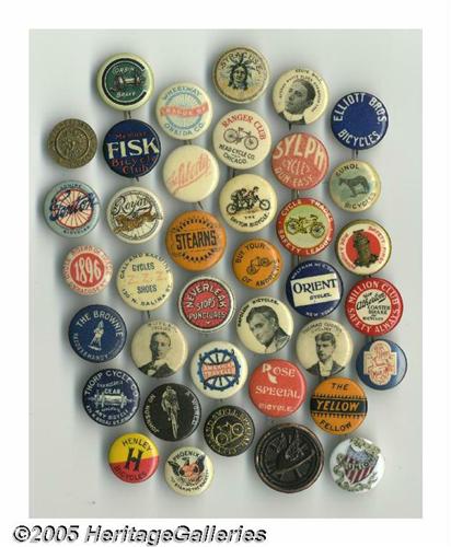 <B>Lot 38 Bicycle-related Pinbacks and Lapel Studs c.1890s</B></I> 1896 found America in the midst of a bicycle craze; there were over 150 bicycle factories in the United States producing over 1,000 different makes of bicycles. Offered here is an awesome grouping of 20 pinbacks and 18 lapel studs all advertising bicycle brands, part, sellers, cyclists and all things related to bicycles. Most of these colorful celluloid items are from that 1890s craze period and shortly thereafter. Brands advertised include: Sylph Cycles, Fisk Bicycle Club, Morrow, Phoenix, Sunol, Atherton, Ranger Club, the Liberty, American Traveler, Orient Cycles, Thomas Cooper, Royal and the Dayton Bicycle. These range in size from .75" to 1" in diameter and are in generally very fine condition. An instant collection! Lot:253