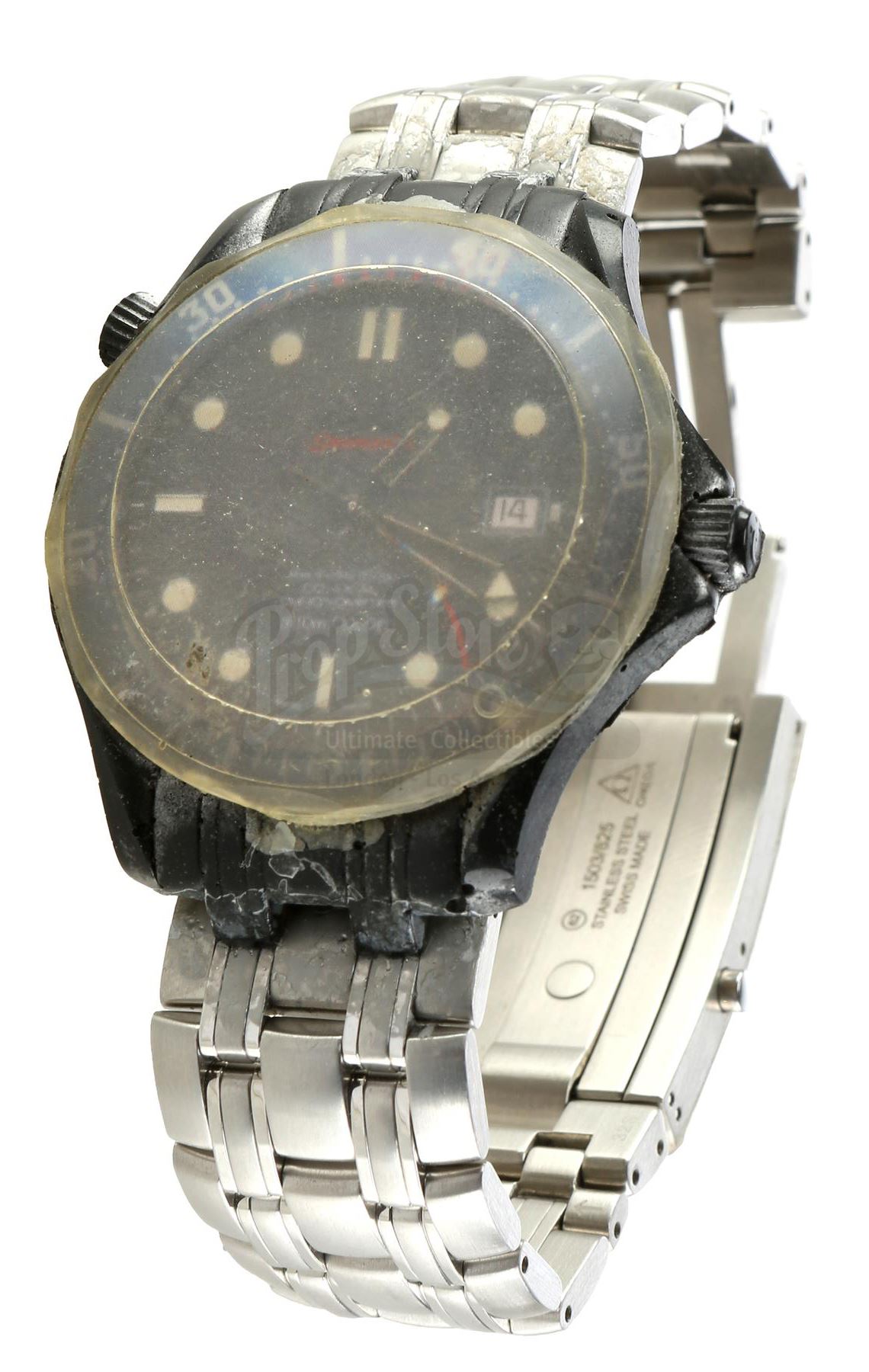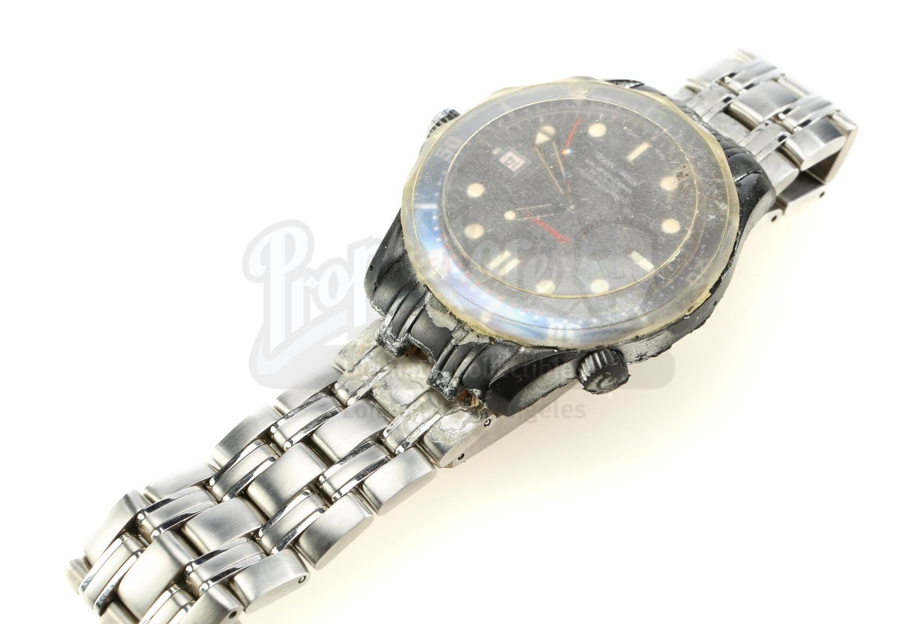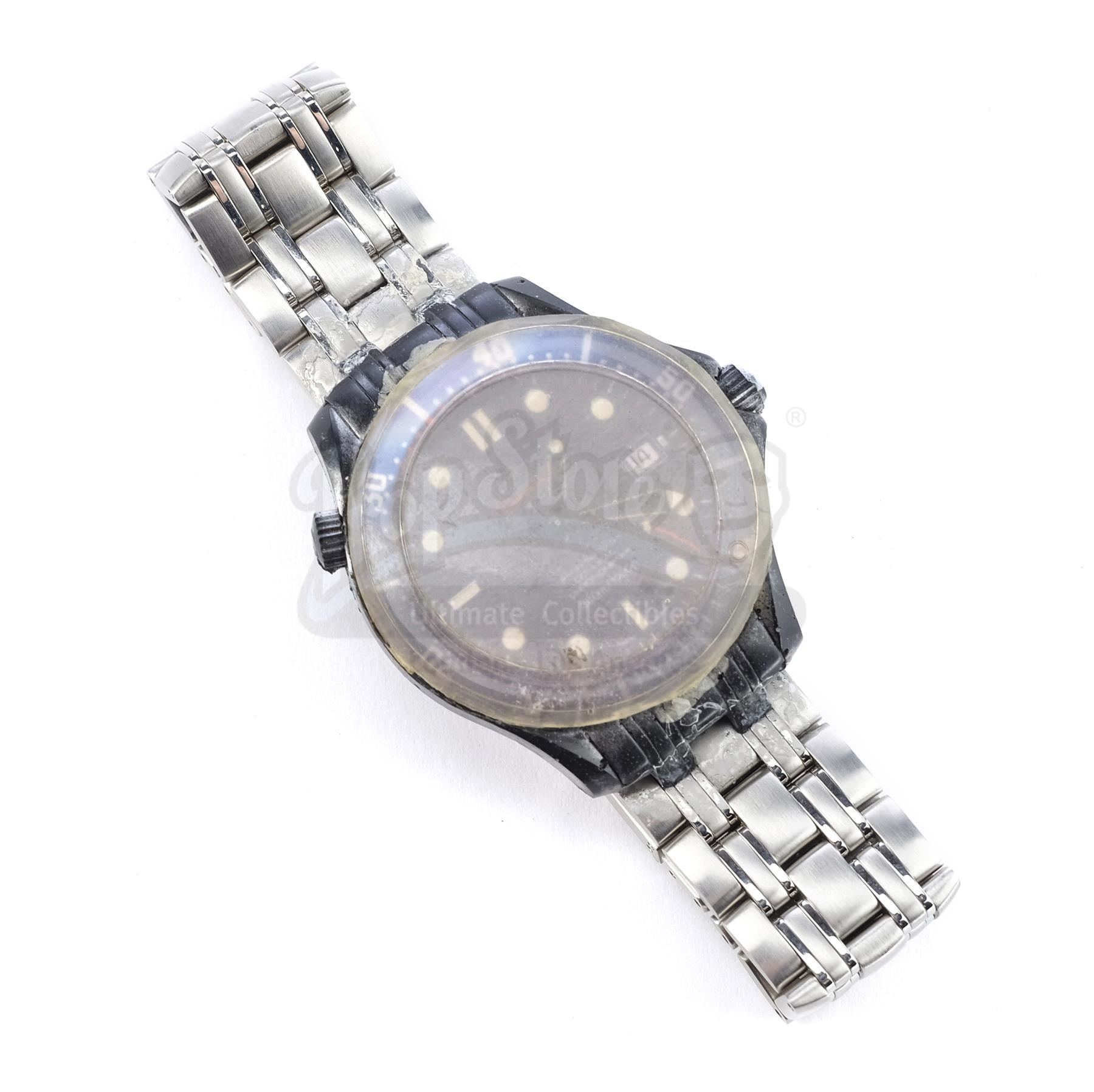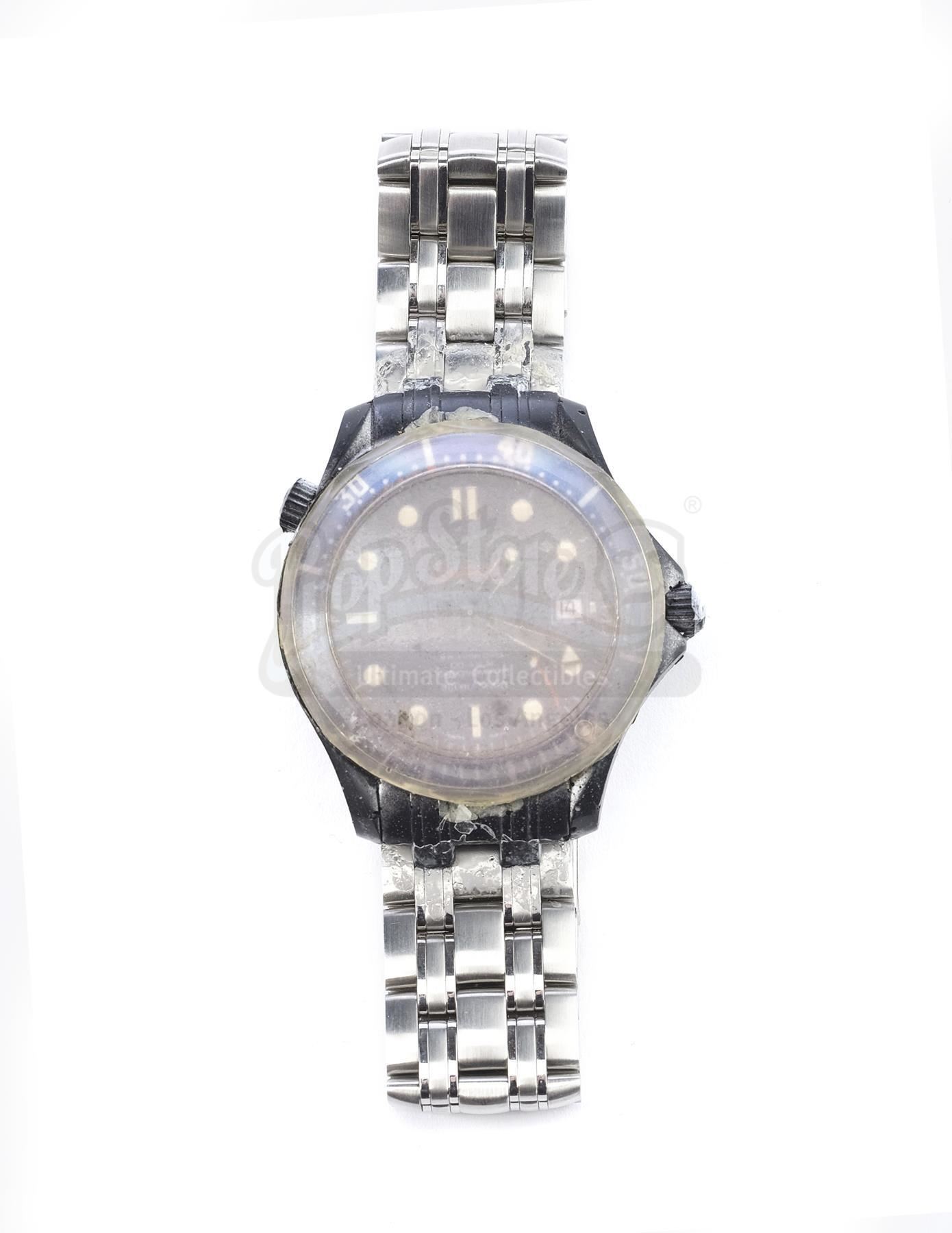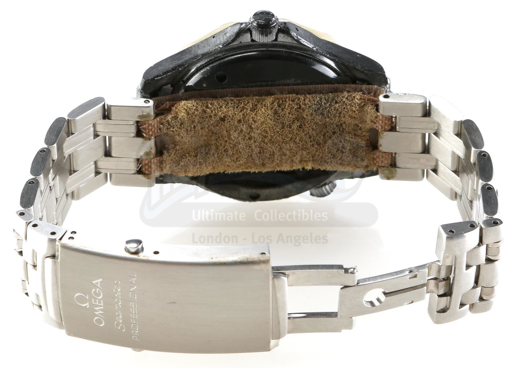 This lot consists of a stunt watch with a clear rubber face with printed decals underneath that was specifically created for actor safety, a rubber body painted dark metallic gray to appear metallic, and a silvertone metal Omega Seamaster wristband. Include is a black wooden display frame with a decorative backing board. The watch and display are in good overall condition with minor discoloration to the clear rubber of the watch and some scuffs to the wooden frame.
