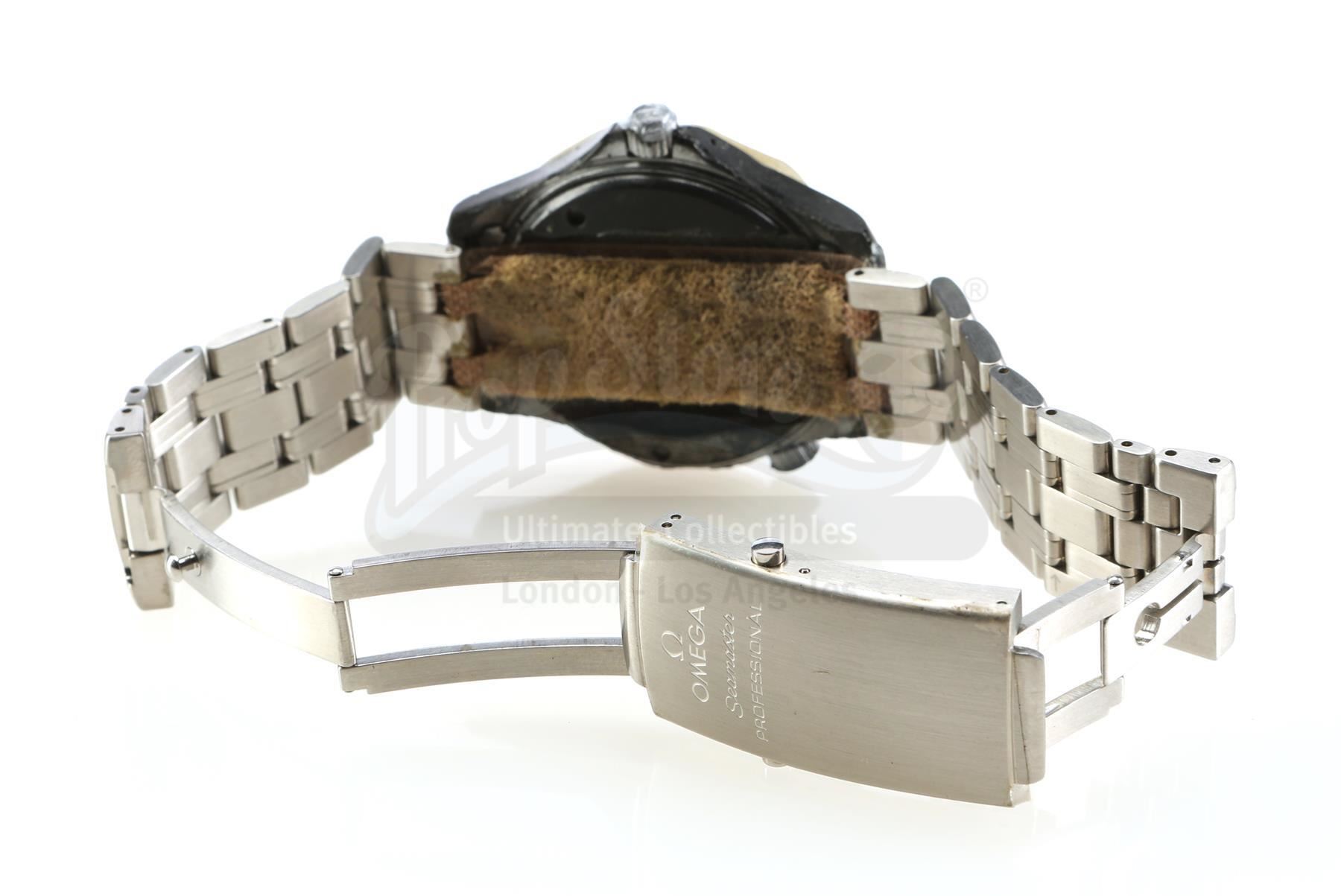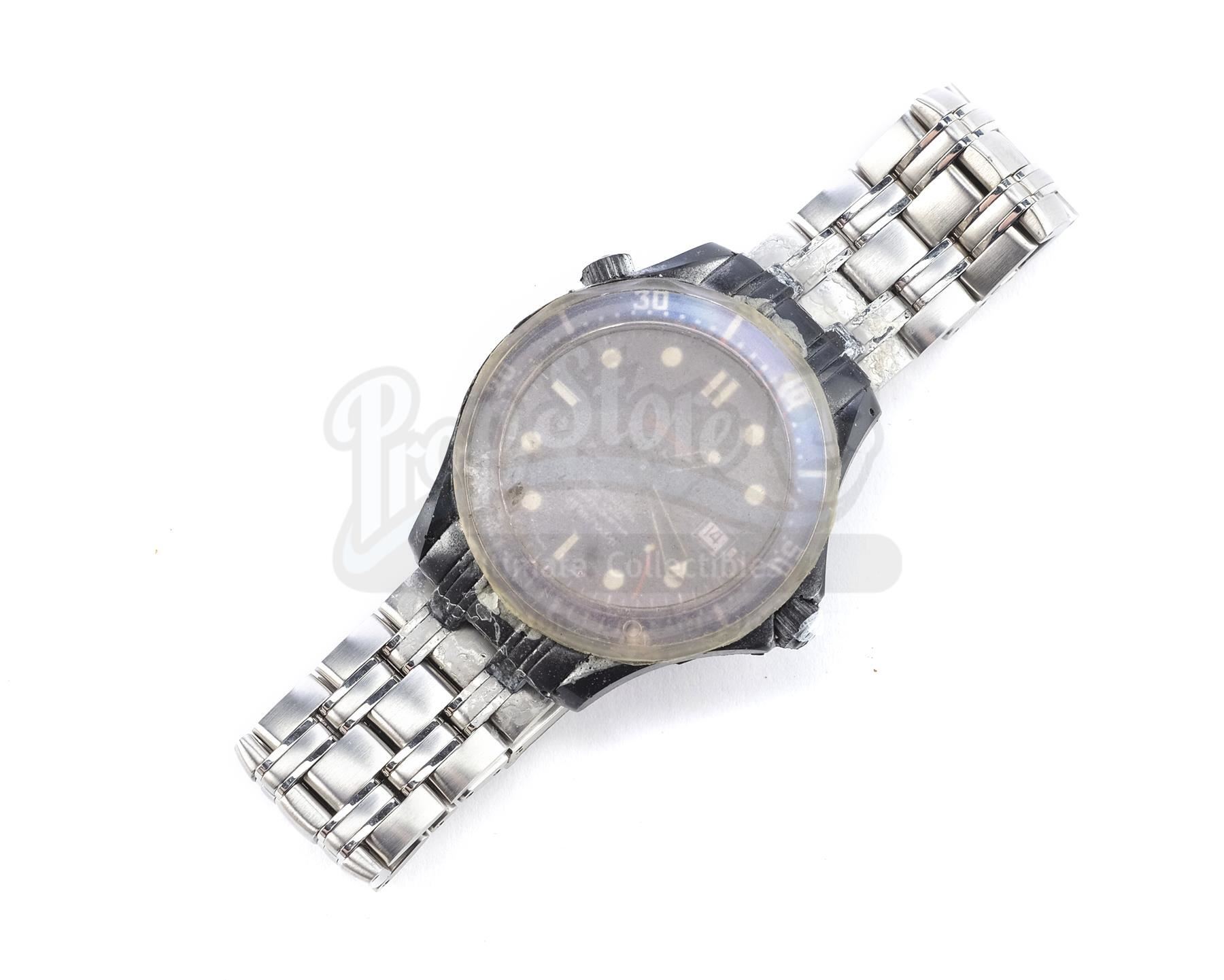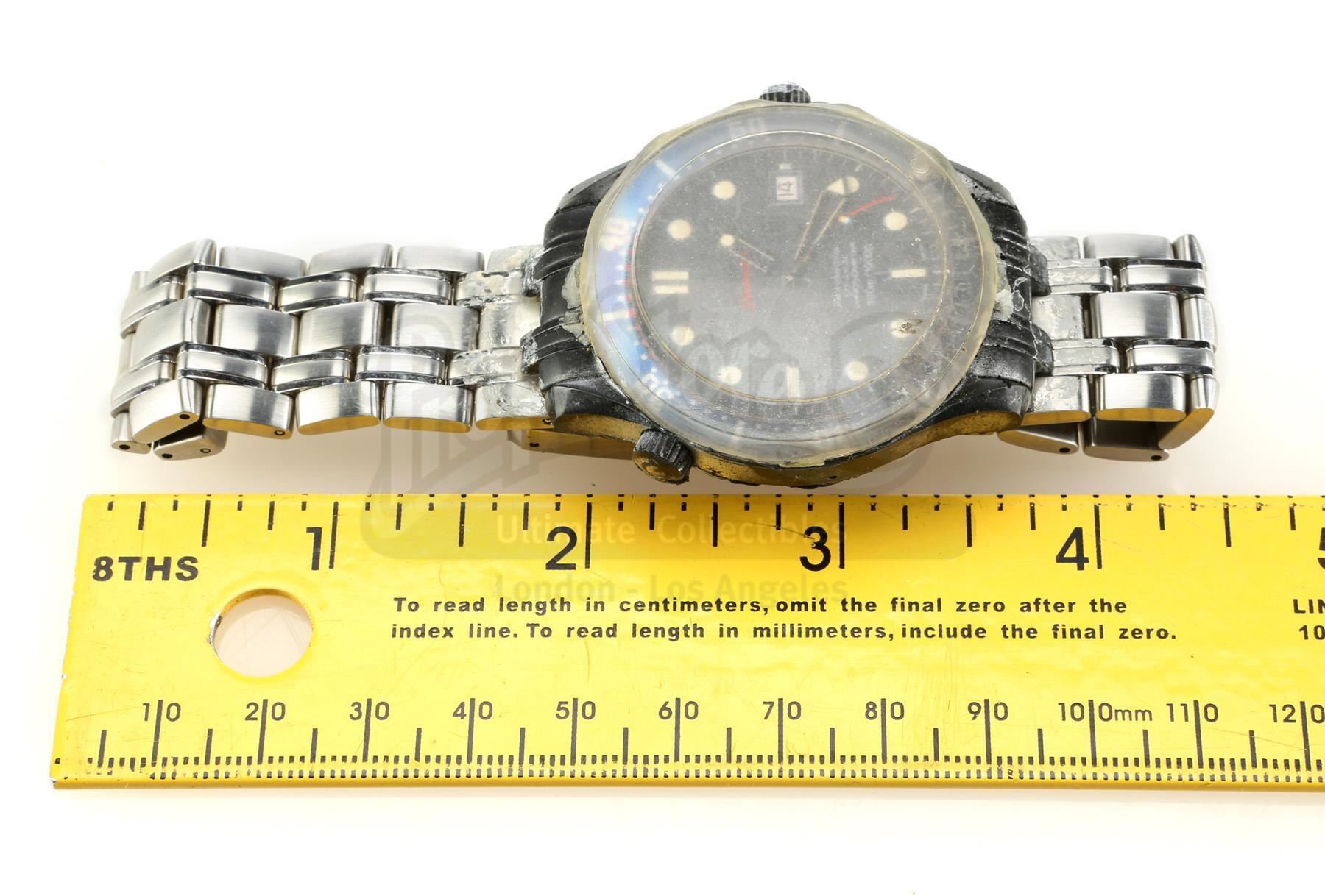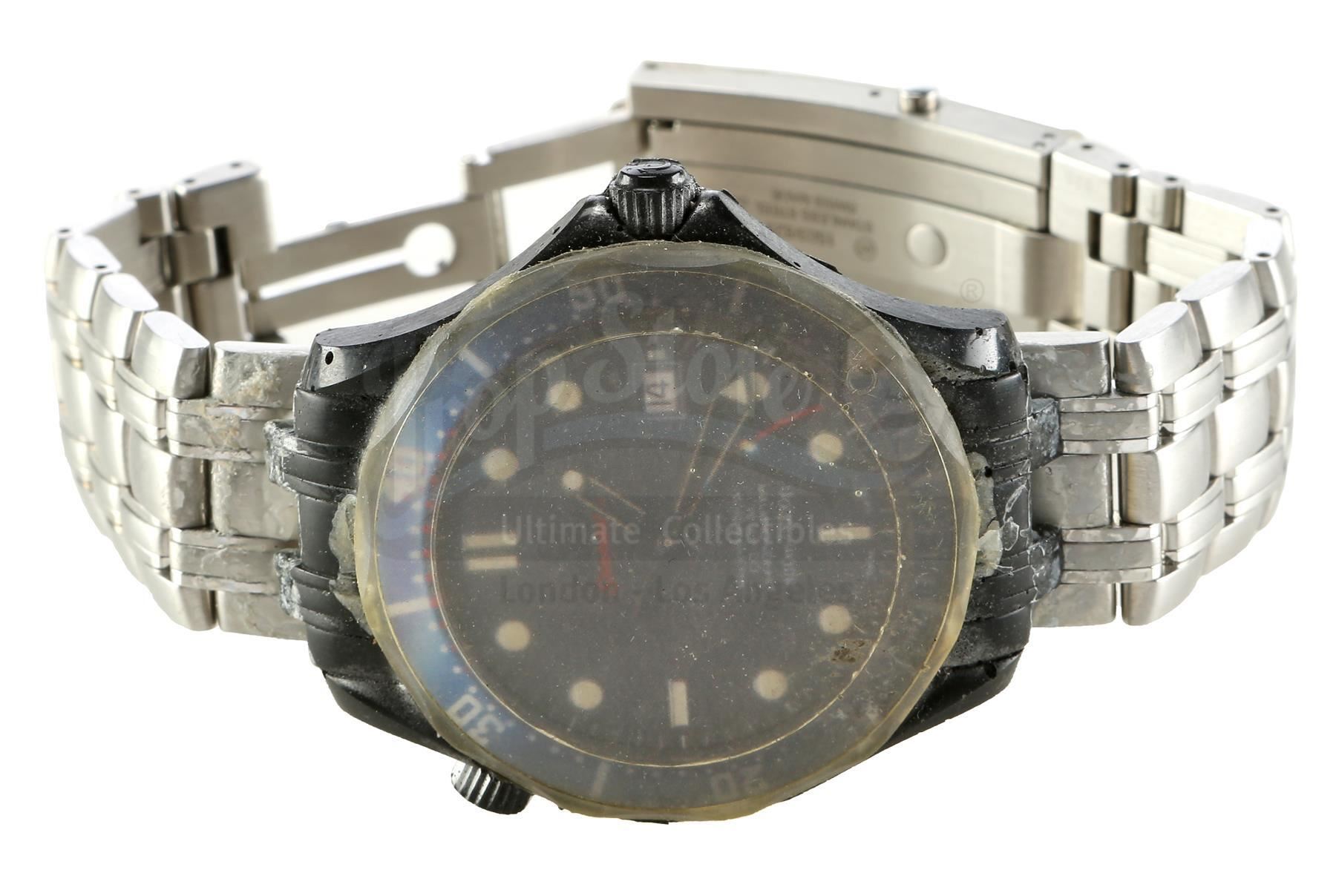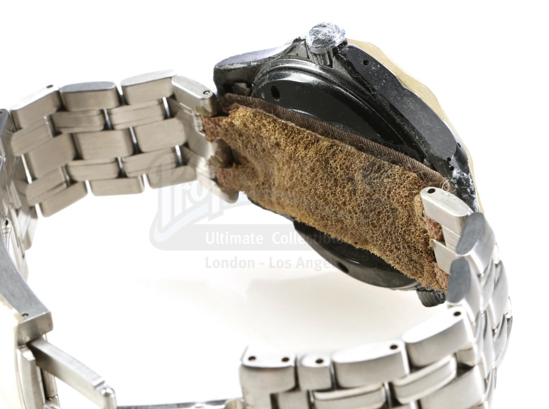 This lot consists of a stunt watch with a clear rubber face with printed decals underneath that was specifically created for actor safety, a rubber body painted dark metallic gray to appear metallic, and a silvertone metal Omega Seamaster wristband. Include is a black wooden display frame with a decorative backing board. The watch and display are in good overall condition with minor discoloration to the clear rubber of the watch and some scuffs to the wooden frame.