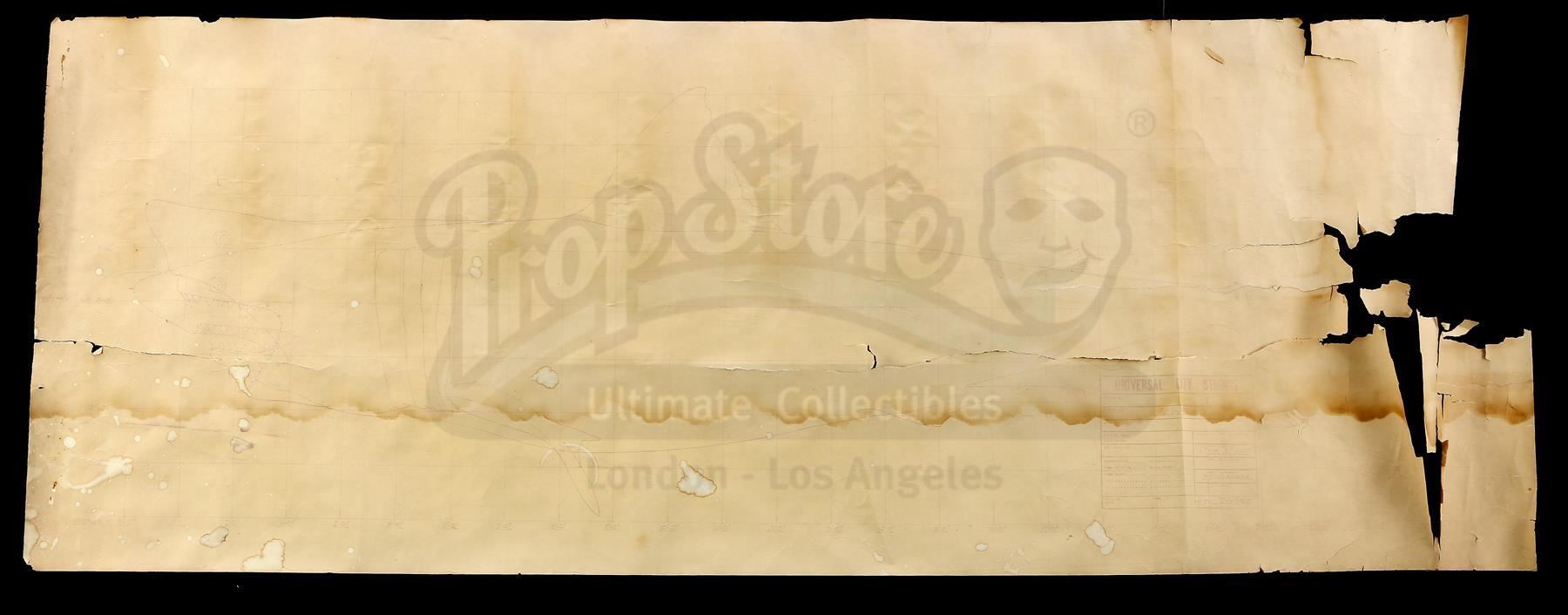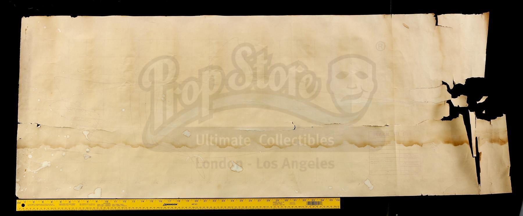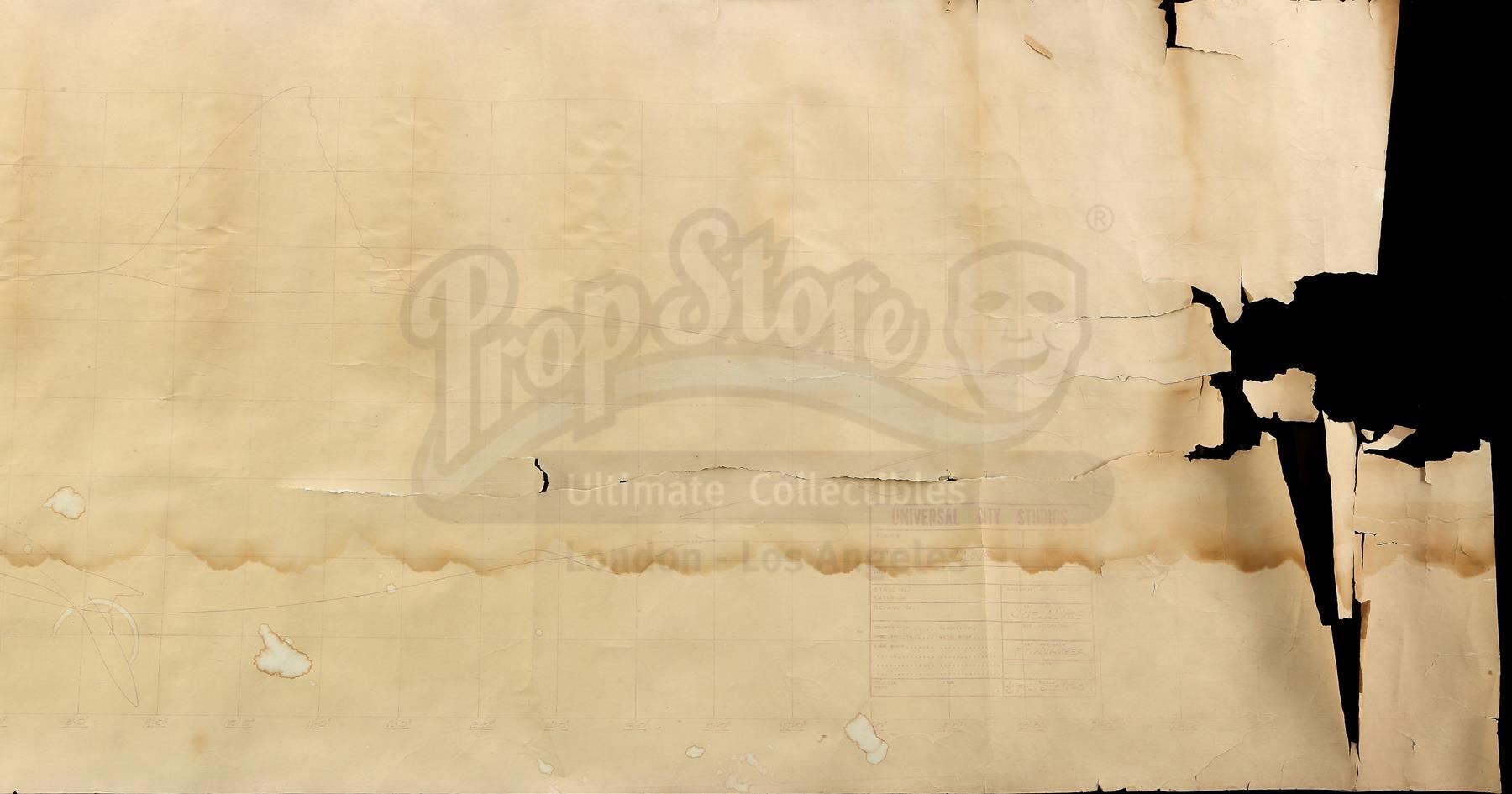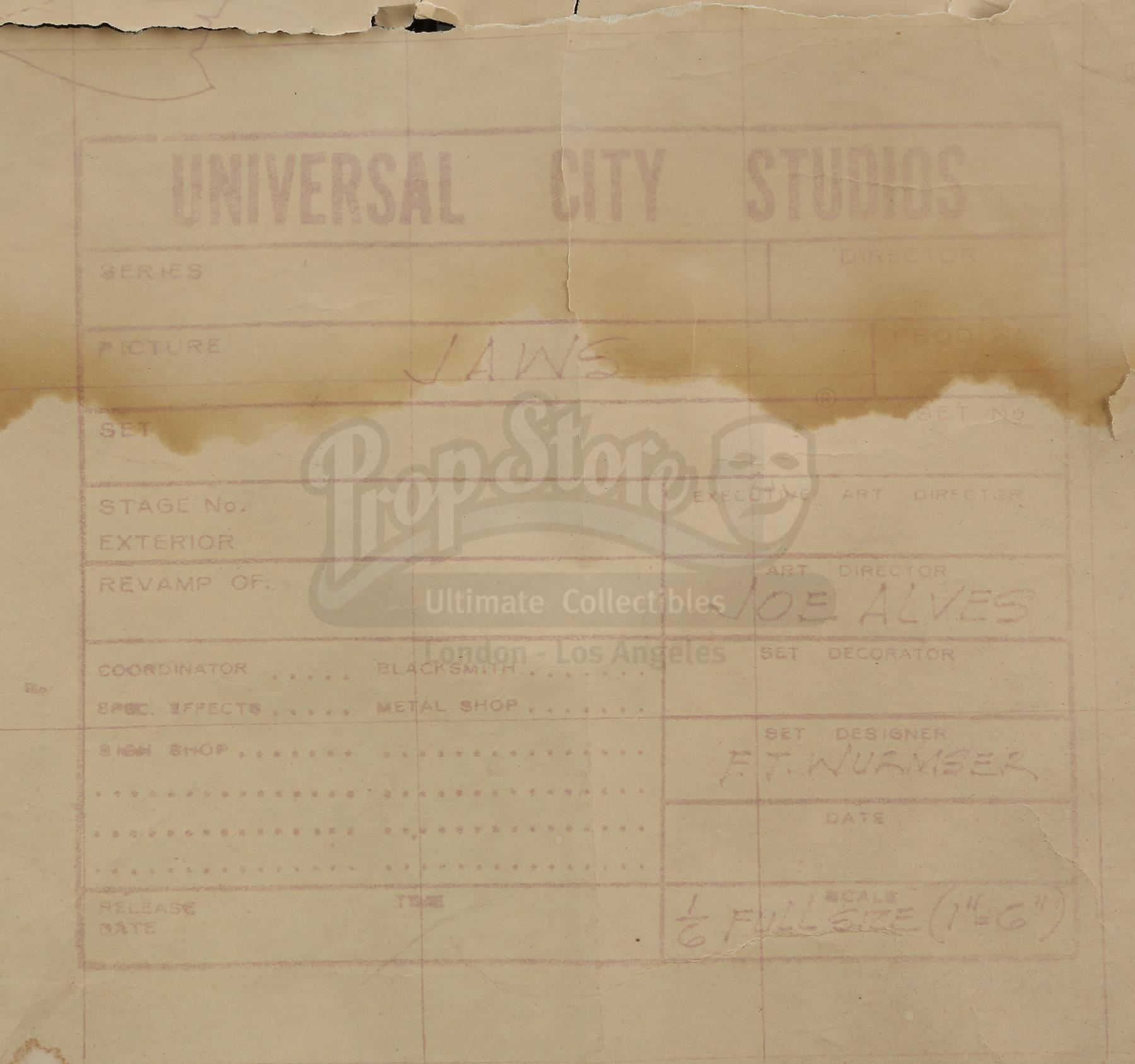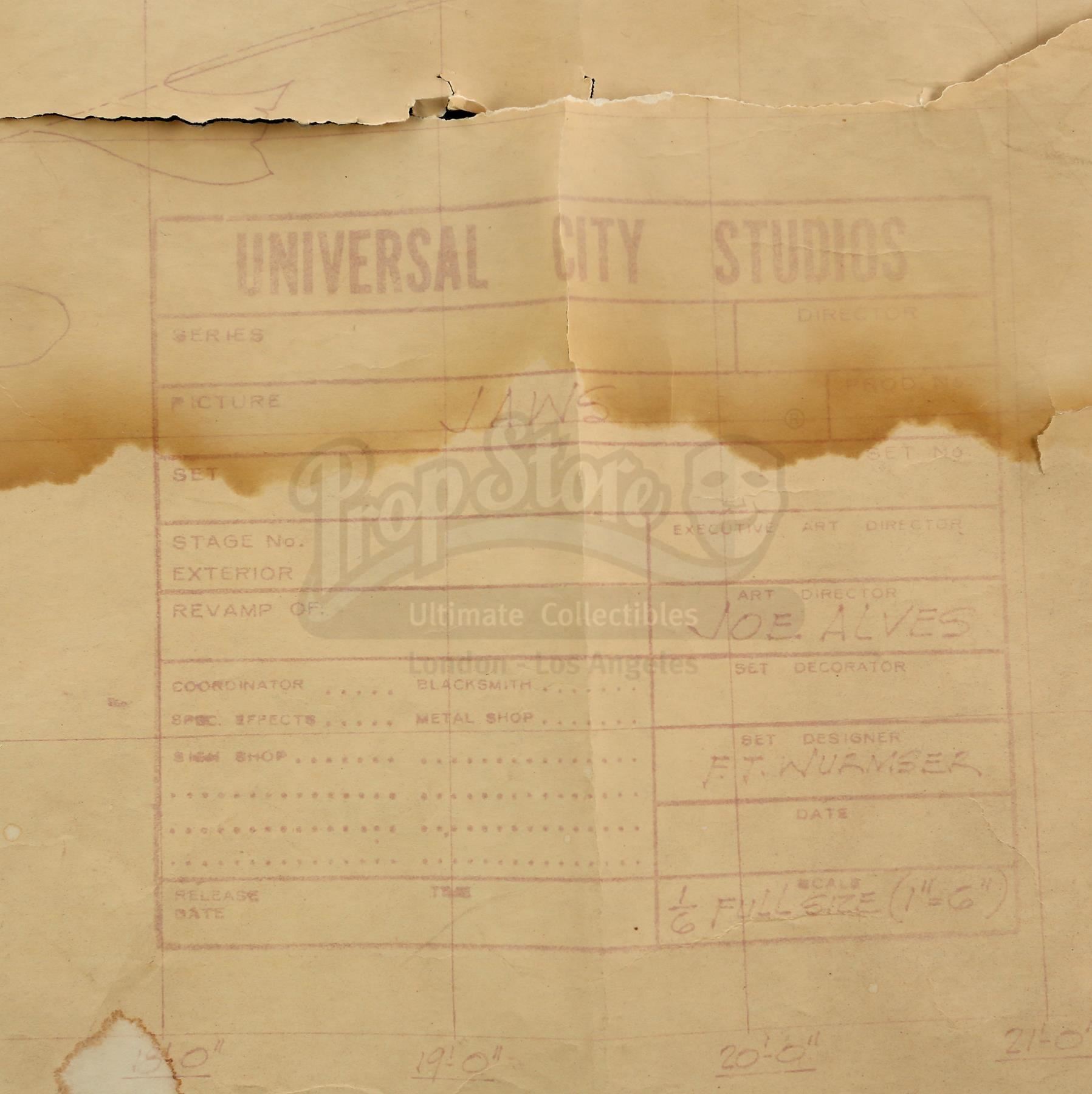The blueprint features the film's title and lists the art director as Joe Alves and set designer as F.T. Wurmser. The print also notes the scale as "1/6 Full Size." The piece features the print of a hand-drawn great white shark that measures over 19 feet, according to the measurement scale at the bottom of the page. The blueprint is torn and shows signs of discoloration, from both production use and age, and remains in fair and fragile condition. Dimensions: 20 3/4" x 55" (30 cm x 24 cm x 1 cm)