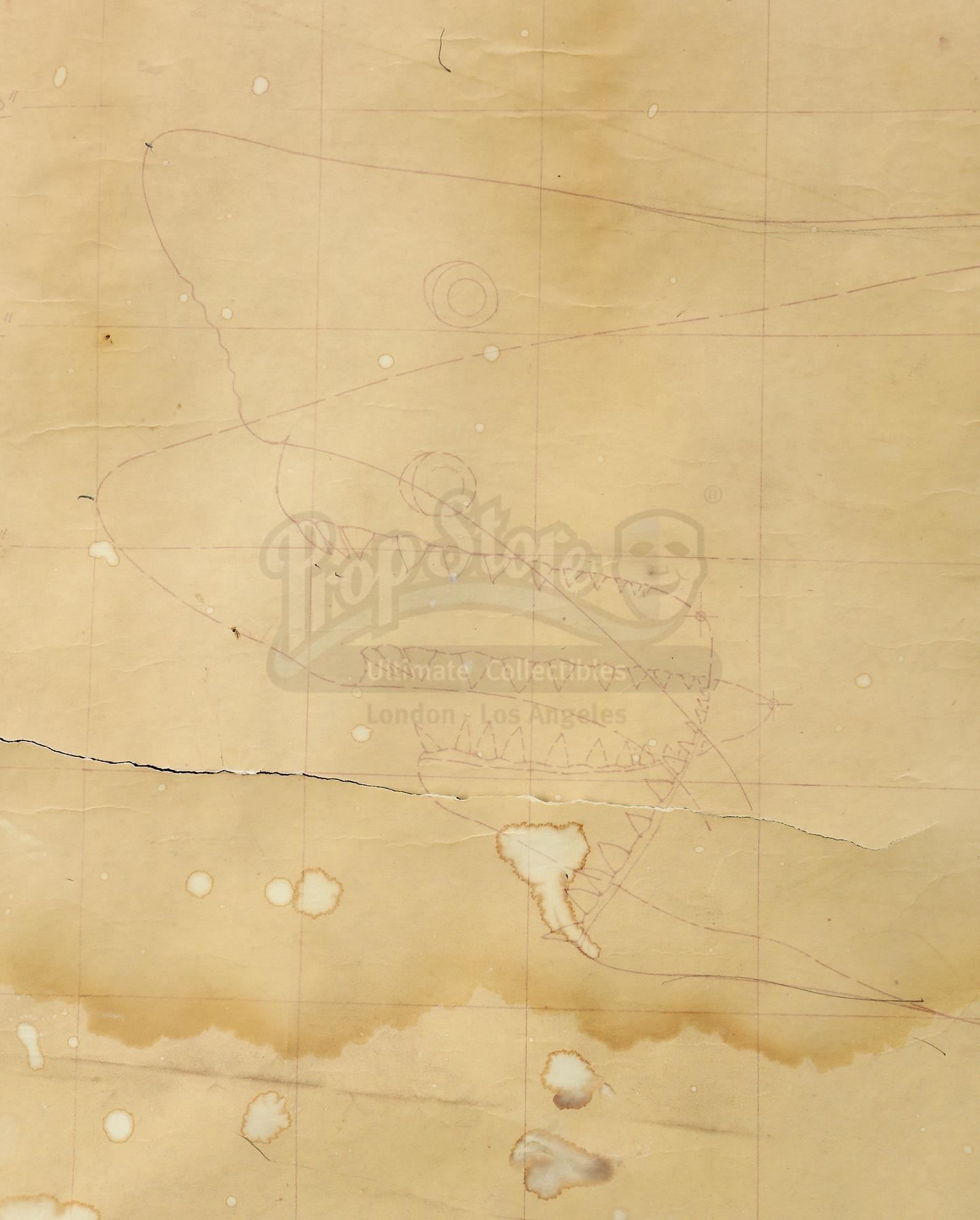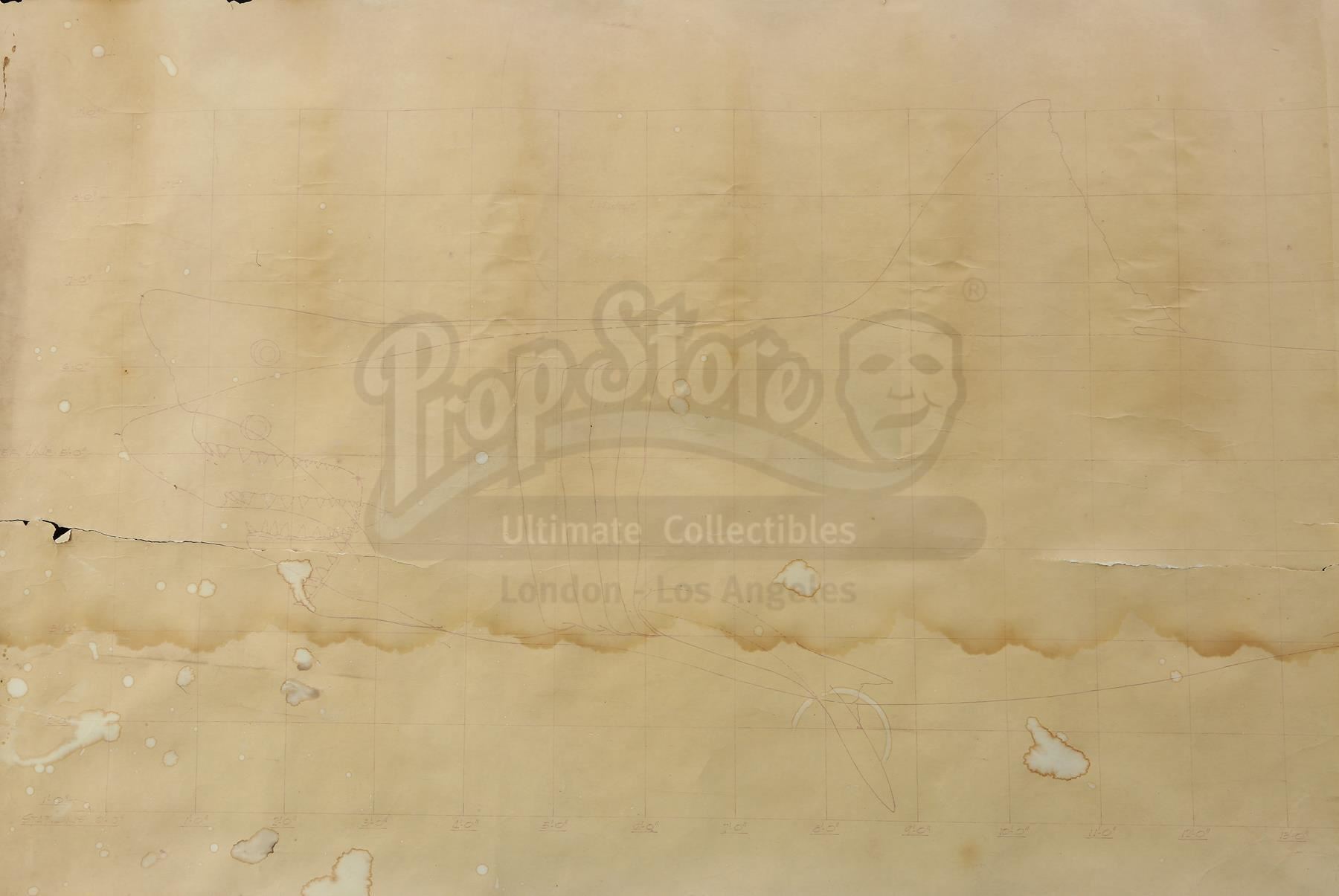 A Bruce the Shark blueprint from the production of Steven Spielberg's shark thriller Jaws. The blueprint originates from the early production stages of conceptualizing the infamous man-eating shark.
