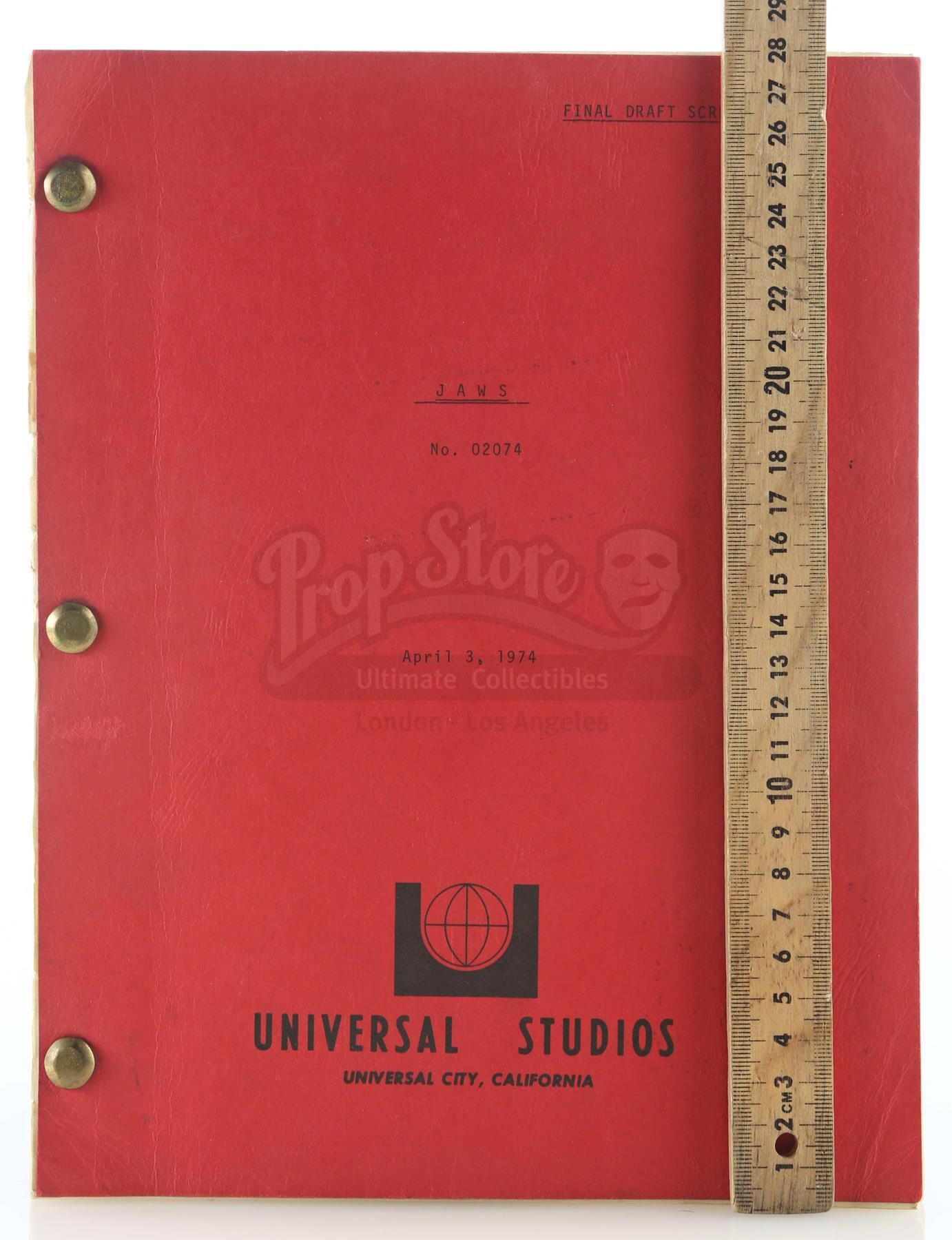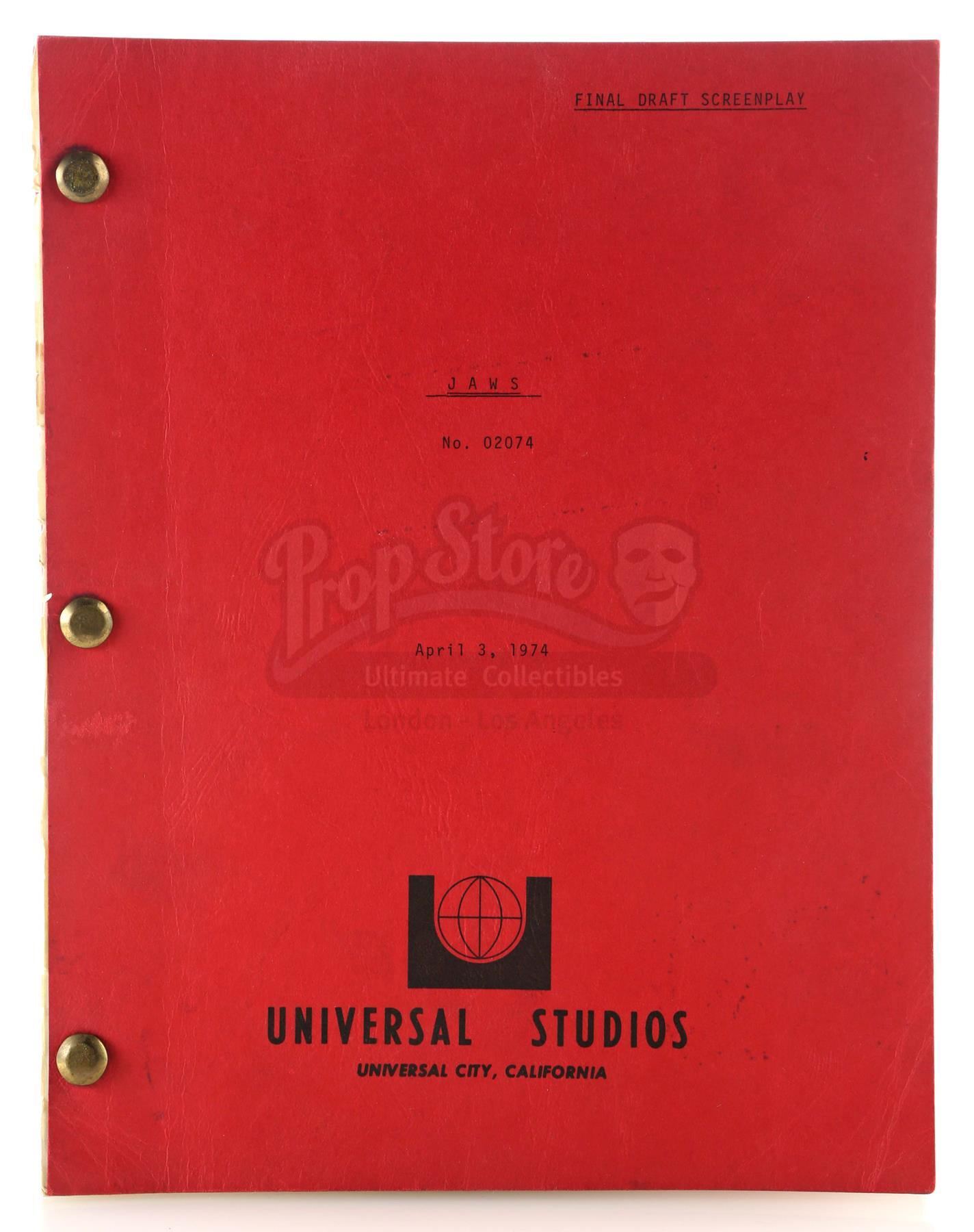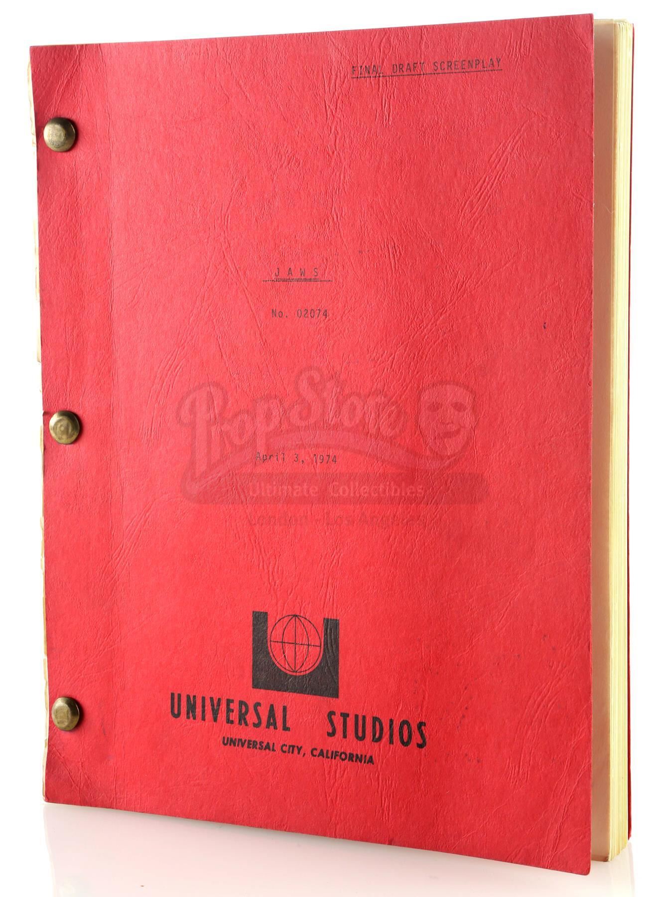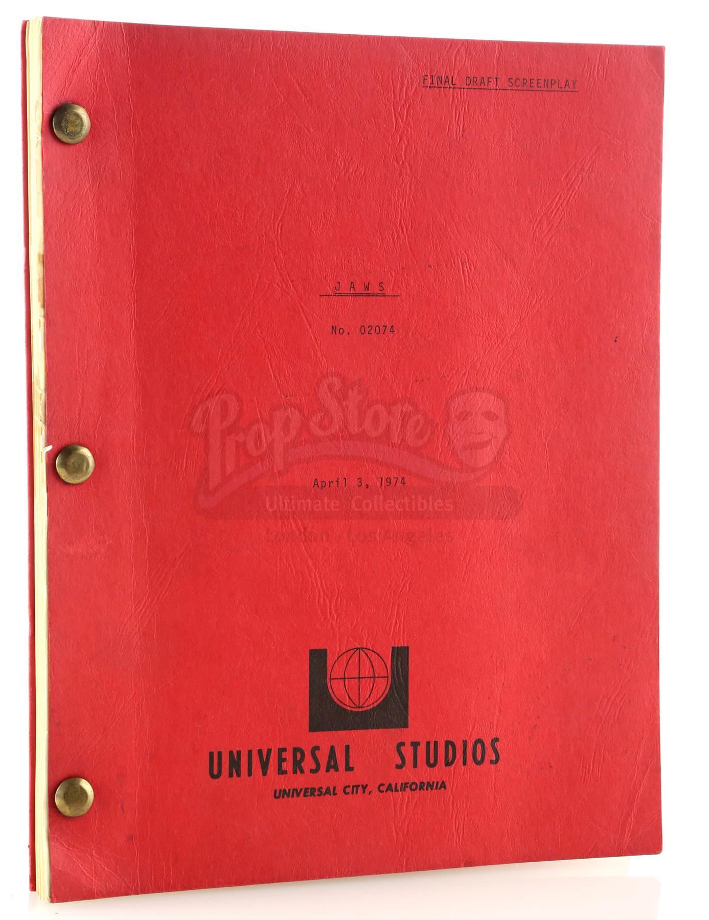 A final draft script from the production of Steven Spielberg's shark thriller Jaws. This unnumbered, 113-page typewritten draft, written by Jaws novelist Peter Benchley for producers Richard Zanuck and David Brown, features a Universal Studios logo printed on the front of a red paper cover labeled "Final Draft Screenplay JAWS No. 02074" and dated "April 3, 1974". The first page is marked "5267" in black ink. The script is held together with brass brads. It is in good overall condition with some wear from age and use, including staining and creasing. Dimensions: 11 1/2" x 9" x 1" (29.25 cm x 23 cm x 2.5 cm)