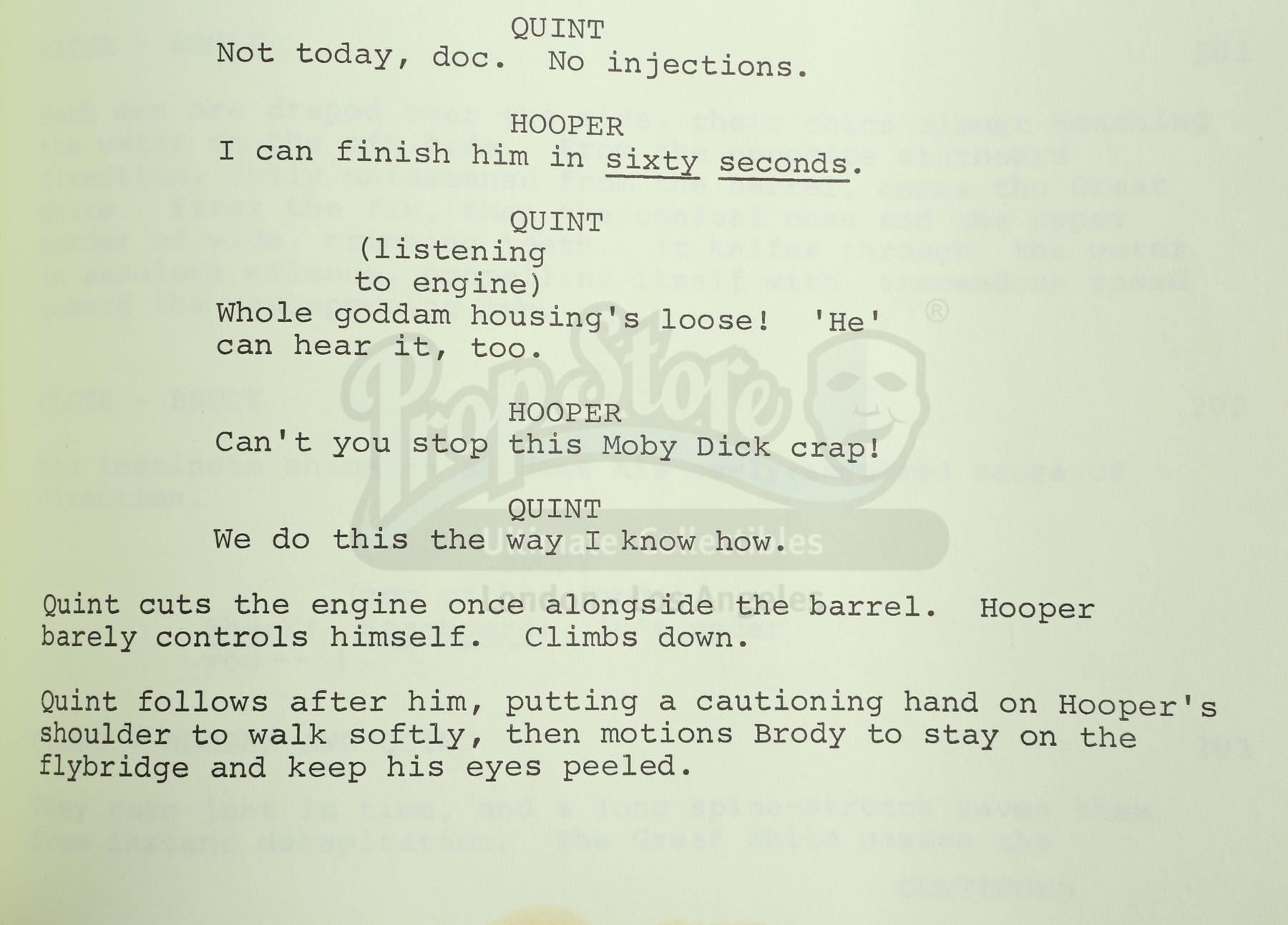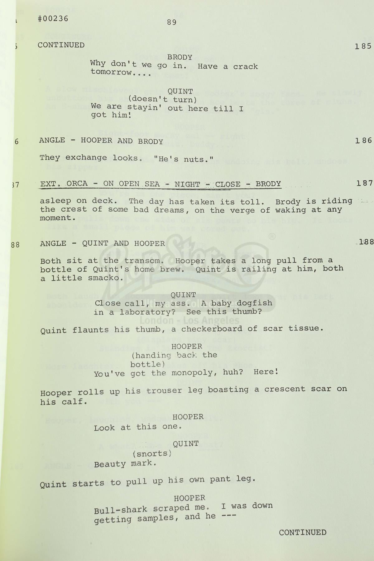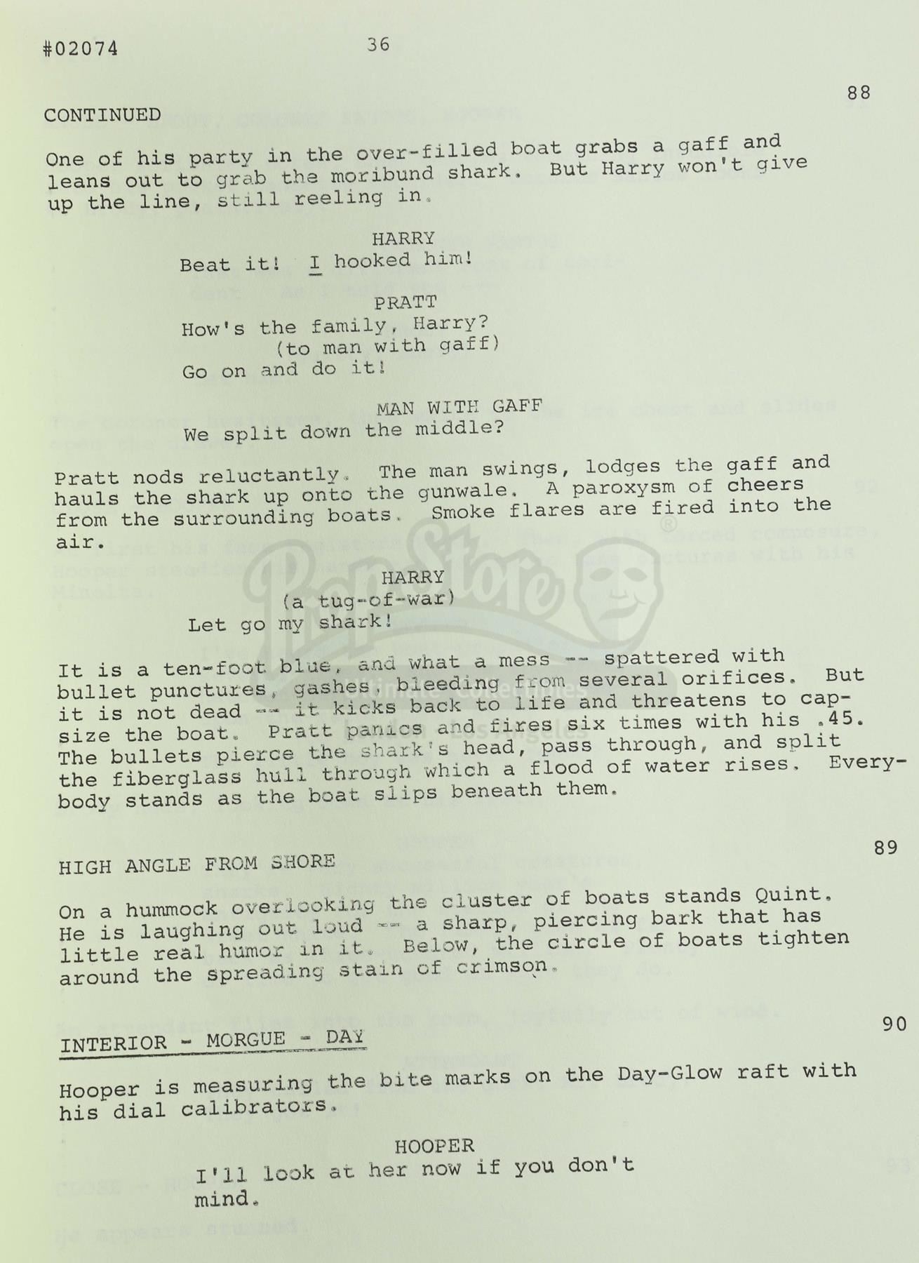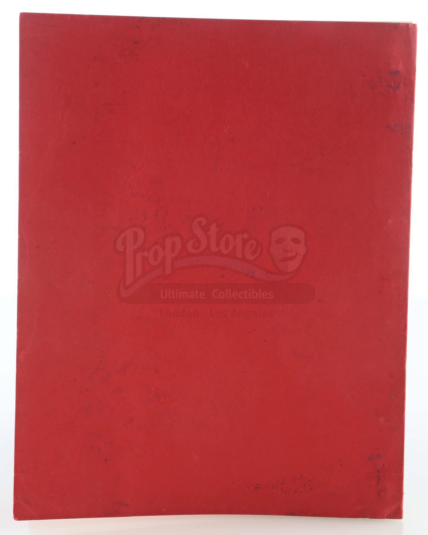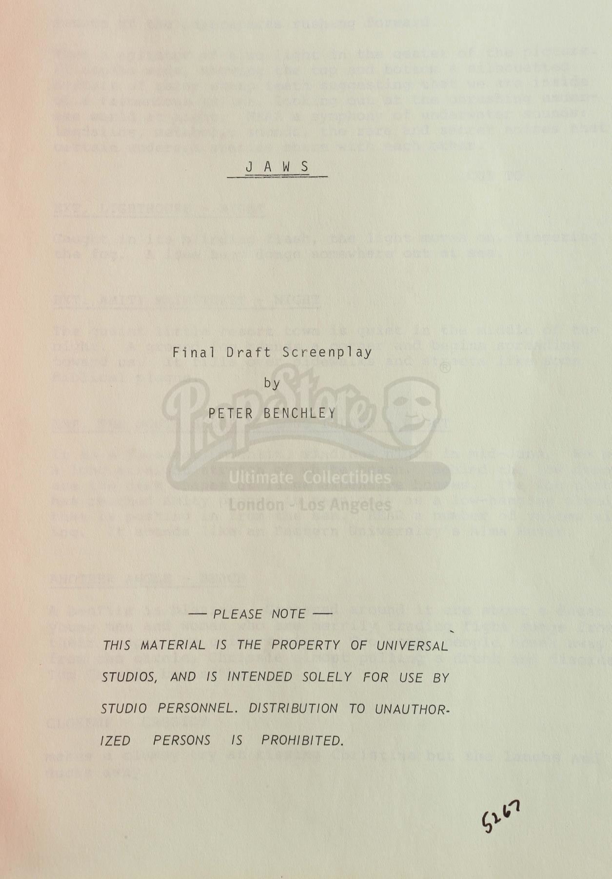 A final draft script from the production of Steven Spielberg's shark thriller Jaws. This unnumbered, 113-page typewritten draft, written by Jaws novelist Peter Benchley for producers Richard Zanuck and David Brown, features a Universal Studios logo printed on the front of a red paper cover labeled "Final Draft Screenplay JAWS No. 02074" and dated "April 3, 1974". The first page is marked "5267" in black ink. The script is held together with brass brads. It is in good overall condition with some wear from age and use, including staining and creasing. Dimensions: 11 1/2" x 9" x 1" (29.25 cm x 23 cm x 2.5 cm)