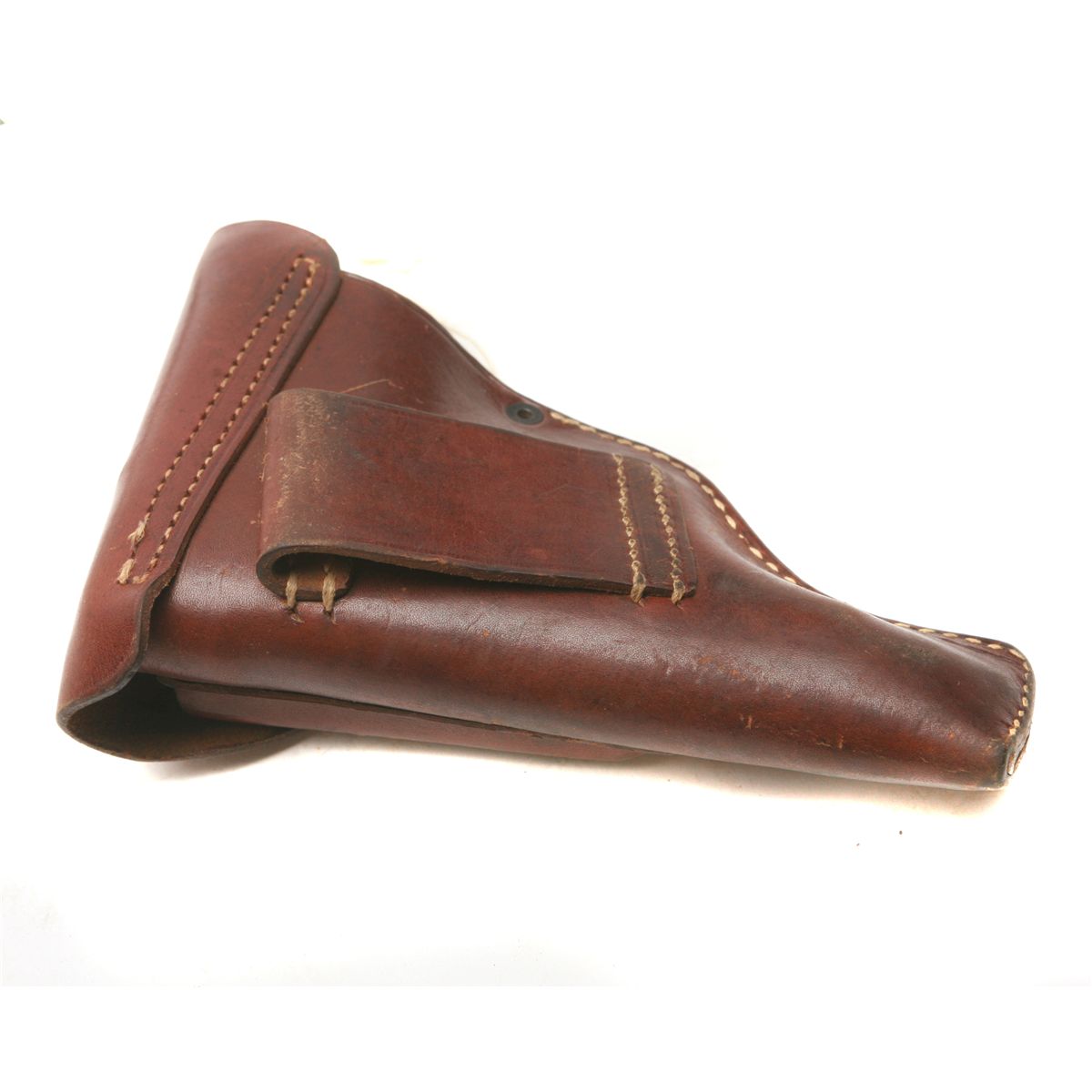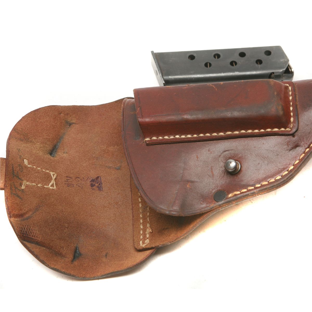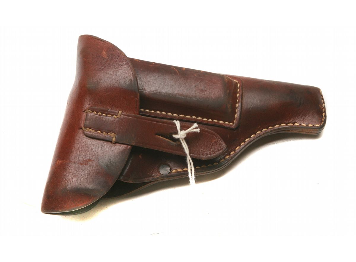 Russett leather flap holster with mag pocket - inner flap penciled R. Foss and ink stamped dtv/42 (C. Otto Gehrckens, Leder- u. Riemenwerke, Pinneberg) & upside-down WaA - some wear/discoloration - stitching/strap intact - blued mag marked Walther banner PP 7.65 m/m - non-ffl - 25CRRMA057