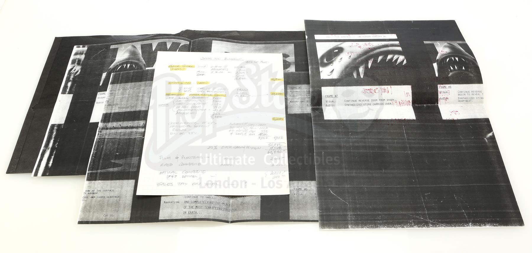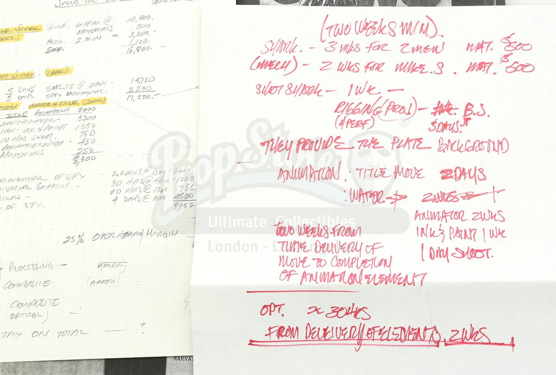 The production notes consist of a list of costs to provide FX photography for the film, a handwritten packet of FX costs and build schedule, and one page of handwritten notes on one of three photocopied storyboard pages. The lot has minor tears from production use and age, but it remains in great overall condition. Dimensions (each): 11 3/4" x 9 1/2" (30 cm x 24 cm)