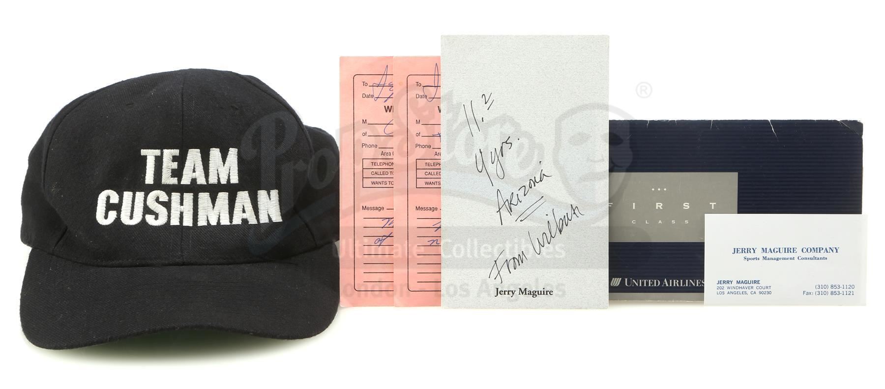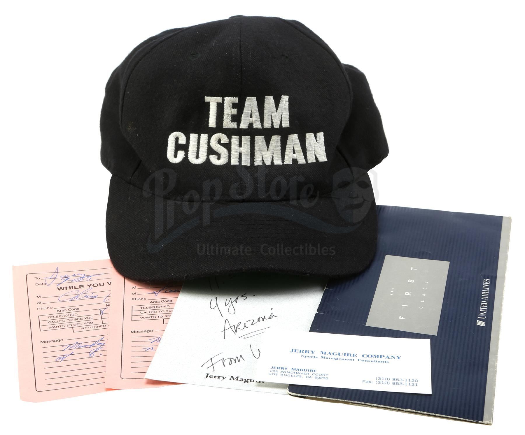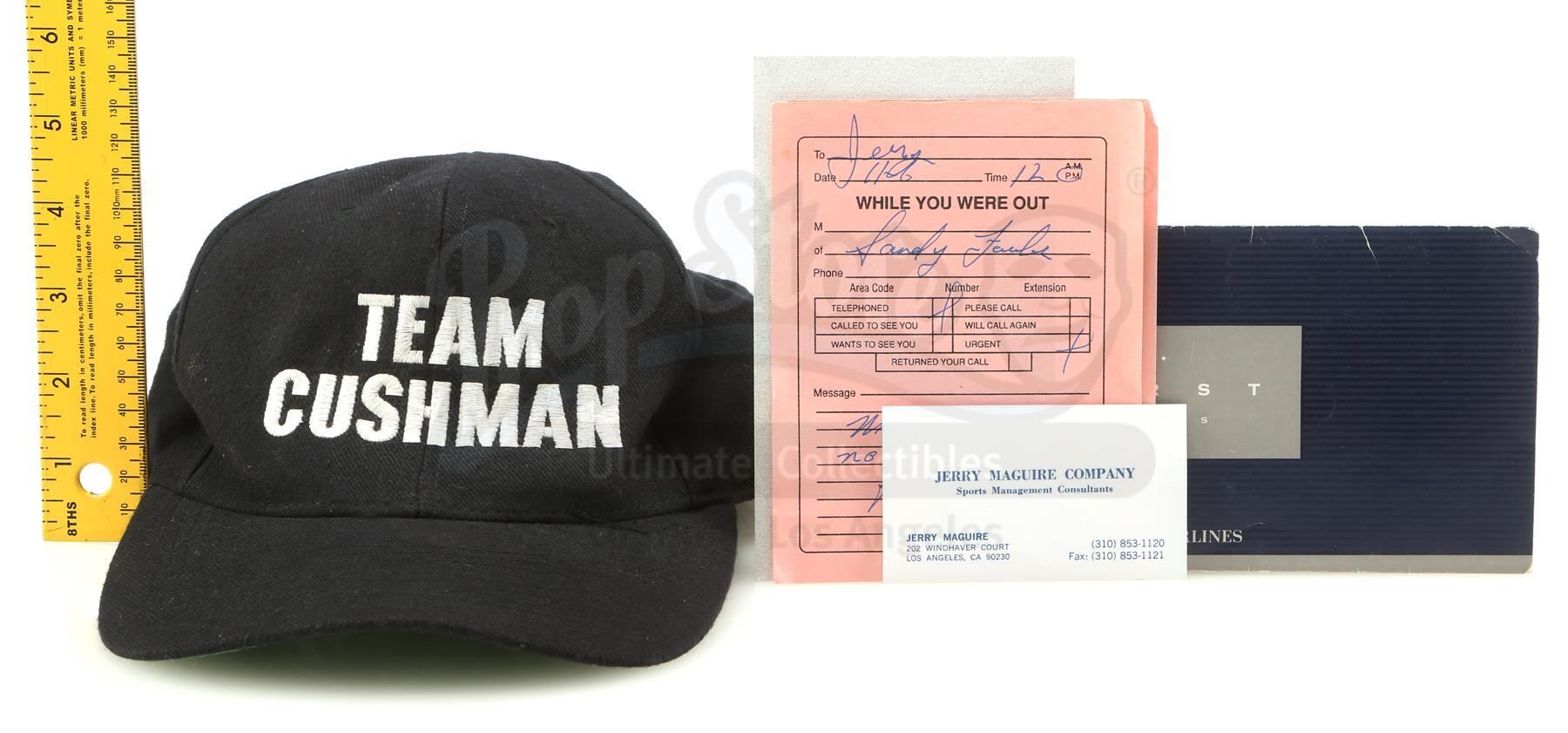 A "Team Cushman" hat and accessories from Cameron Crowe's romance drama Jerry Maguire. After being fired by his company, sports agent Maguire (Tom Cruise) attended the NFL draft in Miami with his final two football player clients, Frank Cushman (Jerry O'Connell) and Rod Tidwell (Cuba Gooding Jr.).