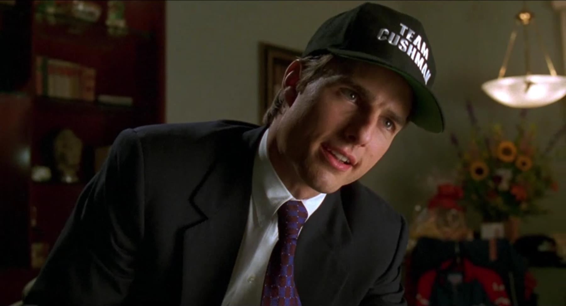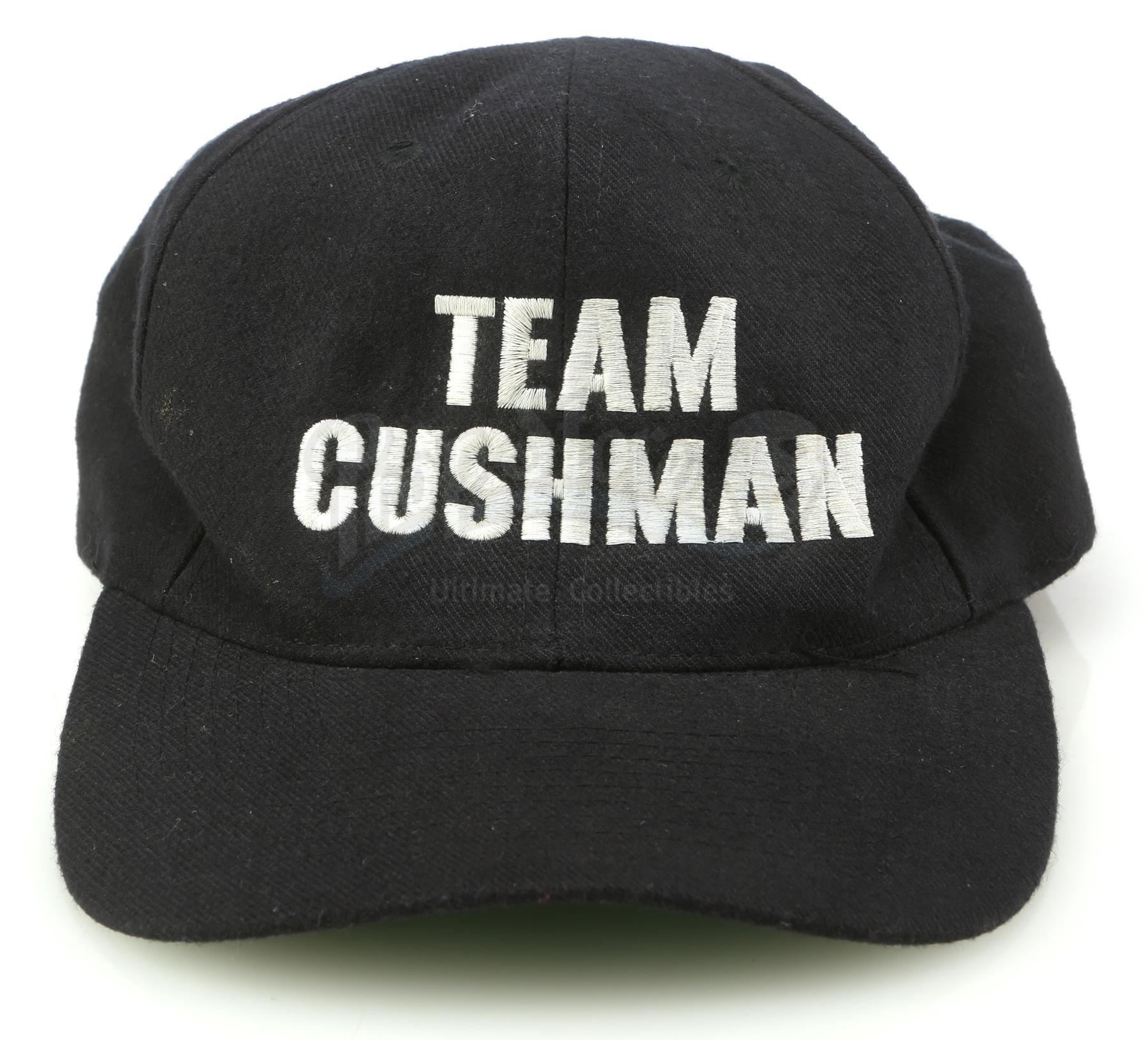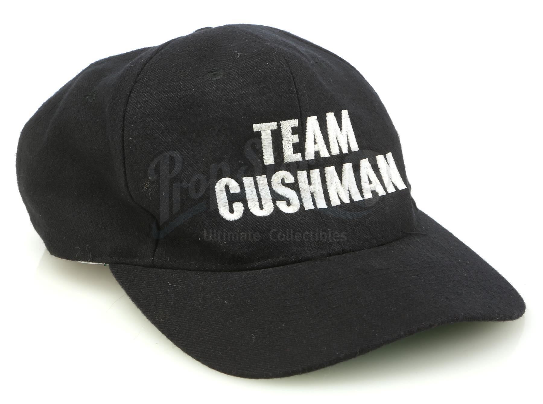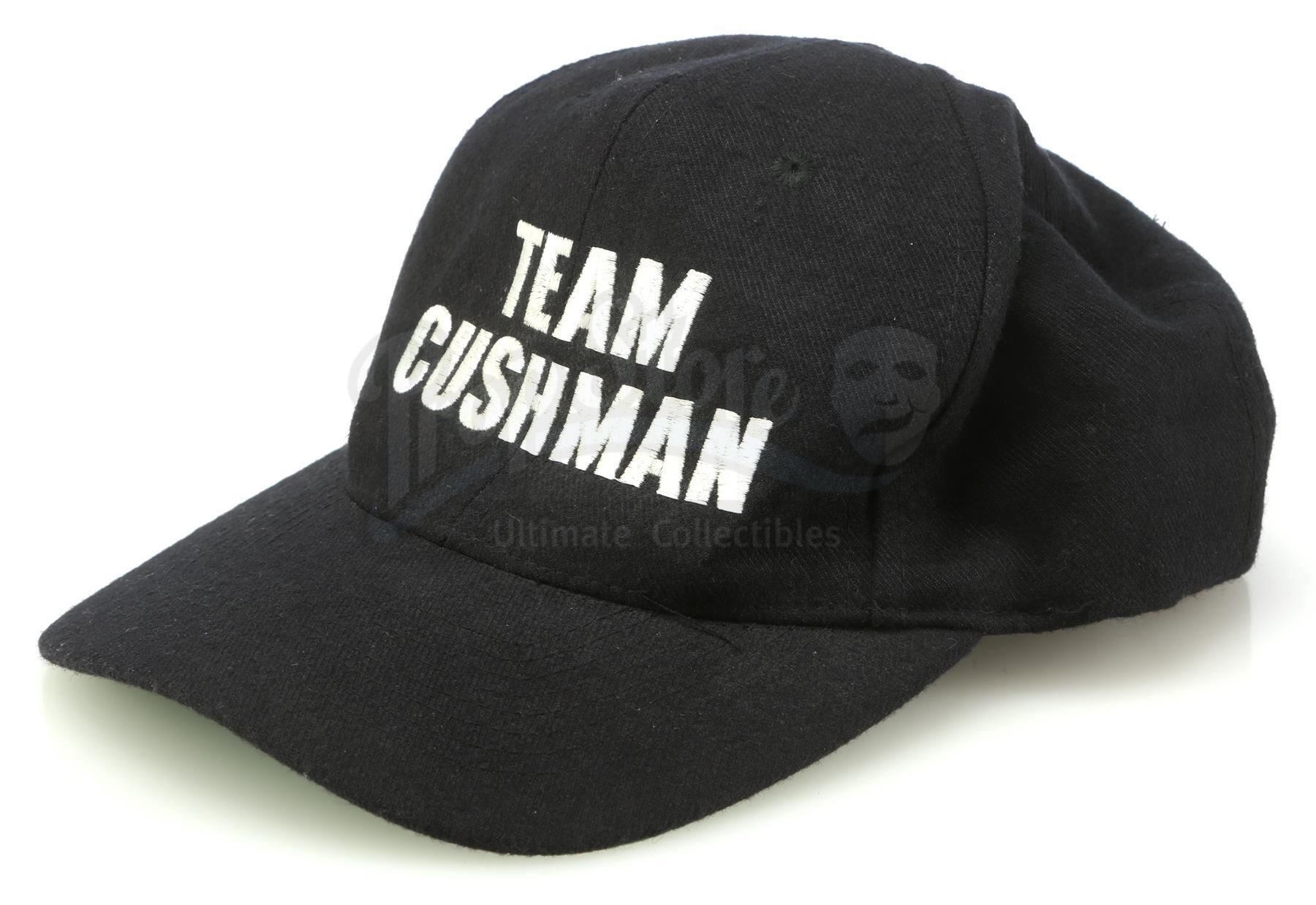 A "Team Cushman" hat and accessories from Cameron Crowe's romance drama Jerry Maguire. After being fired by his company, sports agent Maguire (Tom Cruise) attended the NFL draft in Miami with his final two football player clients, Frank Cushman (Jerry O'Connell) and Rod Tidwell (Cuba Gooding Jr.).