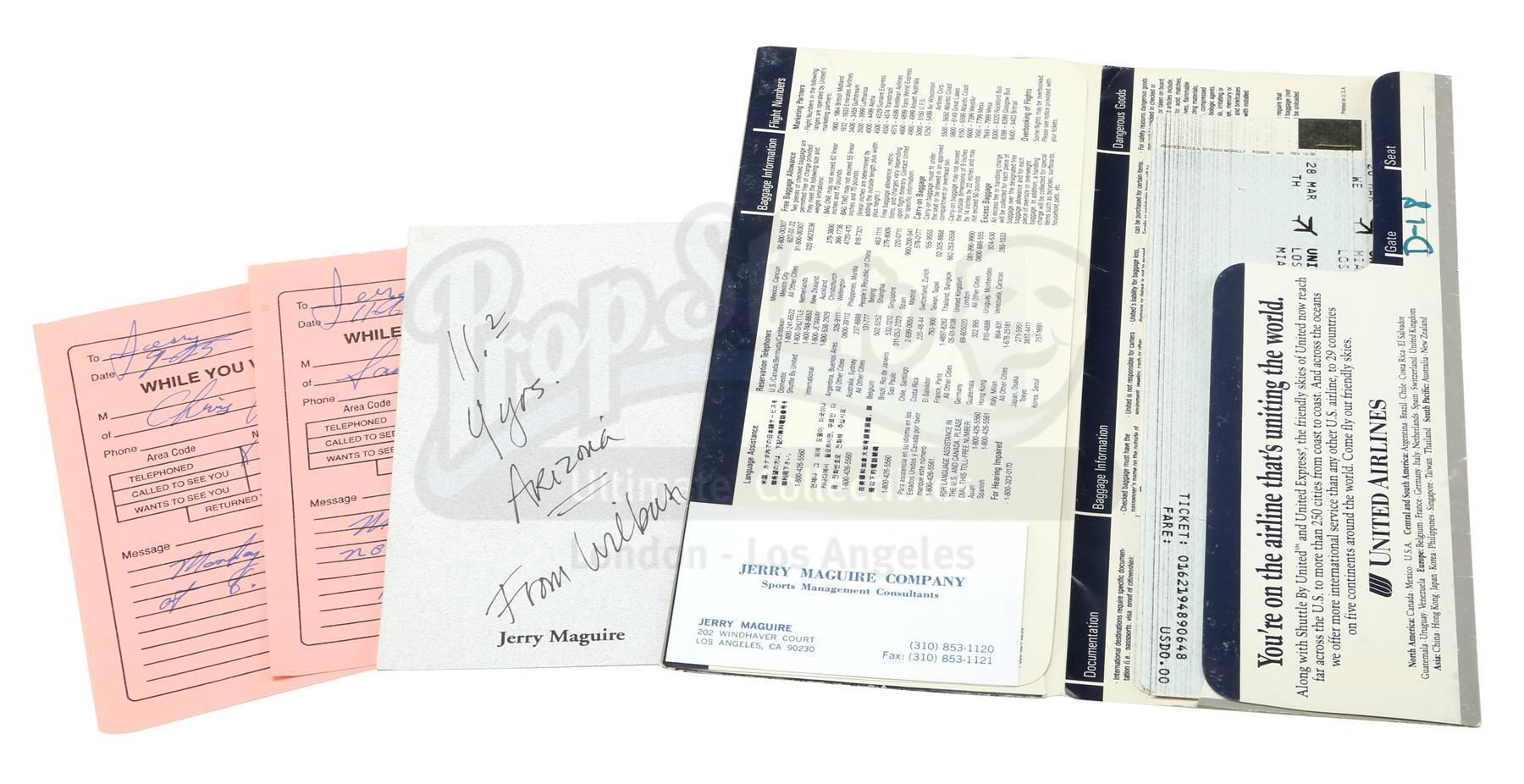 This lot consists of a black Reebok baseball cap with white embroidered letters reading "TEAM CUSHMAN" on the front and "TC" written on the interior label, a paper faux United Airlines plane ticket printed for "MCGUIRE/JERRY" (sic) in a glossy paper sleeve, a cardstock Jerry Maguire business card with the character's address and phone number, a hand-written note reading "11.2 4 yrs. Arizona From Wilburn" (Tidwell's final contract), and a pair of pink paper phone message sheets with hand-written notes written to Maguire from clients. This lot is in excellent overall condition with some minor wear from production on all items and creasing on the plane ticket sleeve. Dimensions: (largest) 10 1/2" x 7 1/2" x 4" (26.75 cm x 19 cm x 10.25 cm); (smallest) 3 1/2" x 2" x 1/4" (9 cm x 5 cm x.75 cm)