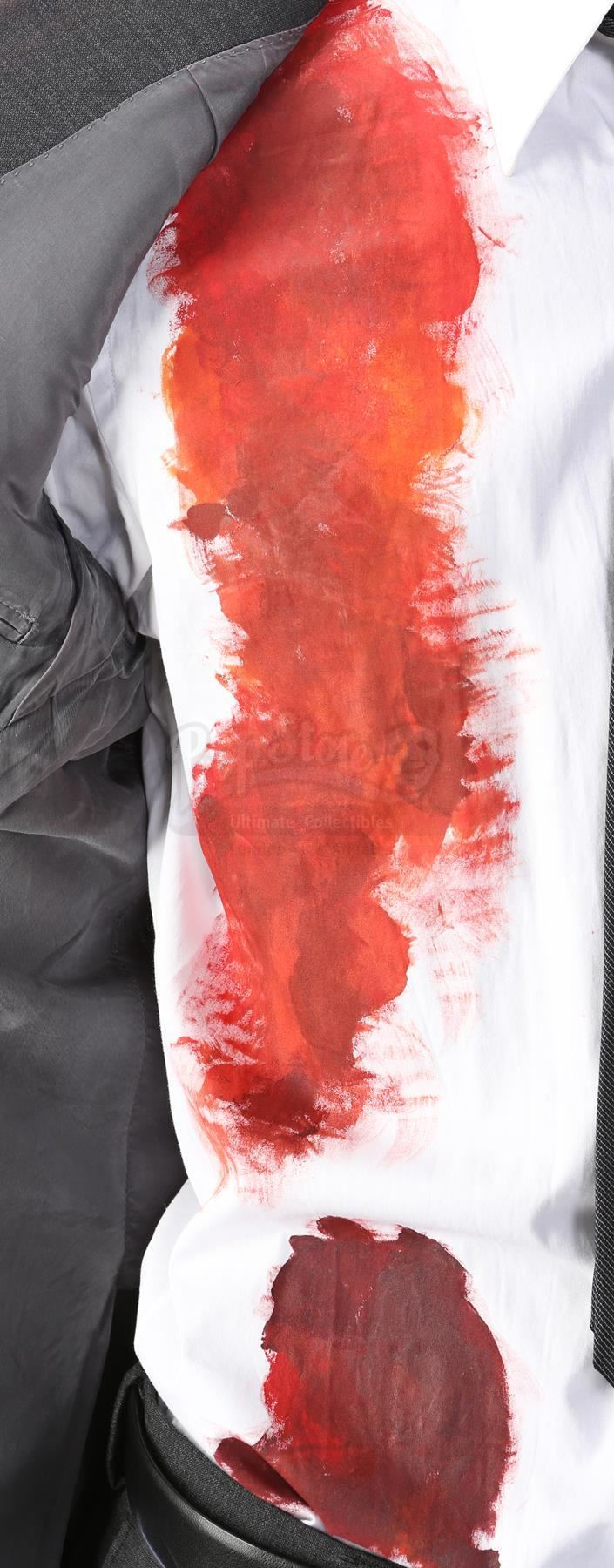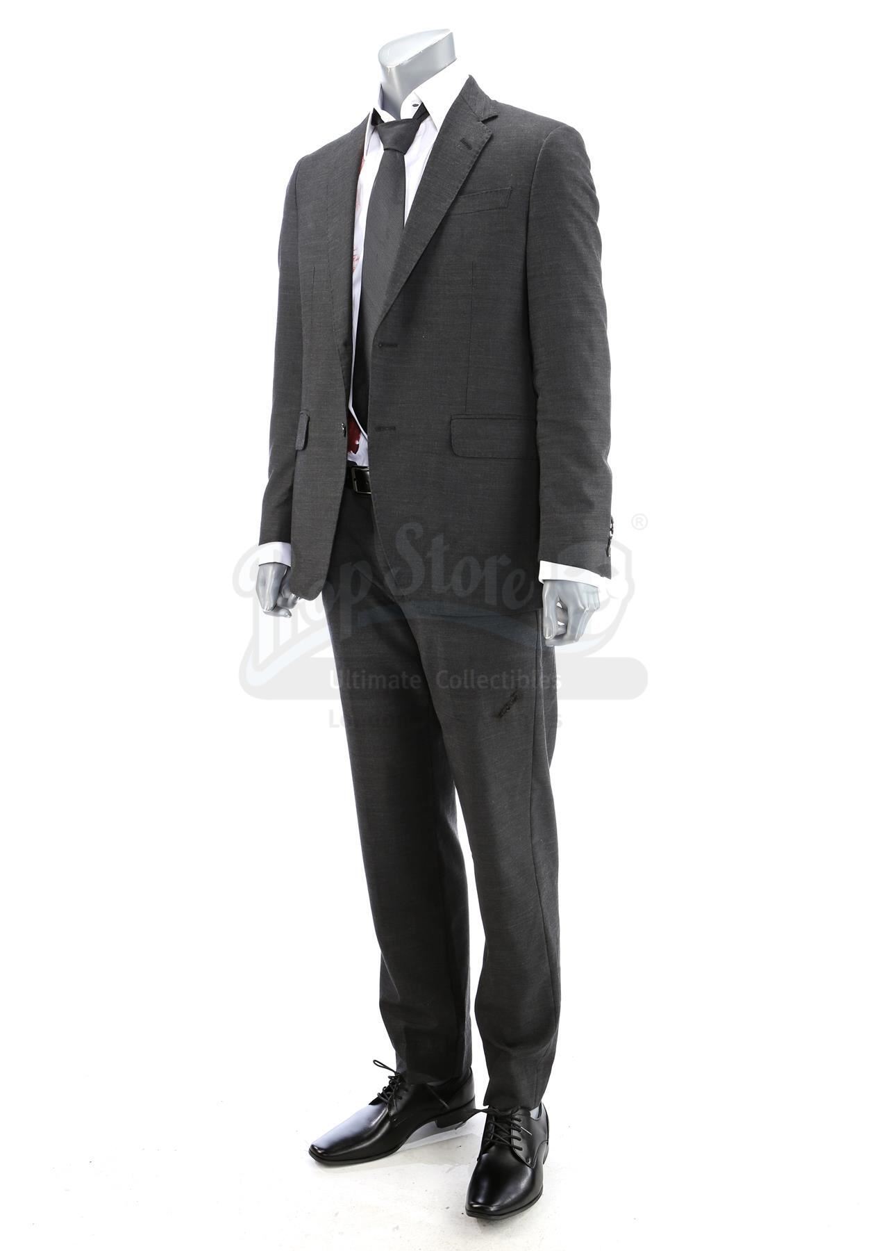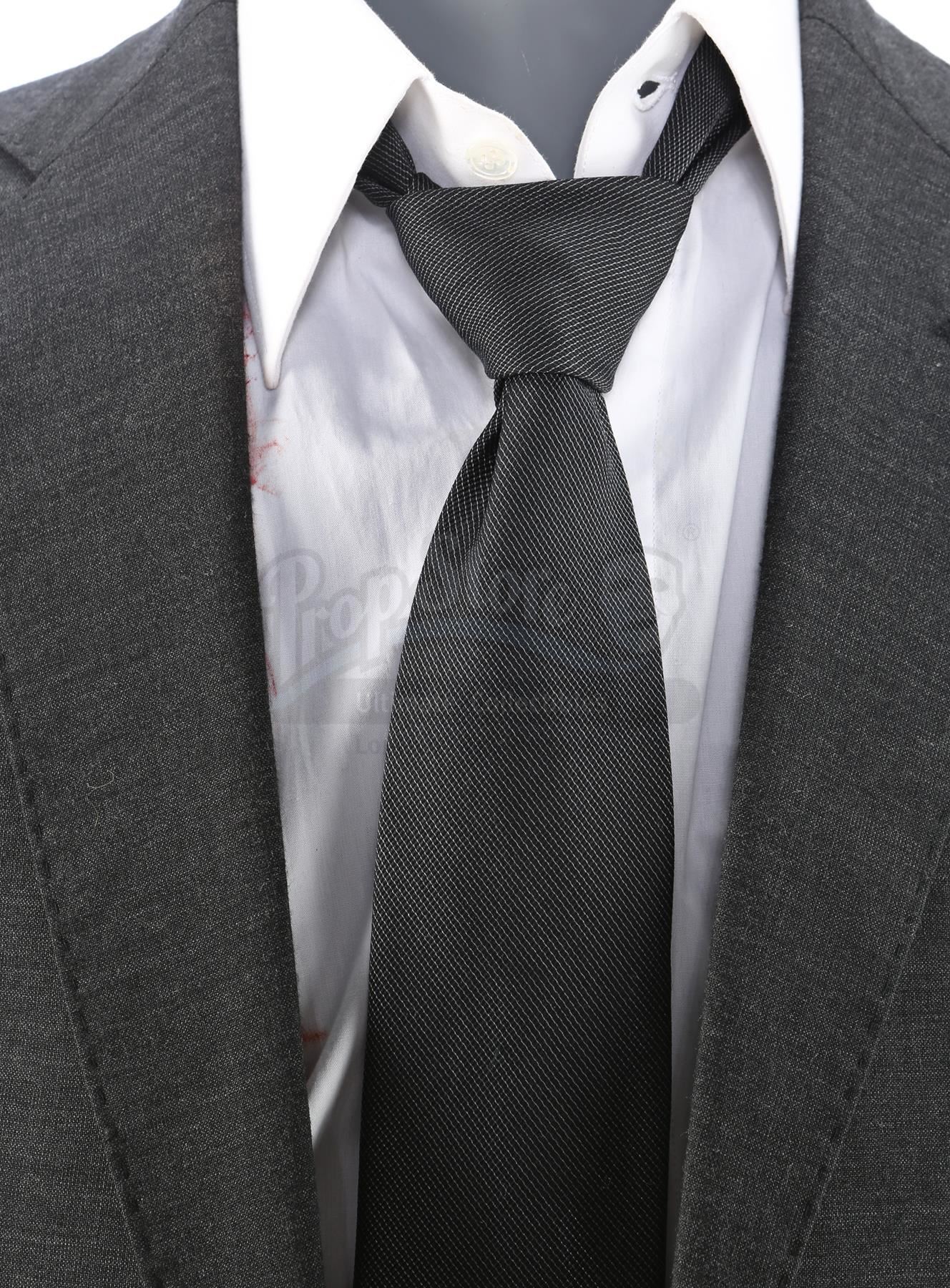 This costume consists of a charcoal-color wool suit jacket marked for the principal actor and matching slacks (size 42W x 36R) marked "Hero"; a white cotton blend button-down shirt; a checkered black silk tie; a black leather belt (size 34) with a steel buckle; and a pair of black leather shoes (men's size 9) marked for a stunt performer. The costume is in good overall condition with significant distressing throughout, including blood-staining to the right side where Ernest stabbed Wick.