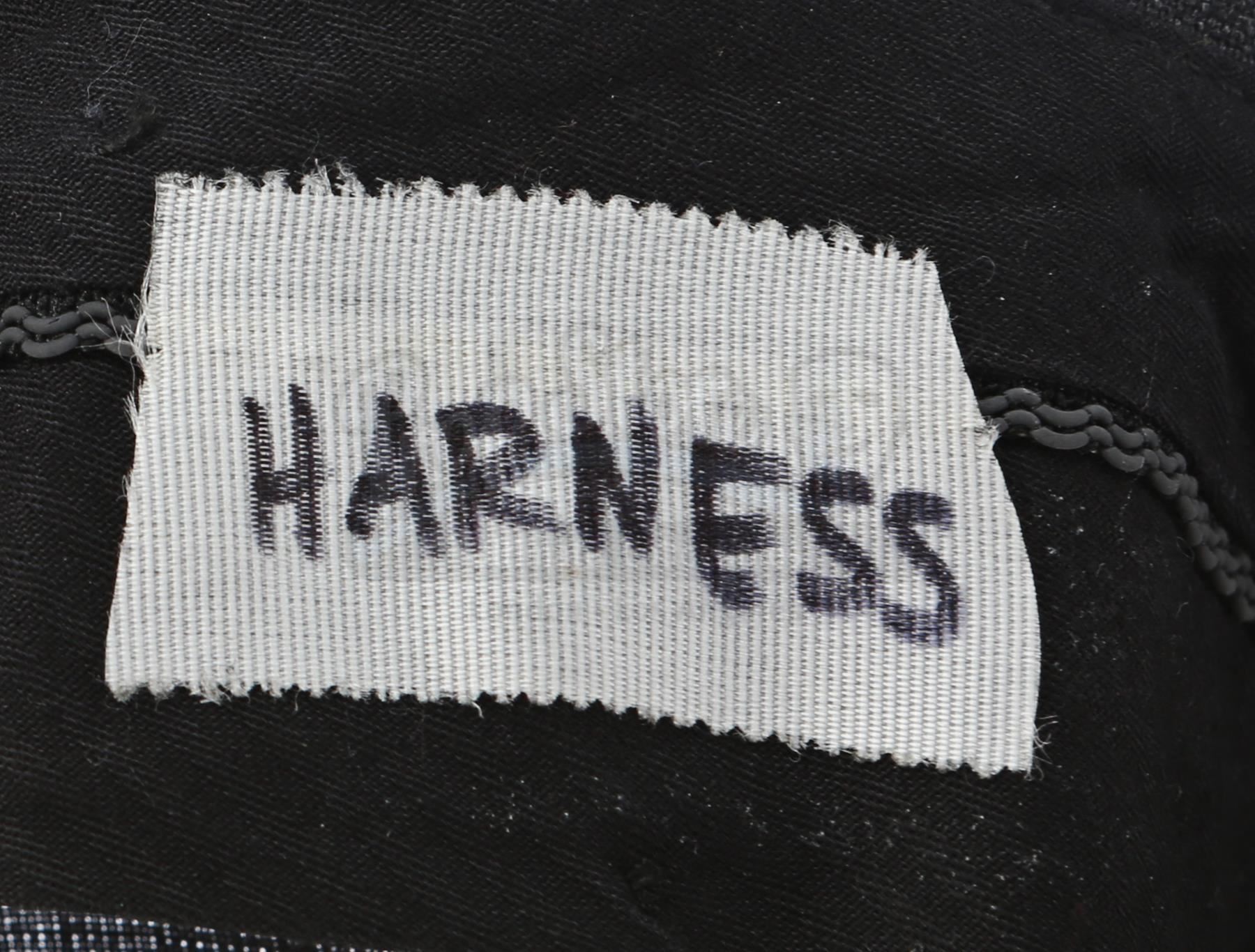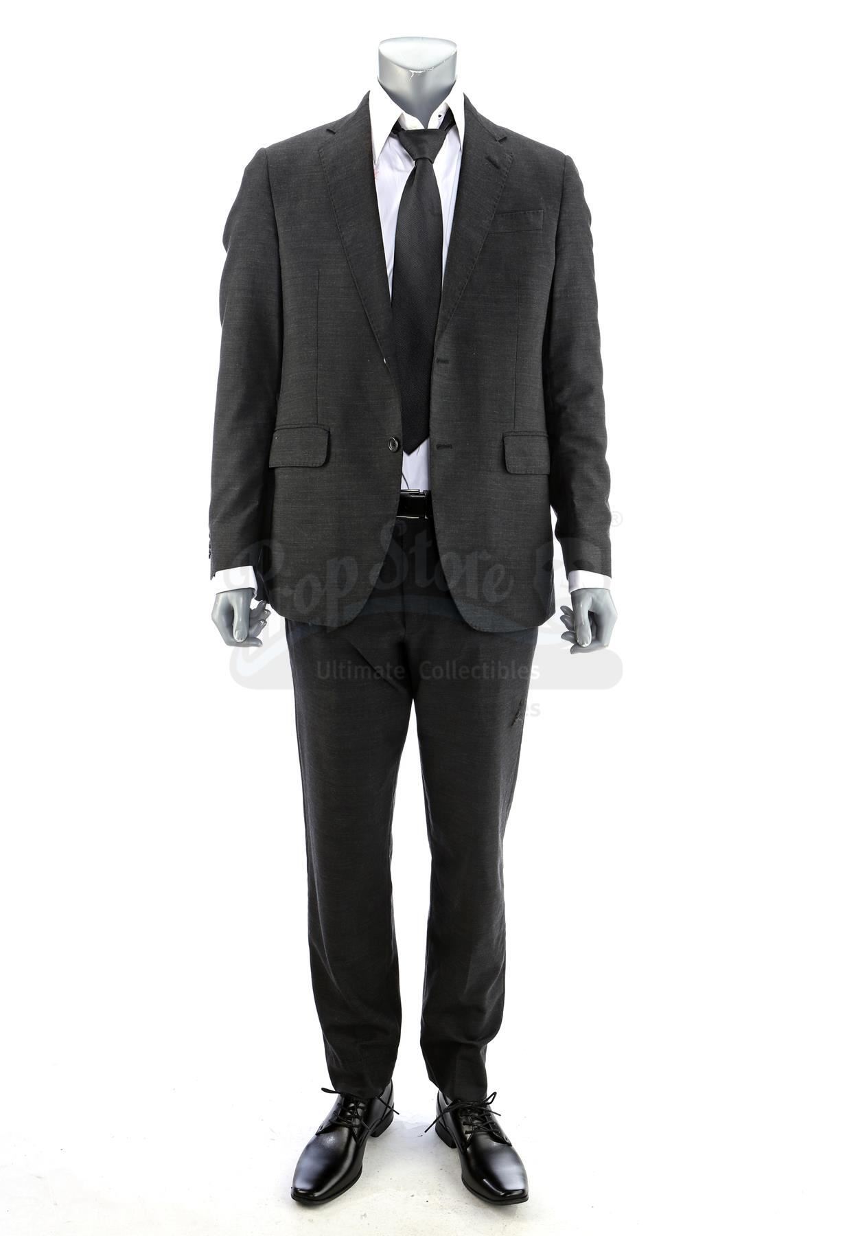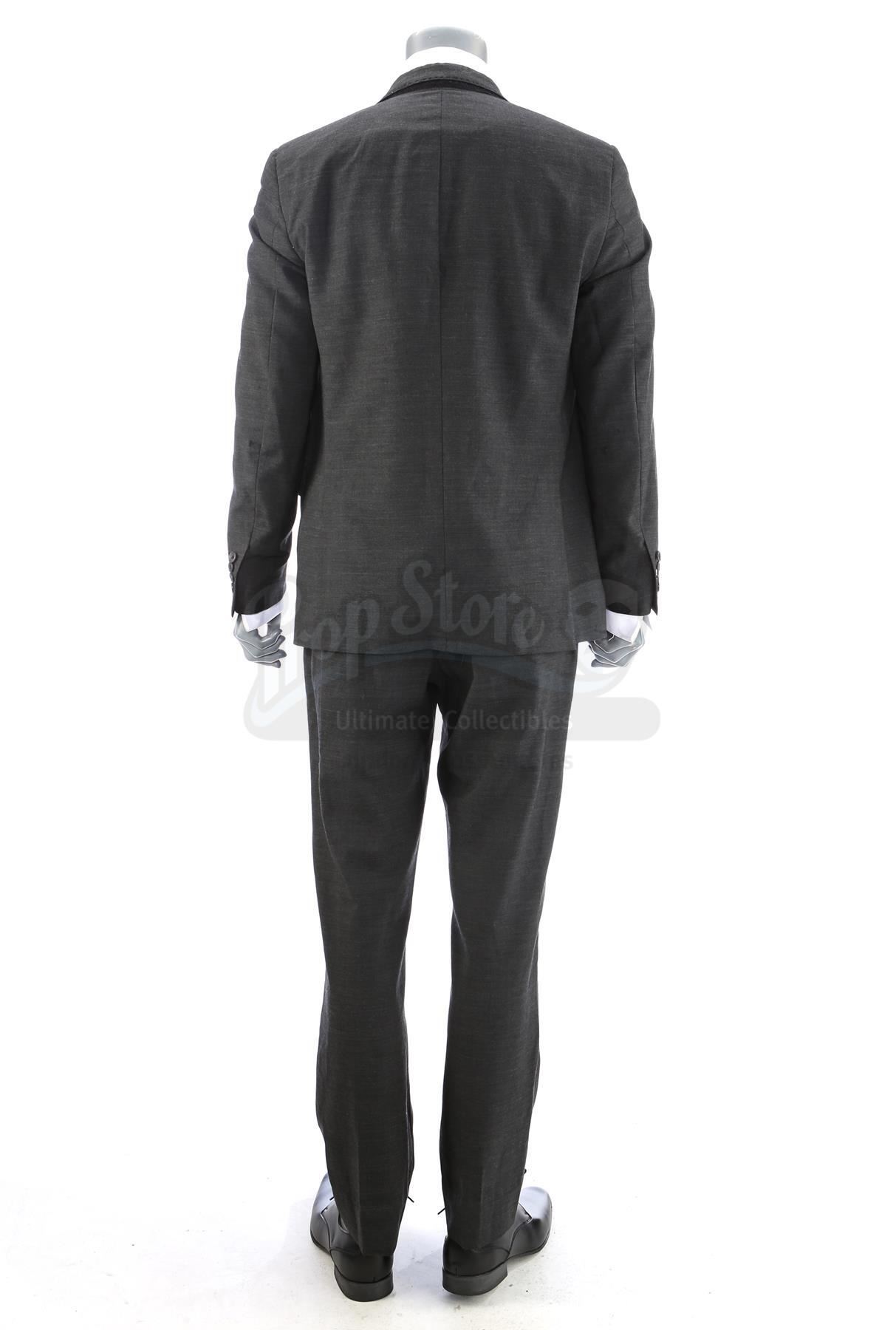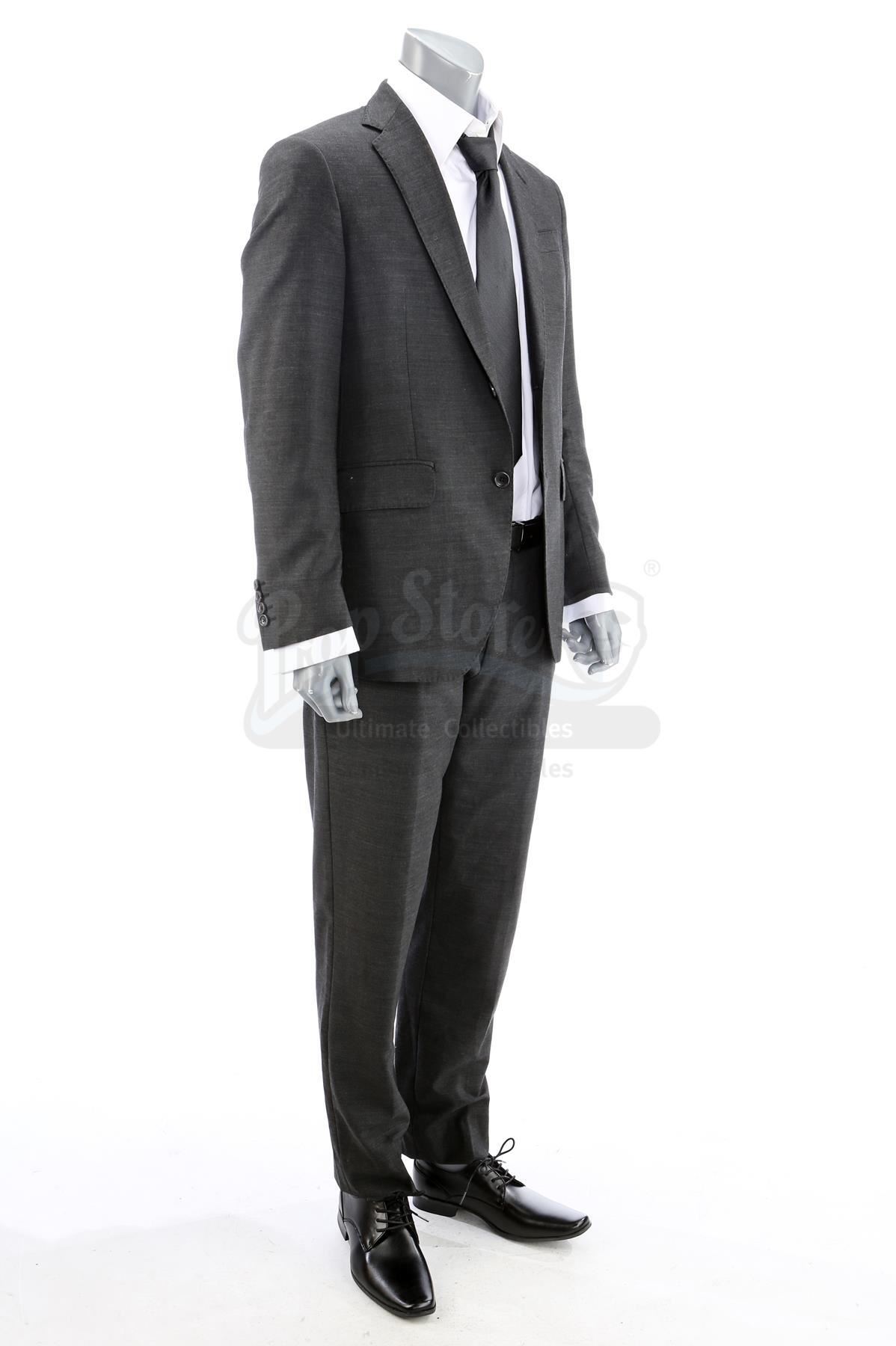 This costume consists of a charcoal-color wool suit jacket marked for the principal actor and matching slacks (size 42W x 36R) marked "Hero"; a white cotton blend button-down shirt; a checkered black silk tie; a black leather belt (size 34) with a steel buckle; and a pair of black leather shoes (men's size 9) marked for a stunt performer. The costume is in good overall condition with significant distressing throughout, including blood-staining to the right side where Ernest stabbed Wick.