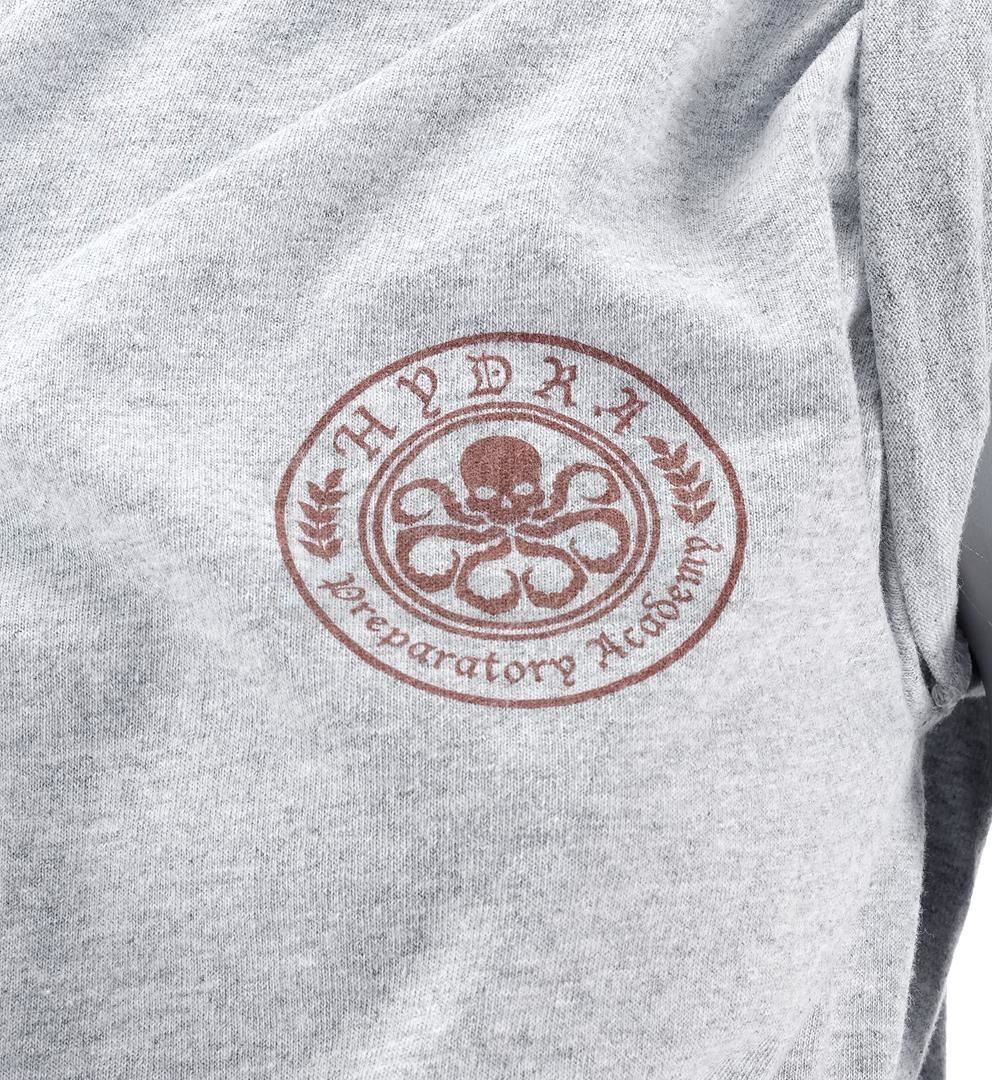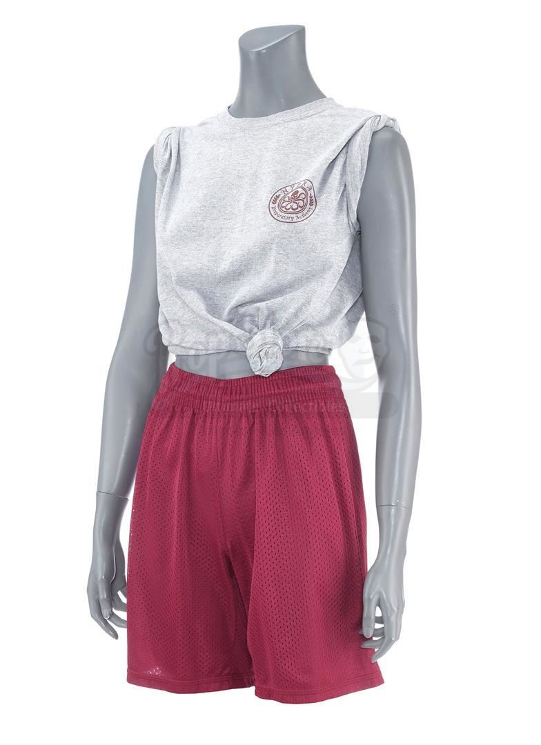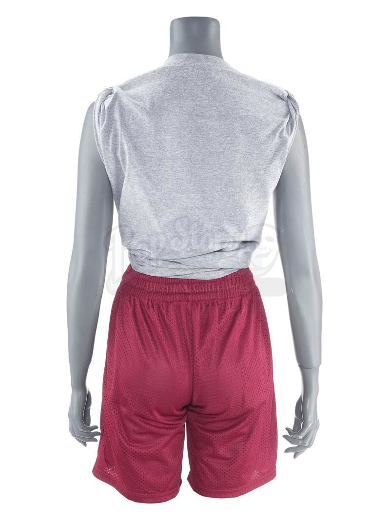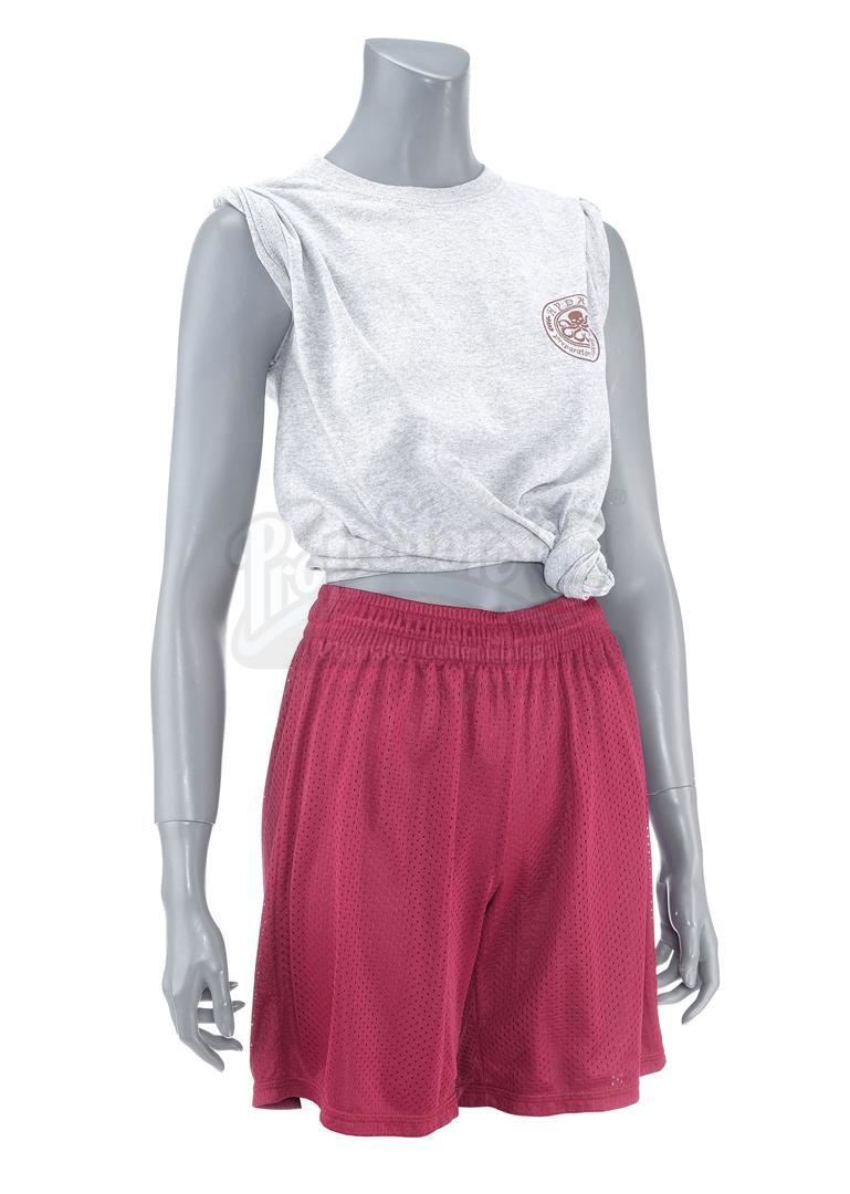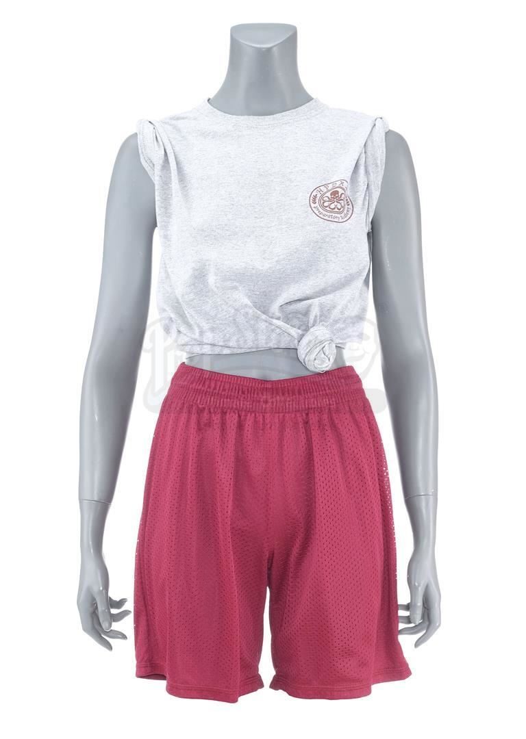 Ruby Hale's stunt Hydra Preparatory Academy training costume from the episode 'Rise and Shine' (515) of Marvel's Agents of S.H.I.E.L.D. In the episode, Hale spars with fellow students at a school gym used by future members of Hydra. This lot consists of a gray cotton T-shirt with pre-rolled sleeves and a crimson Hydra logo emblazoned on front, as well as a pair of matching crimson polyester and nylon blend shorts. It is in excellent overall condition with some signs of wear from production.