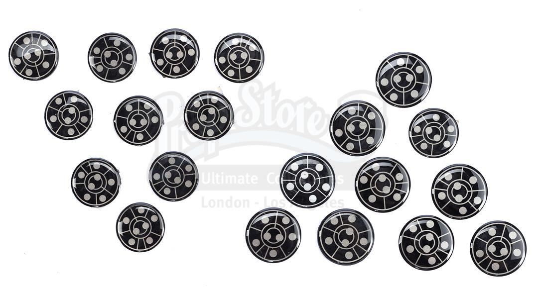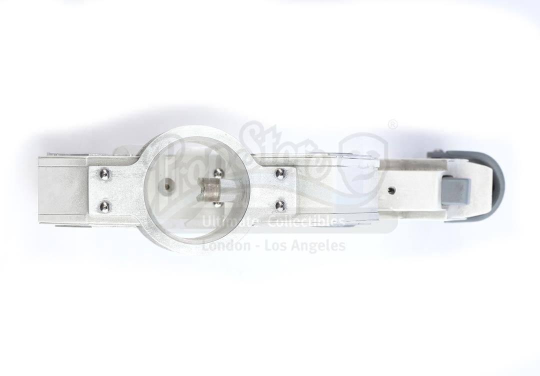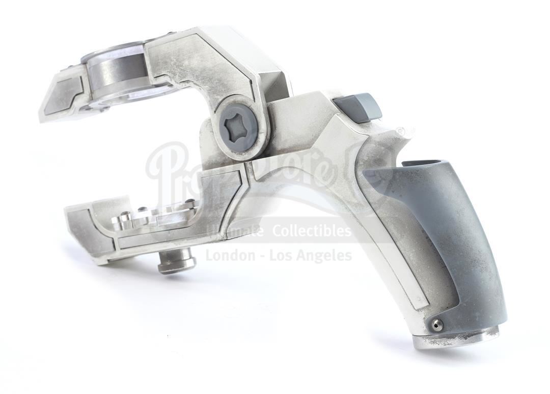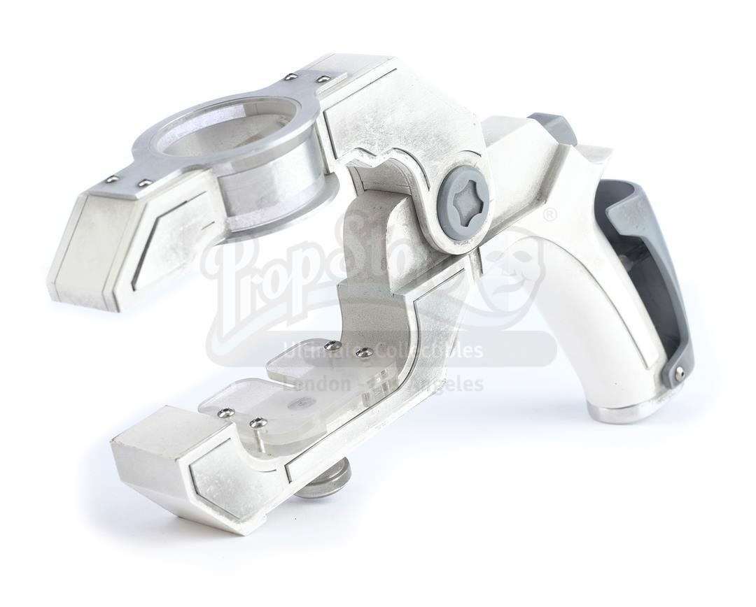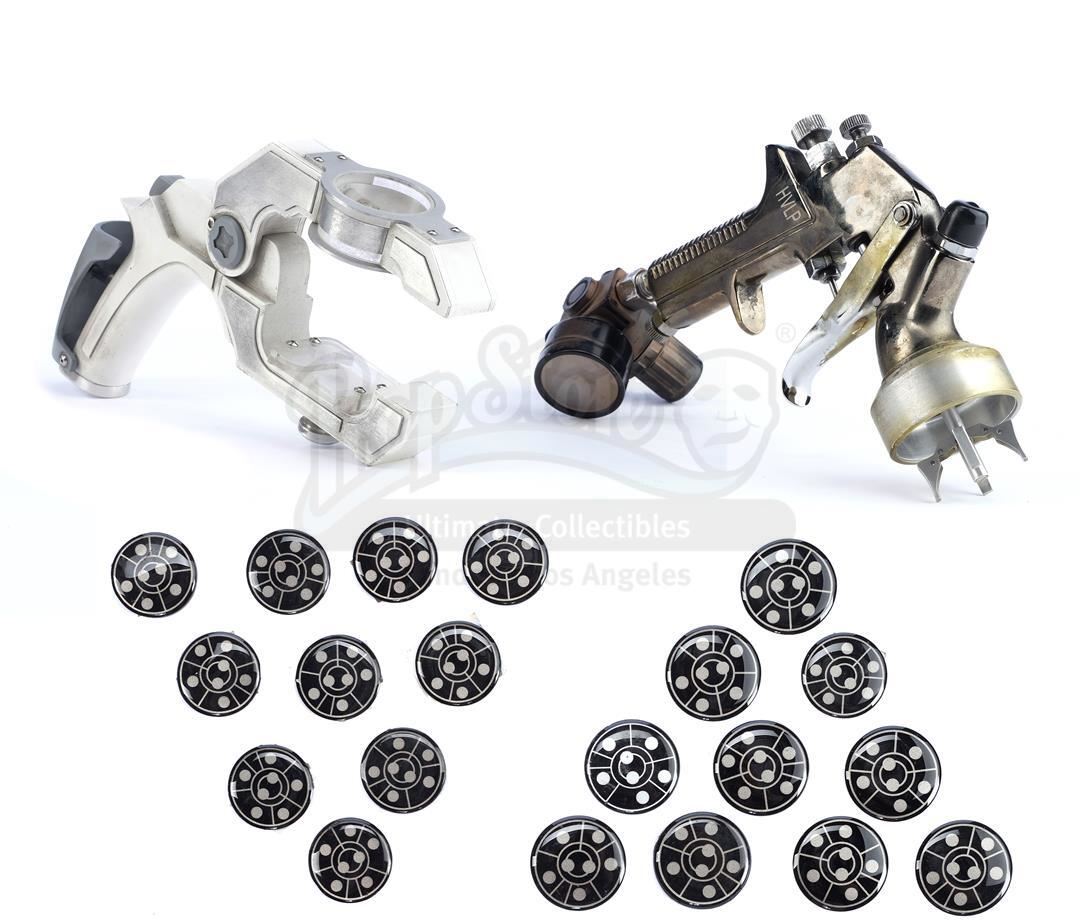A Lighthouse metric set from the episodes 'Orientation (Part 2)' (502) and 'A Life Spent' (503) of Marvel's Agents of S.H.I.E.L.D. In the episodes, Phil Coulson and his team are implanted with metric readers on their wrists in order to pass as residents of the Lighthouse space station. Later, Grill uses his tool to briefly remove Elena 'Yo-Yo' Rodriguez's metric. This lot consists of a white and gray urethane C-shaped device with metal details and a grip with a trigger on the rear, a metal gripped device with black urethane details and a metal trigger, and 18 black urethane discs with black and gray decals attached to the front and adhesive on the backs for applying to surfaces. Ten of the discs are marked for male wearers and eight of the discs are marked for female wearers. This lot is in excellent overall condition with deliberately-made signs of scuffing and wear on the applicator and remover.