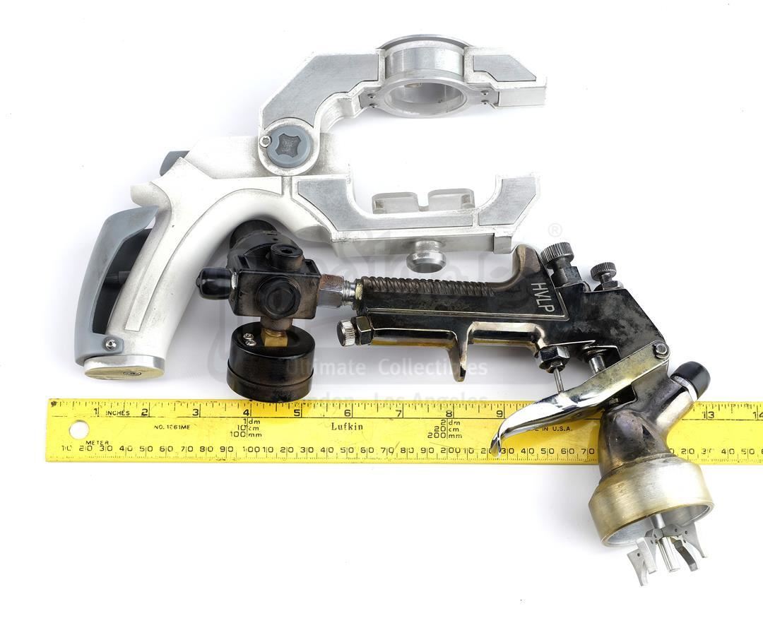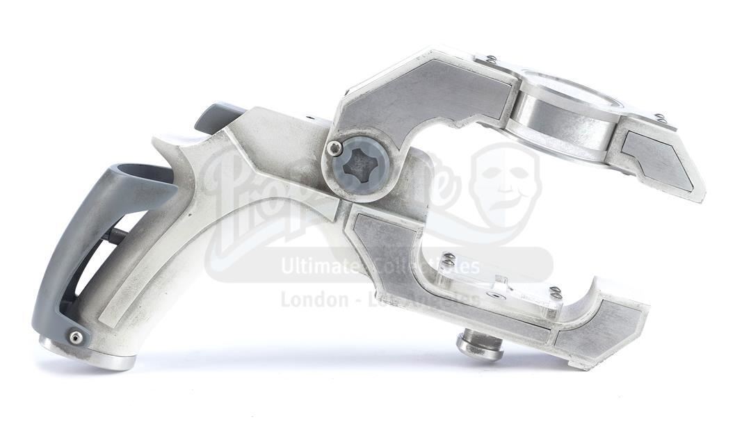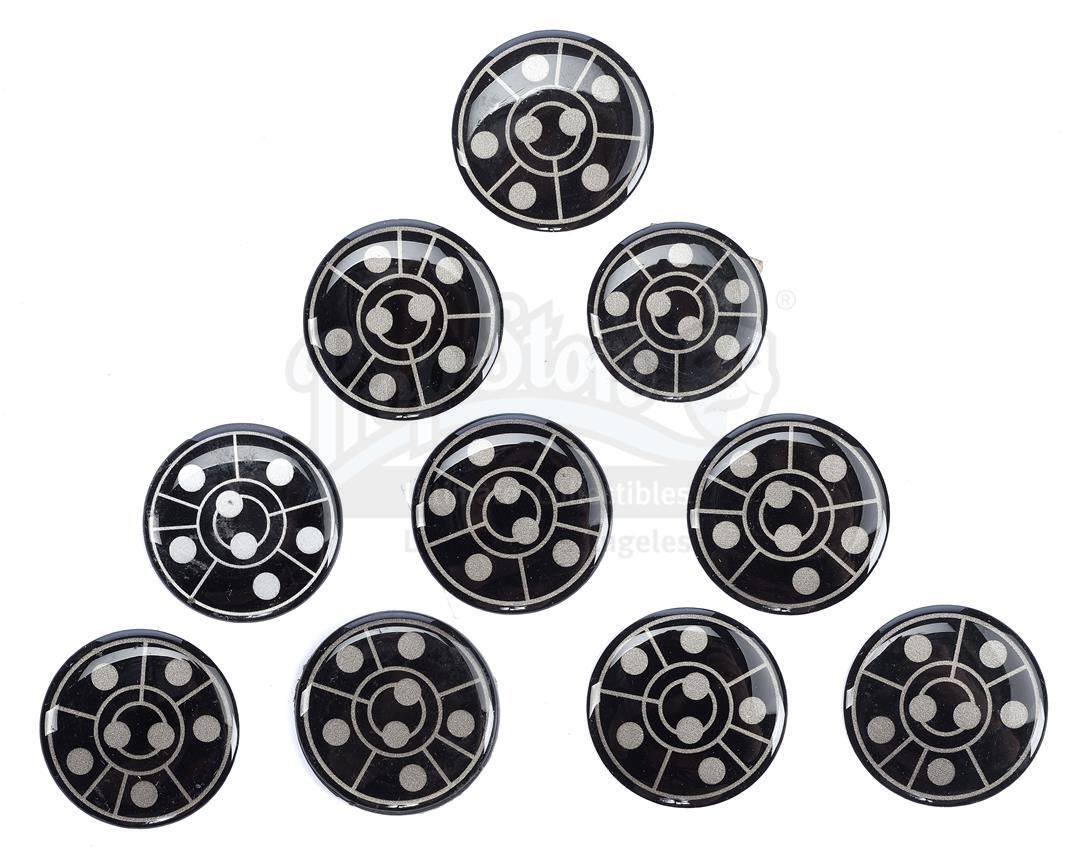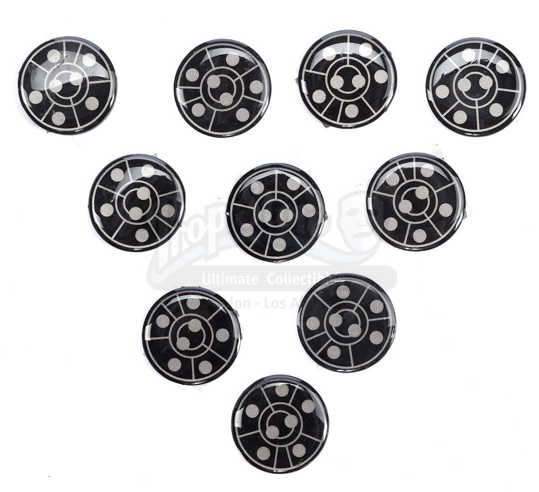 A Lighthouse metric set from the episodes 'Orientation (Part 2)' (502) and 'A Life Spent' (503) of Marvel's Agents of S.H.I.E.L.D. In the episodes, Phil Coulson and his team are implanted with metric readers on their wrists in order to pass as residents of the Lighthouse space station. Later, Grill uses his tool to briefly remove Elena 'Yo-Yo' Rodriguez's metric. This lot consists of a white and gray urethane C-shaped device with metal details and a grip with a trigger on the rear, a metal gripped device with black urethane details and a metal trigger, and 18 black urethane discs with black and gray decals attached to the front and adhesive on the backs for applying to surfaces. Ten of the discs are marked for male wearers and eight of the discs are marked for female wearers. This lot is in excellent overall condition with deliberately-made signs of scuffing and wear on the applicator and remover.