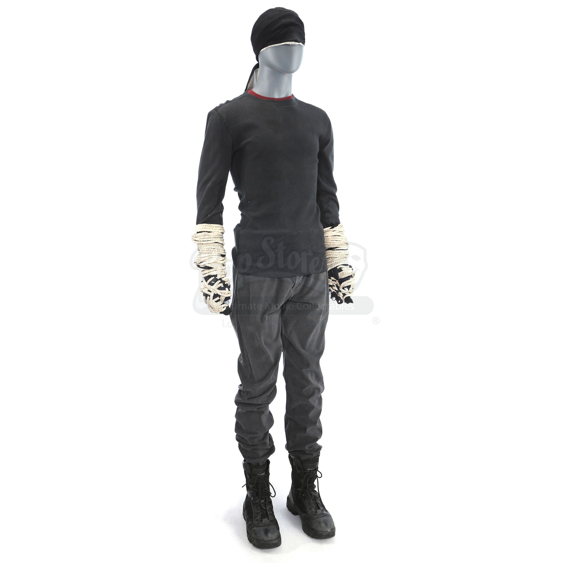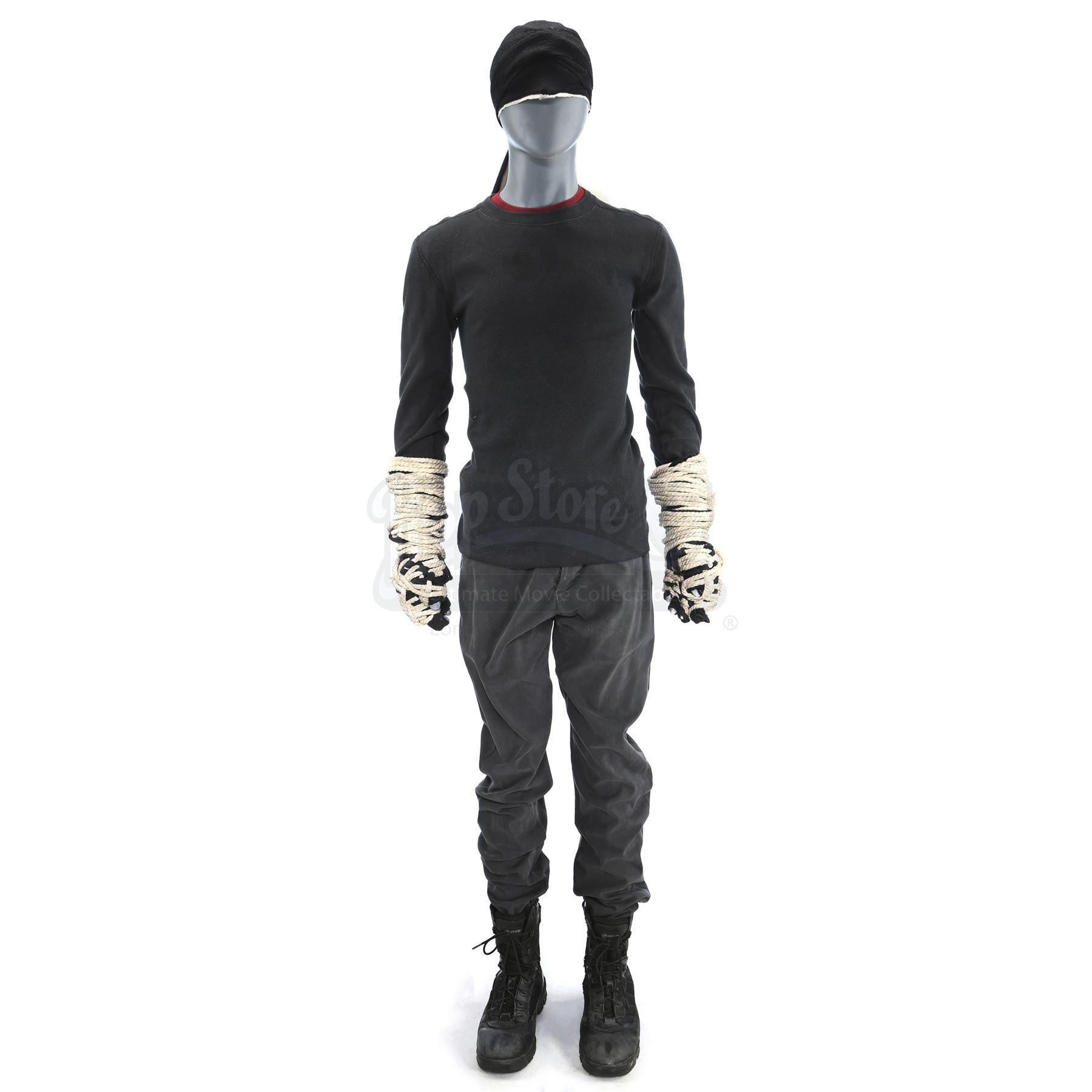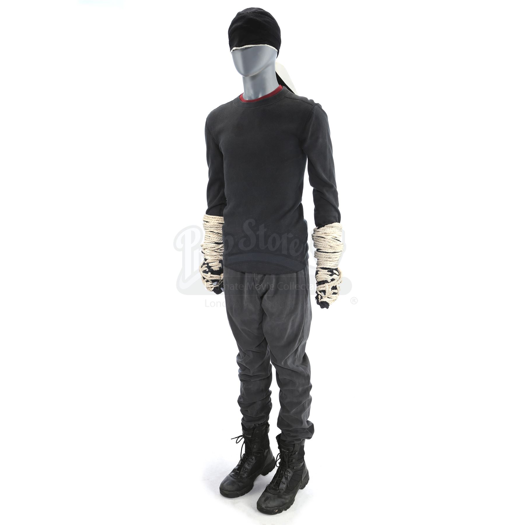 Matt Murdock’s rooftop costume from the episode ‘A New Napkin’ (313) of Marvel's Daredevil. In the episode, Murdock wears his costume while dangling Felix Manning off a rooftop with a rope. This lot consists of a black cotton sweater with an interior crimson neckline and fastening strips on the wrists, a black wool and elastic mask with a cream-color mesh lining, and resin nose guard, a pair of charcoal cotton pants, a black leather belt, a pair of black leather and rubber boots, and two elastic and cotton gloves which have been fitted with a pair of Muay Thai rope hand wraps, cloth tassels and fastening strips. The lot is in good overall condition with some signs of wear from production.