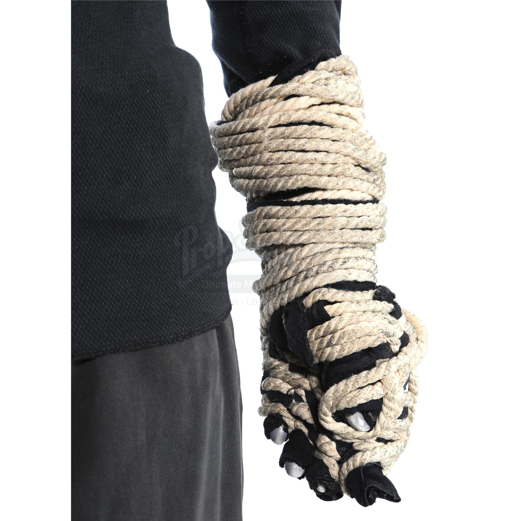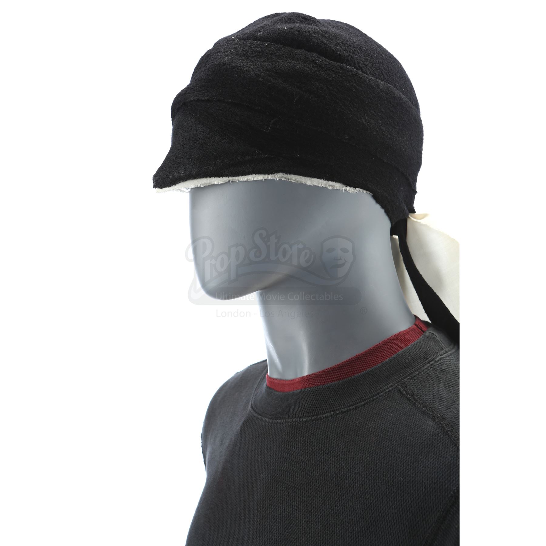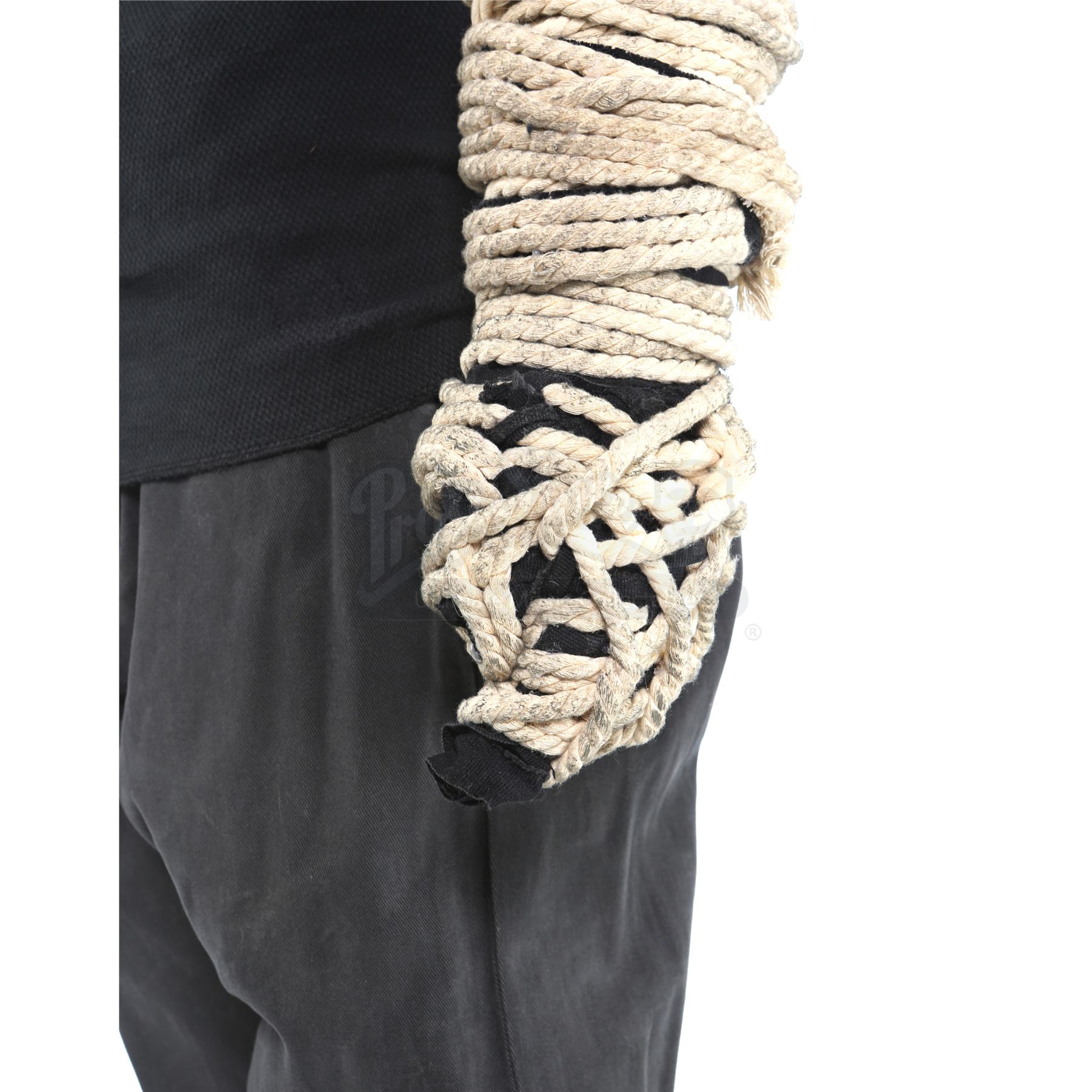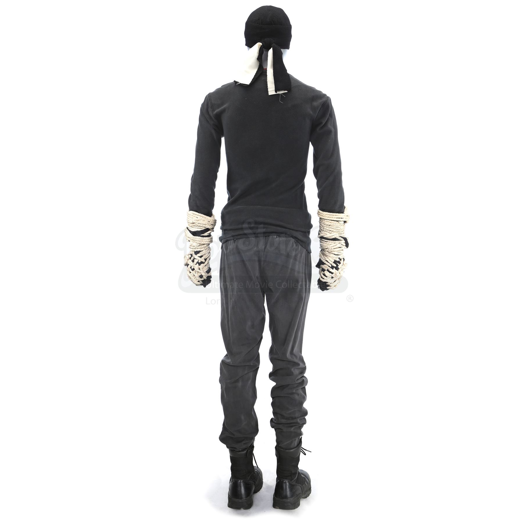 Matt Murdock’s rooftop costume from the episode ‘A New Napkin’ (313) of Marvel's Daredevil. In the episode, Murdock wears his costume while dangling Felix Manning off a rooftop with a rope. This lot consists of a black cotton sweater with an interior crimson neckline and fastening strips on the wrists, a black wool and elastic mask with a cream-color mesh lining, and resin nose guard, a pair of charcoal cotton pants, a black leather belt, a pair of black leather and rubber boots, and two elastic and cotton gloves which have been fitted with a pair of Muay Thai rope hand wraps, cloth tassels and fastening strips. The lot is in good overall condition with some signs of wear from production.