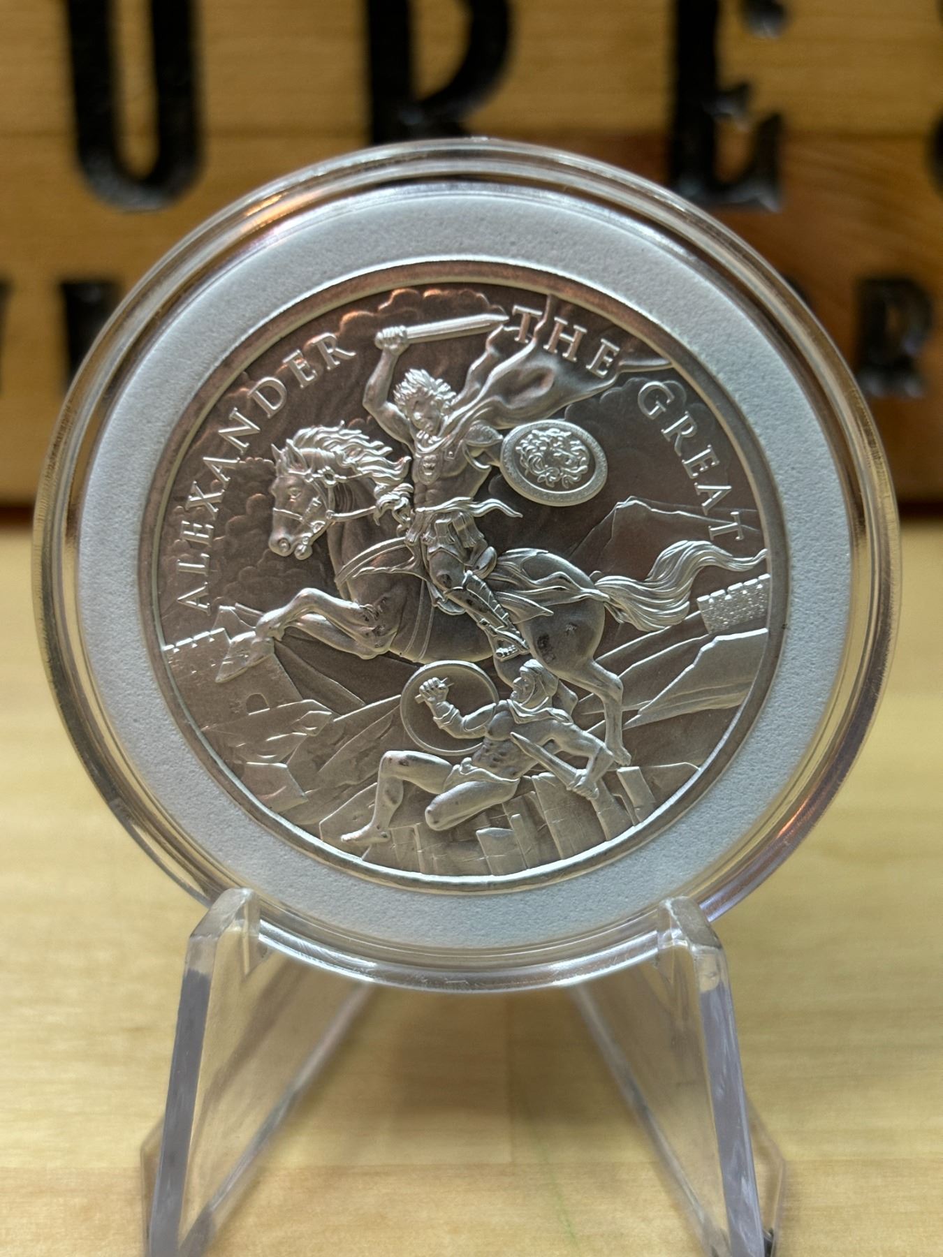 The Alexander the Great Legendary Warriors Silver is a 1oz silver coin (99.9% purity), featuring a portrait of **Alexander the Great** on the obverse. The reverse showcases imagery related to his military campaigns. The face value varies depending on the issuing country. This coin is a popular choice for collectors interested in history and ancient warfare.