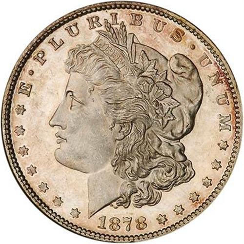 1878. Strongly doubled tail feathers. Glittering two tone contrast between the frosted relief of Liberty and the eagle versus the mirror-reflection in the field. What a resplendent coin this is. (#97079)