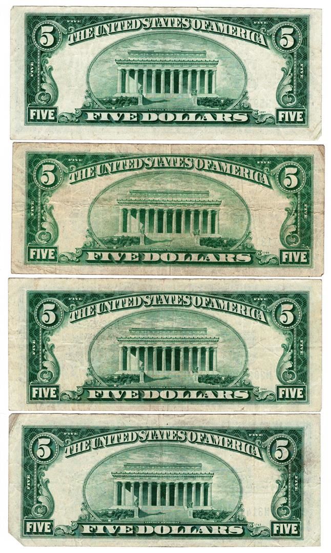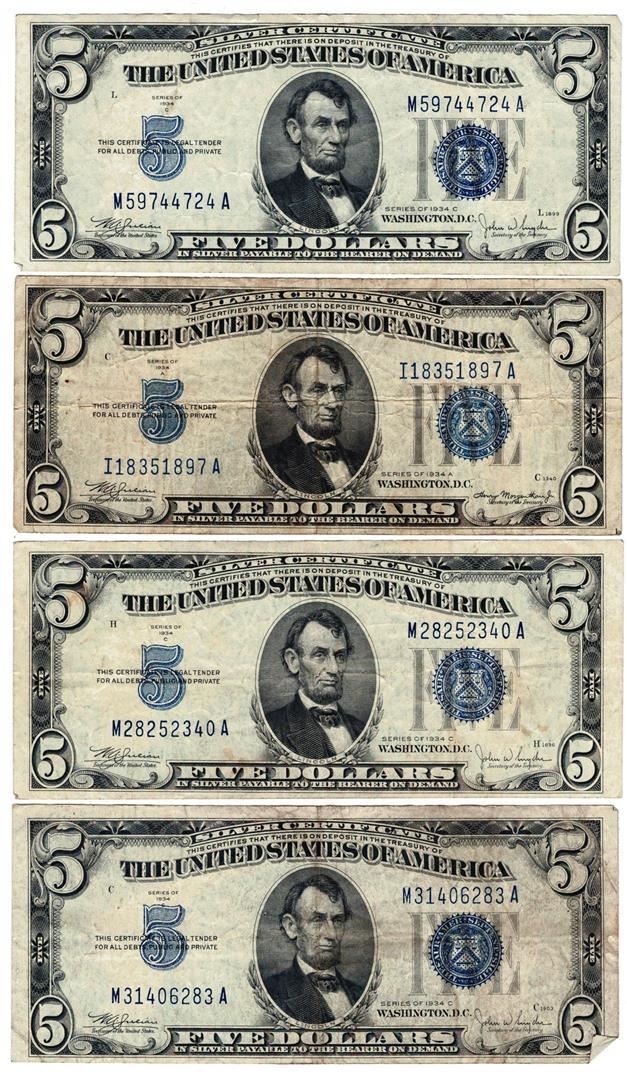One Lot (4) 1934 $5 Silver Certificate Notes