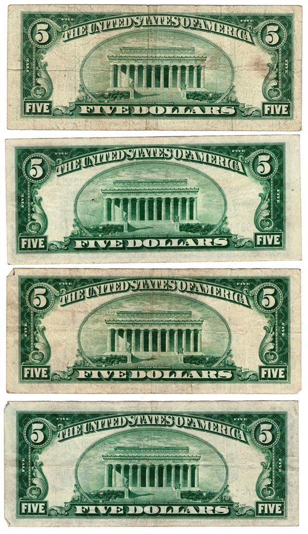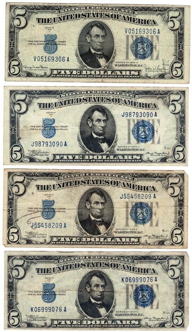 One Lot (4) 1934 $5 Silver Certificate Notes