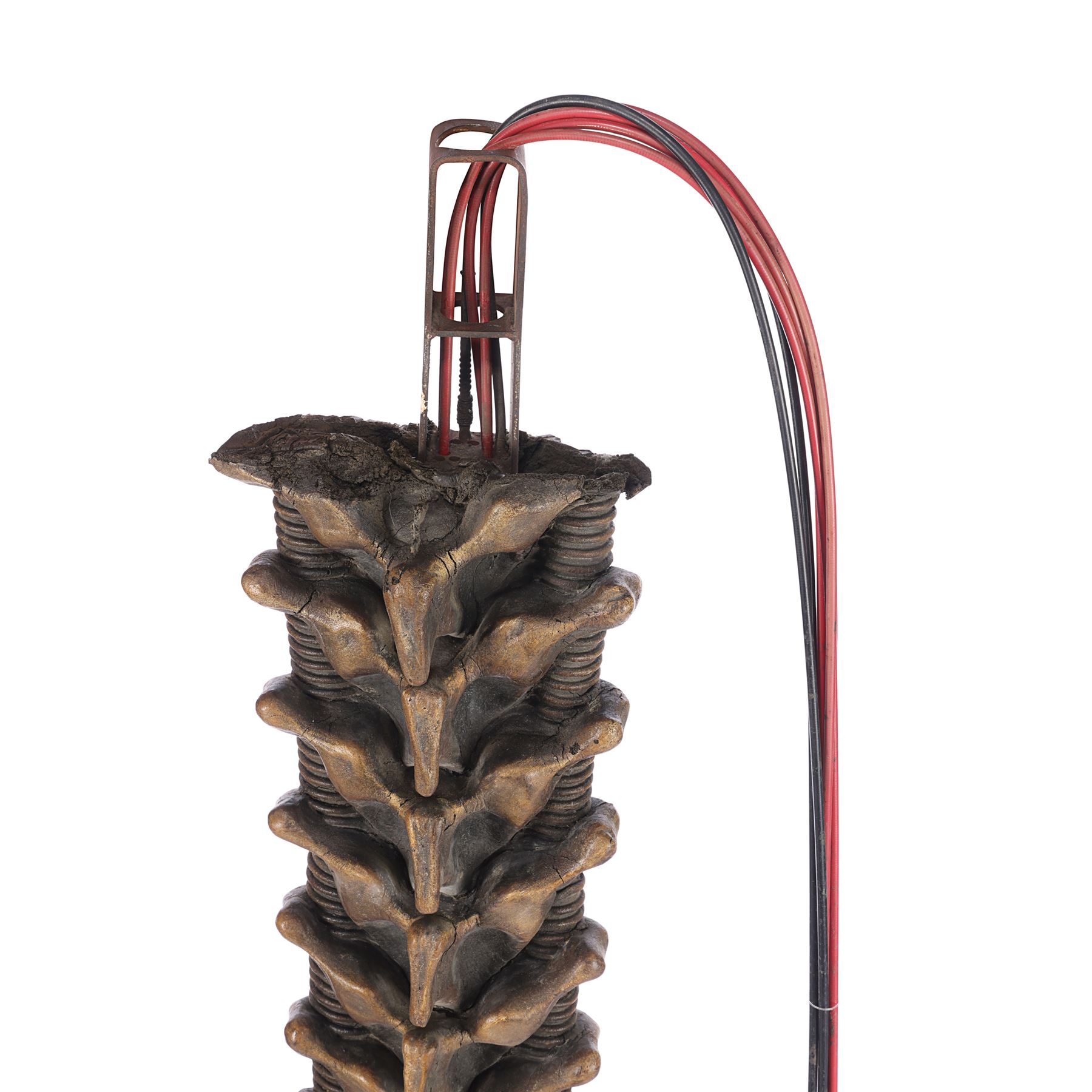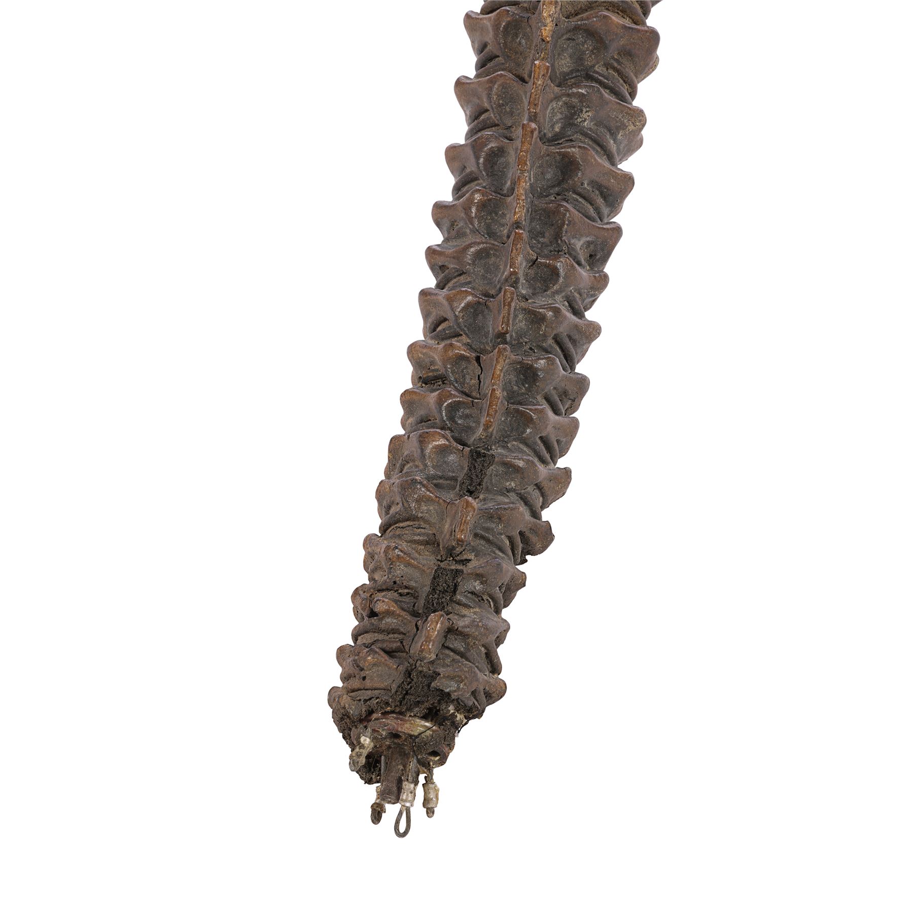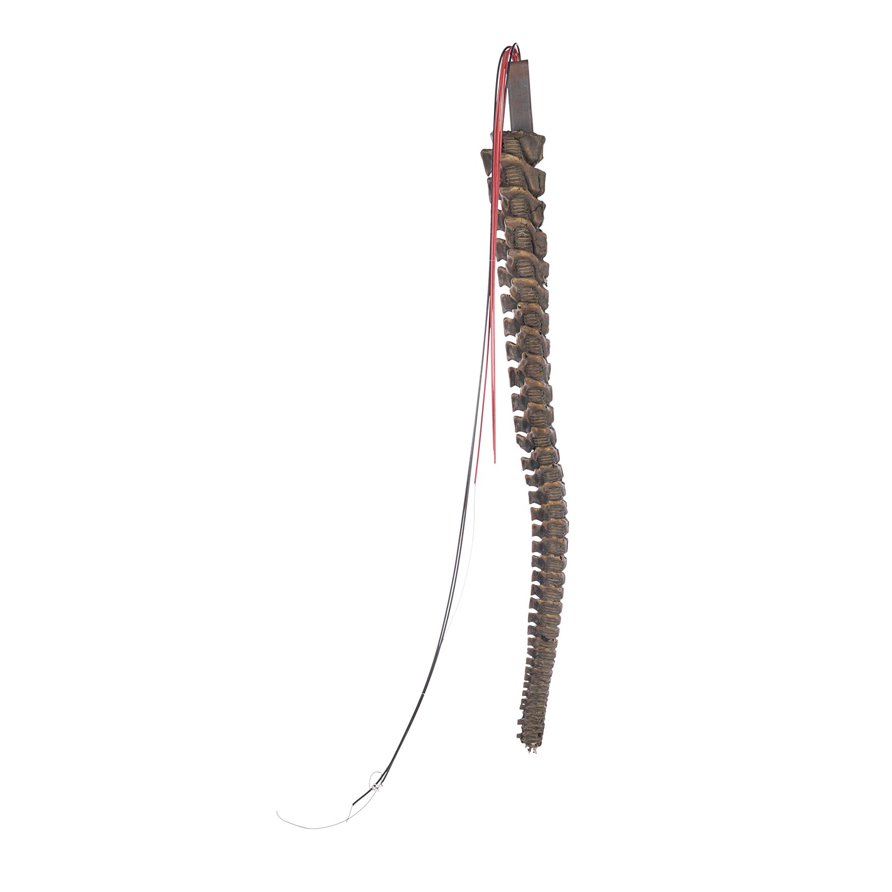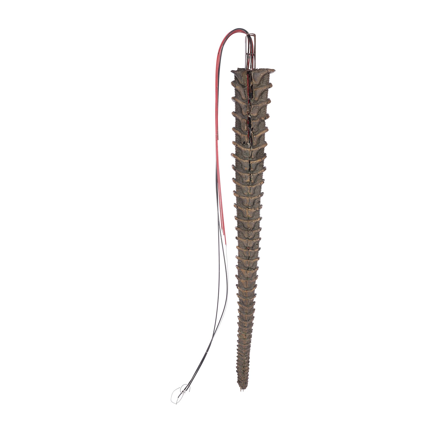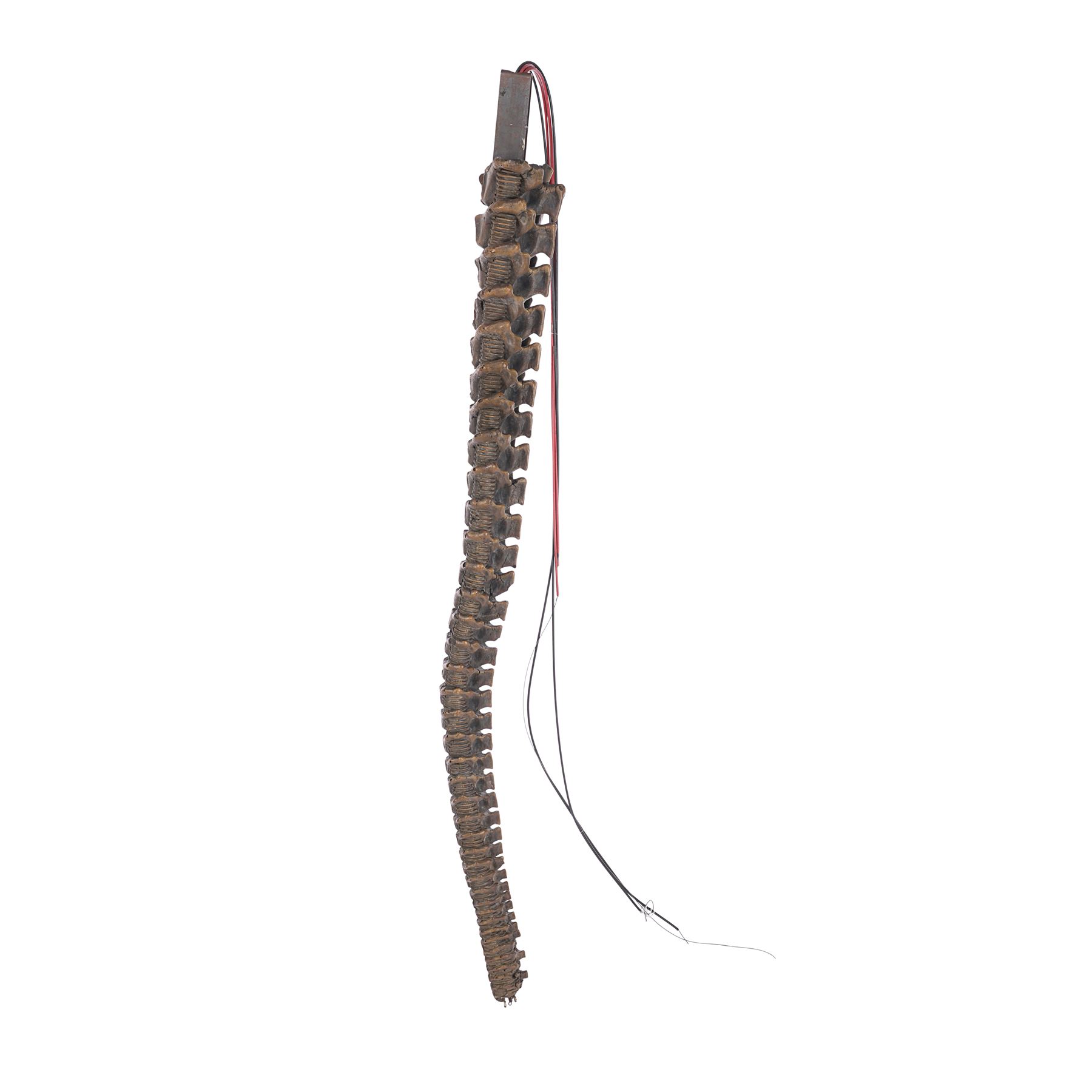 An animatronic cable-controlled xenomorph tail from James Cameron's sci-fi action sequel Aliens. Xenomorph warriors used their tails as weapons, and one lifted its tail menacingly above Newt (Carrie Henn) as it rose out of the water behind her. The tail is made primarily of foam rubber around a metal armature. Several metal cables run down the interior length of the tail and protrude out of the base. These were used to control the tail's movement. It has some wear from age and use: its tip has come away, exposing the wires, and the foam rubber remains in a fragile condition, with cracks all along the tail. Dimensions (length of tail): 153 cm x 19 cm x 15 cm (60 1/4" x 7 1/2" x 6")
