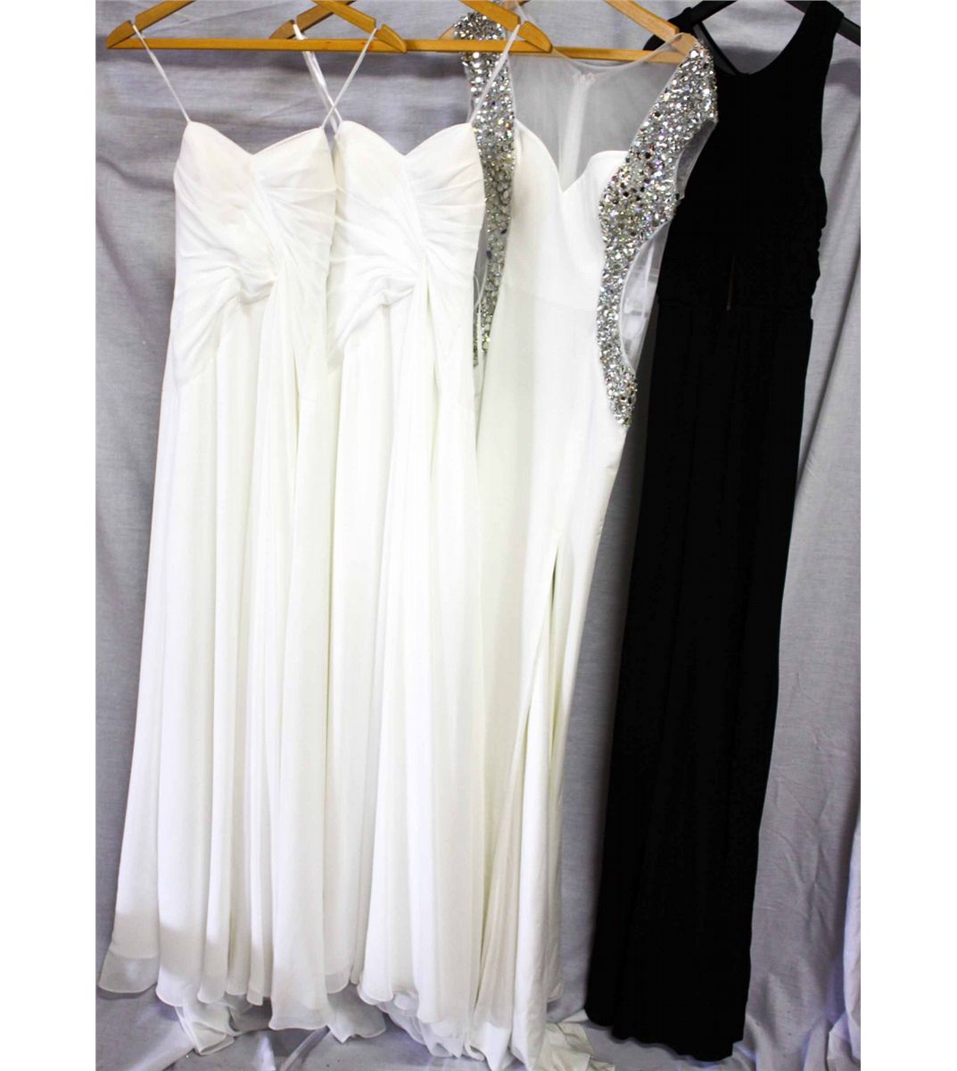 Lot [4] DRESSES: [1] ABS black gown, size XS, [1] Ivory Jovani sequin low back gown, [1] Ivory double sash strapless gown, size 0, [1] Ivory double sash strapless gown, size 0
