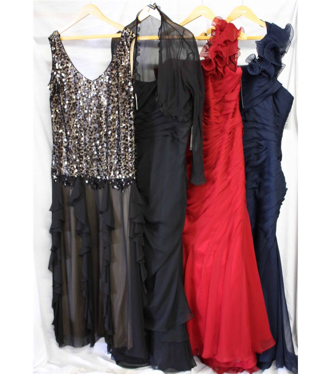Lot [4] DRESSES: [1] Black sequin with chiffon, size 20, [1] Black strapless, size 18, [1] Red shoulder with flower chiffon, size 20, , [1] Blue shoulder with flower chiffon, size 20