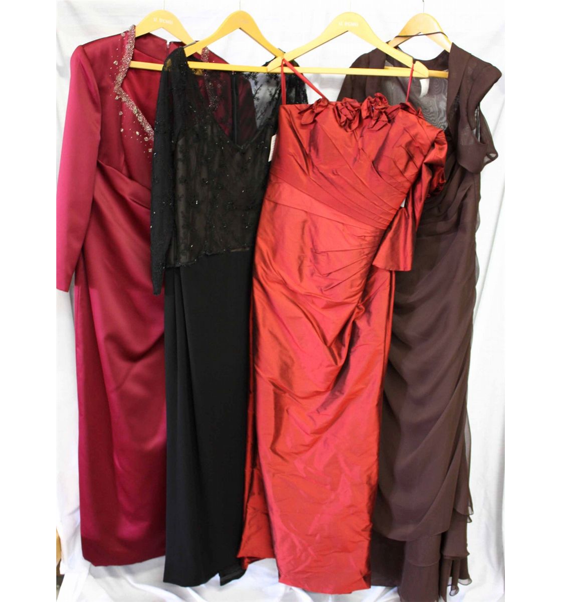 Lot [4] DRESSES: [1] Chocolate strapless, size 16, [1] Red shoulder and sleeve with roses around neck, size 16, [1] Black lace top long sleeve, size 16, [1] Wine colored long sleeve, size 16