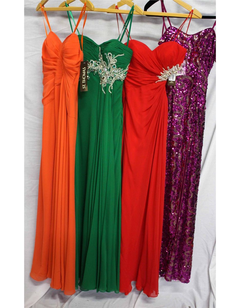 Lot [4] DRESSES: [1] Faviana strapless gown, size 0, [1] Red Faviana beaded side cutout gown, size 0, [1] Emerald Faviana strapless gown, size 0, [1] Faviana strapless chiffon dress, size 0