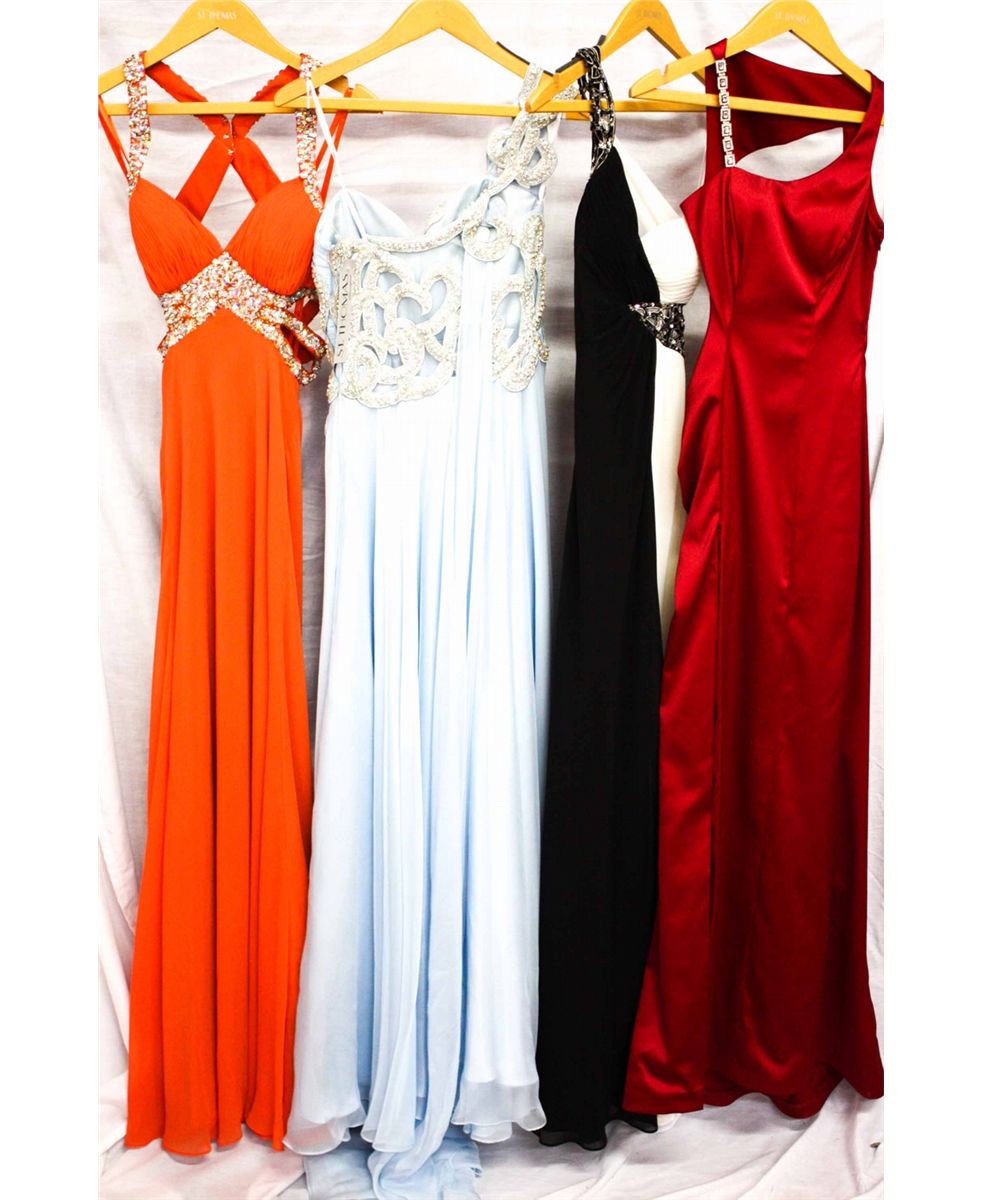Lot [4] DRESSES: [1] Faviana tangerine dress, size 0, [1] One shoulder gown, size 0, [1] Faviana open back 2 color dress, size 0 and [1] Faviana red gown, size 0