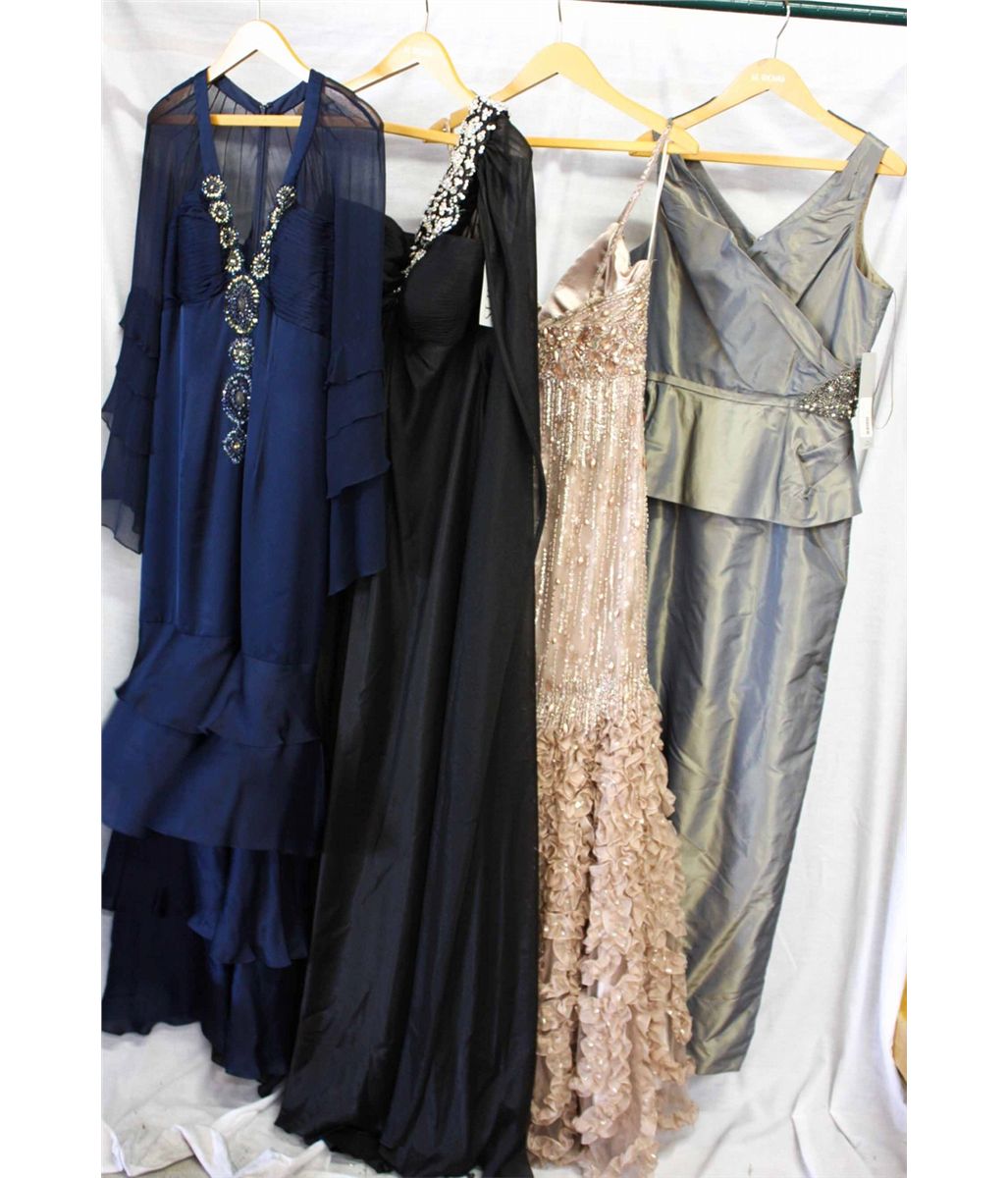 Lot [4] DRESSES: [1] Gold halter taffeta with sequins, size 10, [1] Full gown, size 10, [1] Jovani l