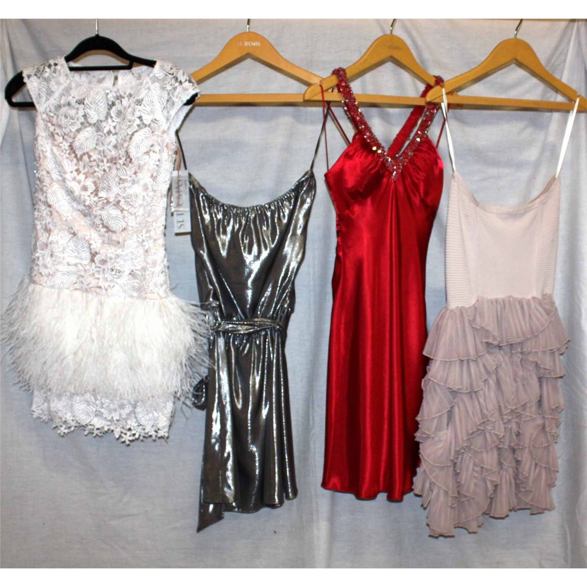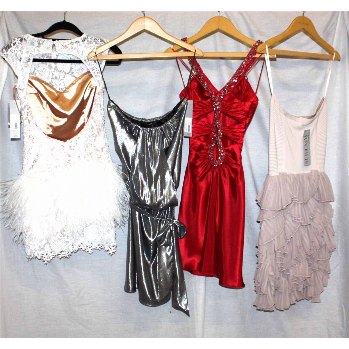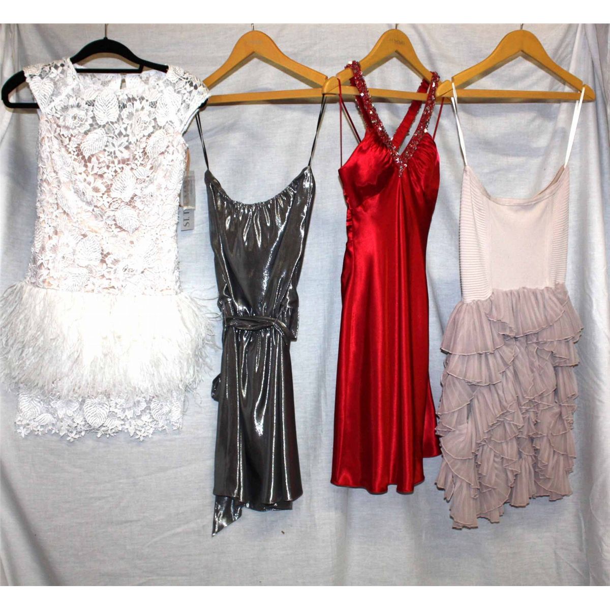 Lot [4] DRESSES: [1] St. Thomas strapless pink dress, size Medium, [1] St. Thomas loop back dress, size 0, [1] Jay Godfrey metallic dress, size 0 and [1] Jovani white feather dress, size 0