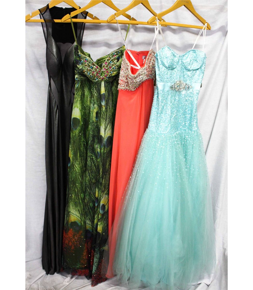 Lot [4] DRESSES: [1] Strapless gown full tull skirt, size 4, [1] Neckline beaded bust, size 4, [1] Strapless peacock gown, size 4, [1] Faviana silver foil jersey, size 4