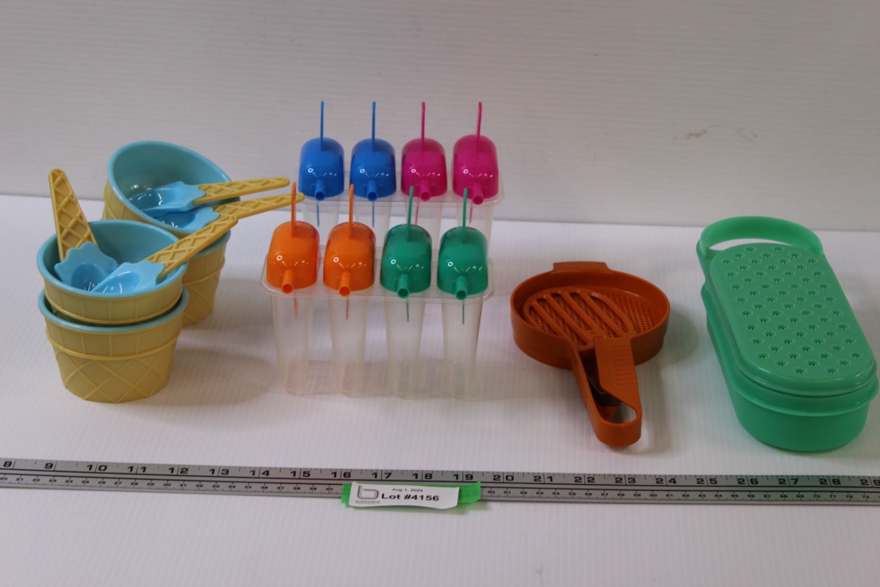 Lot: (4) Ice Cream Bowls/ Spoons, (2) Popsicle Sets, Tupperware Grater and Sifter