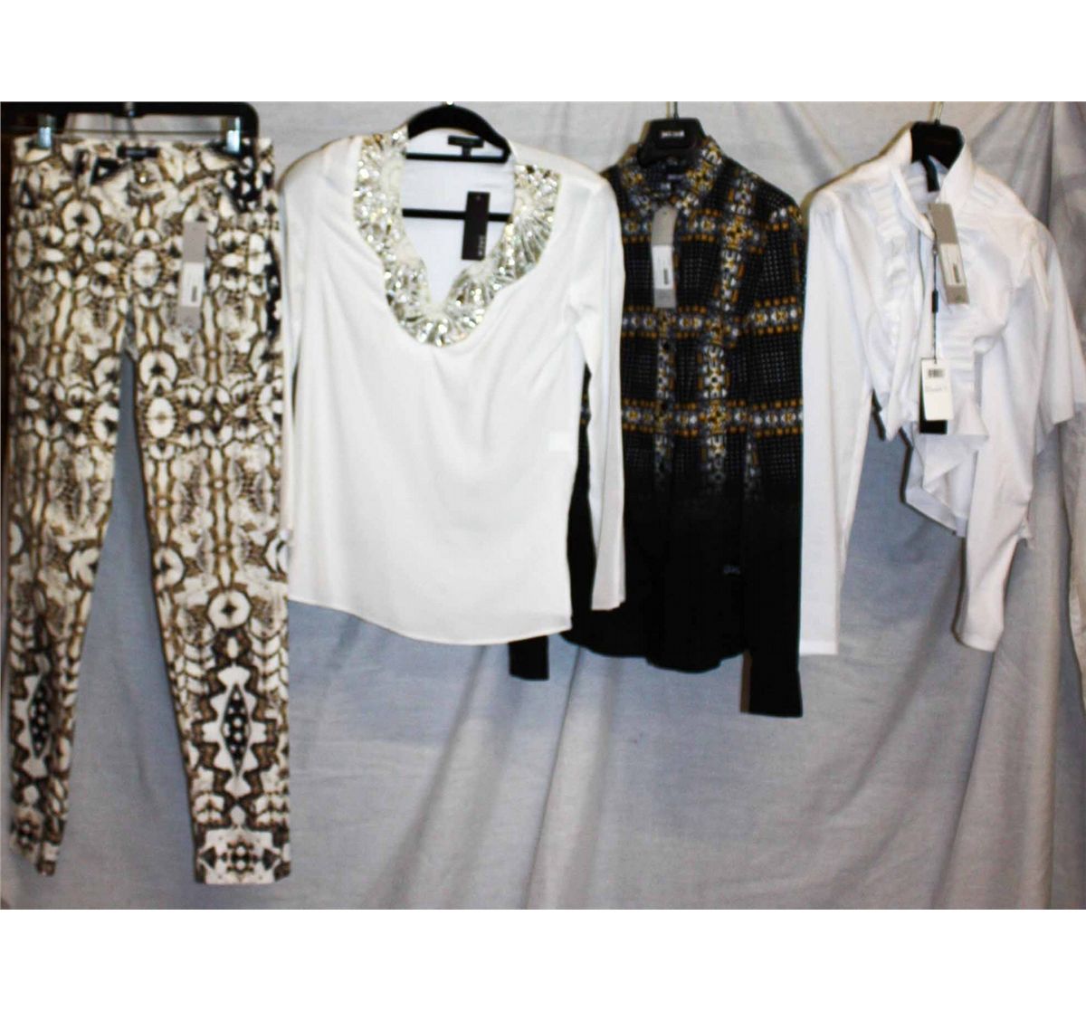 Lot [4] PIECES: [1] Marccain white blouse with zipper and ruffles in front, size 4, [1] JustCavalli print top, size 4, [1] Drew white blouse, size xs and [1] JustCavalli animal print jeans, size 4