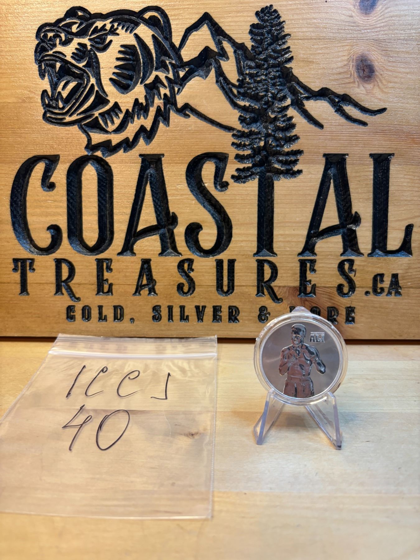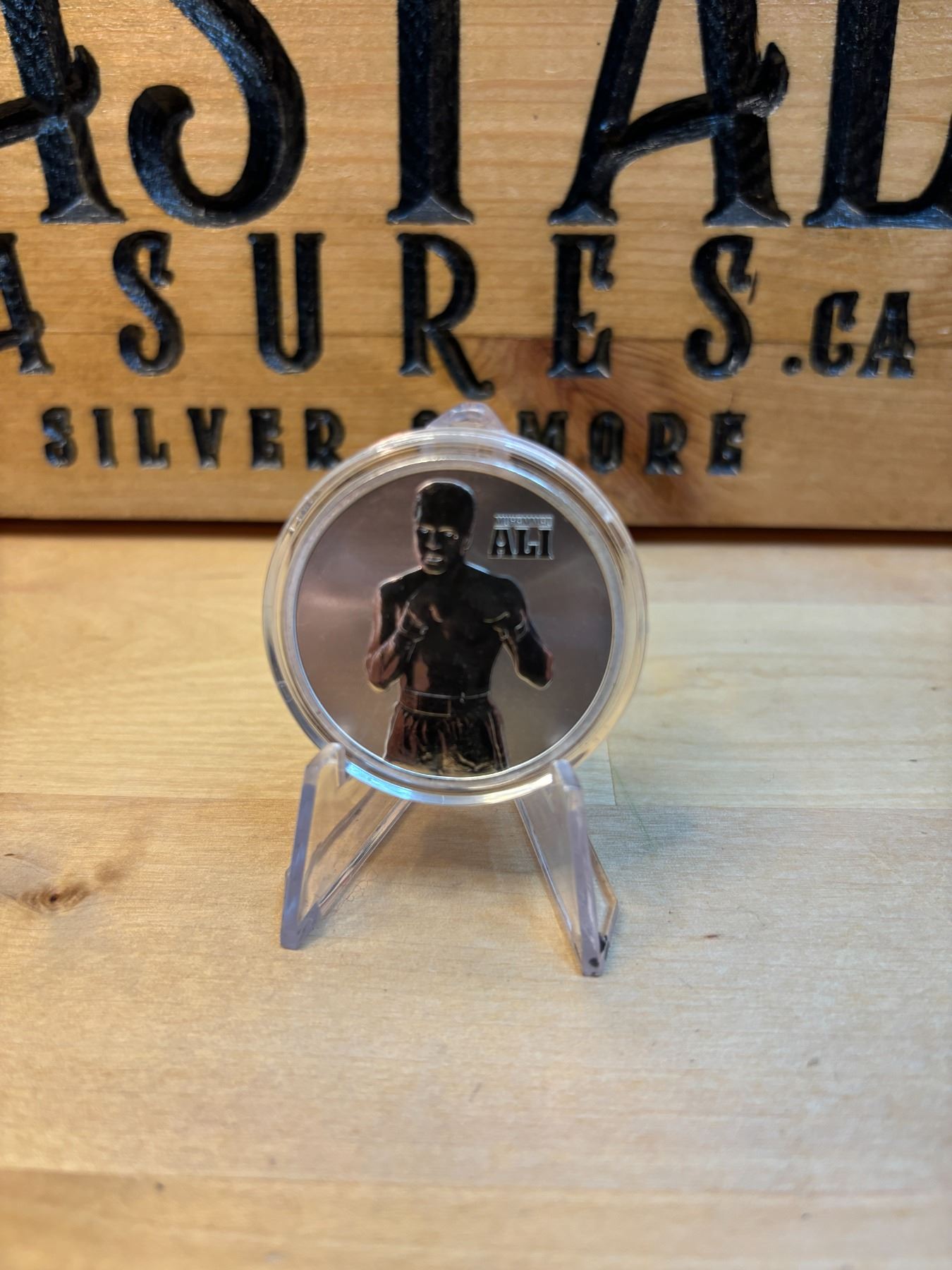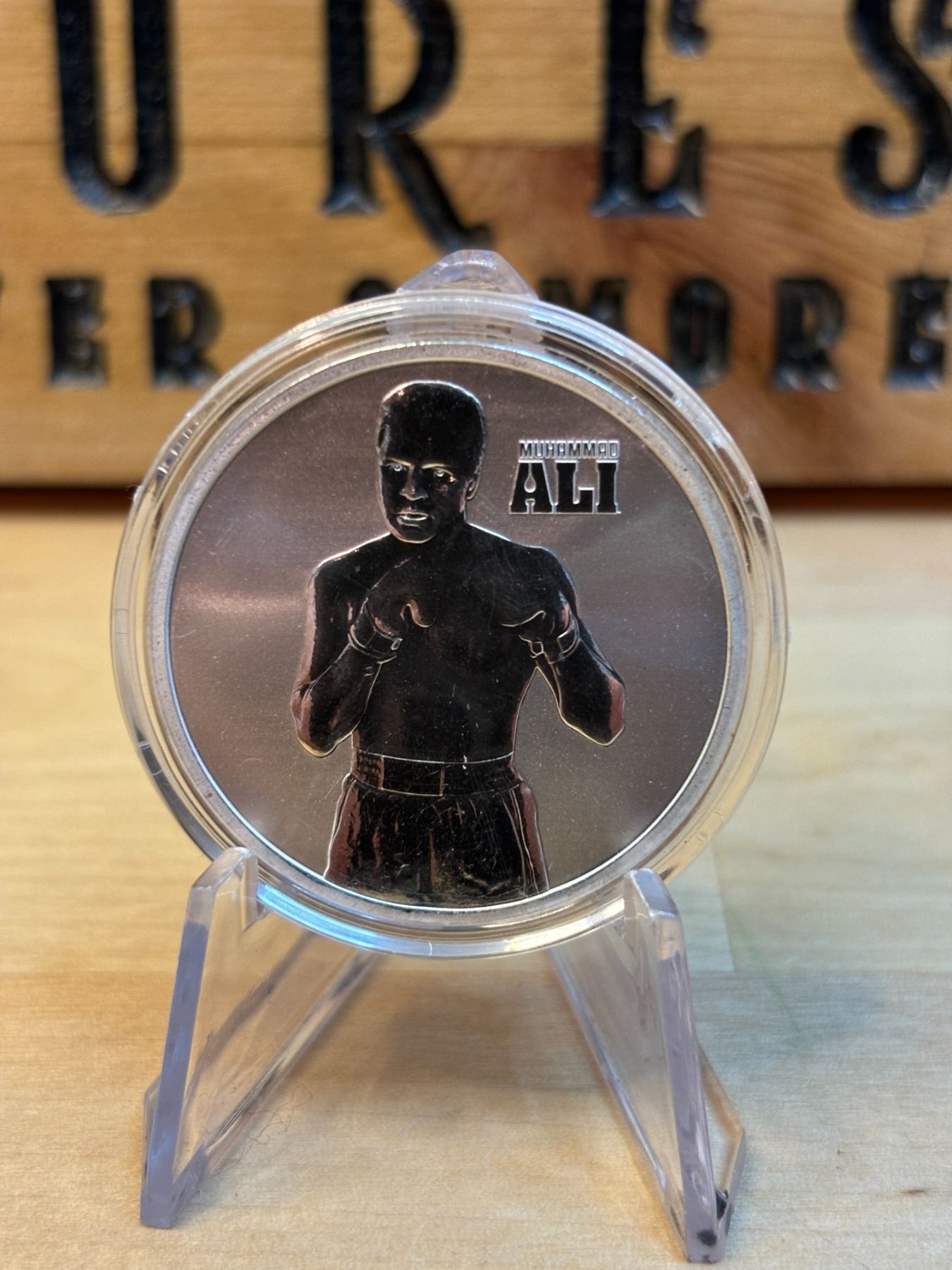 The 1 oz Muhammad Ali Silver coin is a commemorative piece celebrating the iconic boxer Muhammad Ali. Made of 1 ounce of .999 fine silver, this coin honors Ali's remarkable legacy both inside and outside the boxing ring. The design typically features a striking image of Ali, sometimes in action or with symbols representing his legendary fights, like the "Rumble in the Jungle" or "Thriller in Manila." As a limited edition, the coin appeals to collectors and boxing enthusiasts alike, often fetching a premium above its face value due to its rarity and connection to Ali’s storied career.