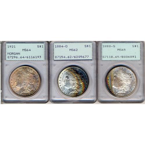 Lot of Three Mixed Dates Morgan Dollars PCGS Various Grades. 1880 PCGS MS65, 1884-O PCGS MS62, and 1921 Morgan PCGS MS64. (#7118)