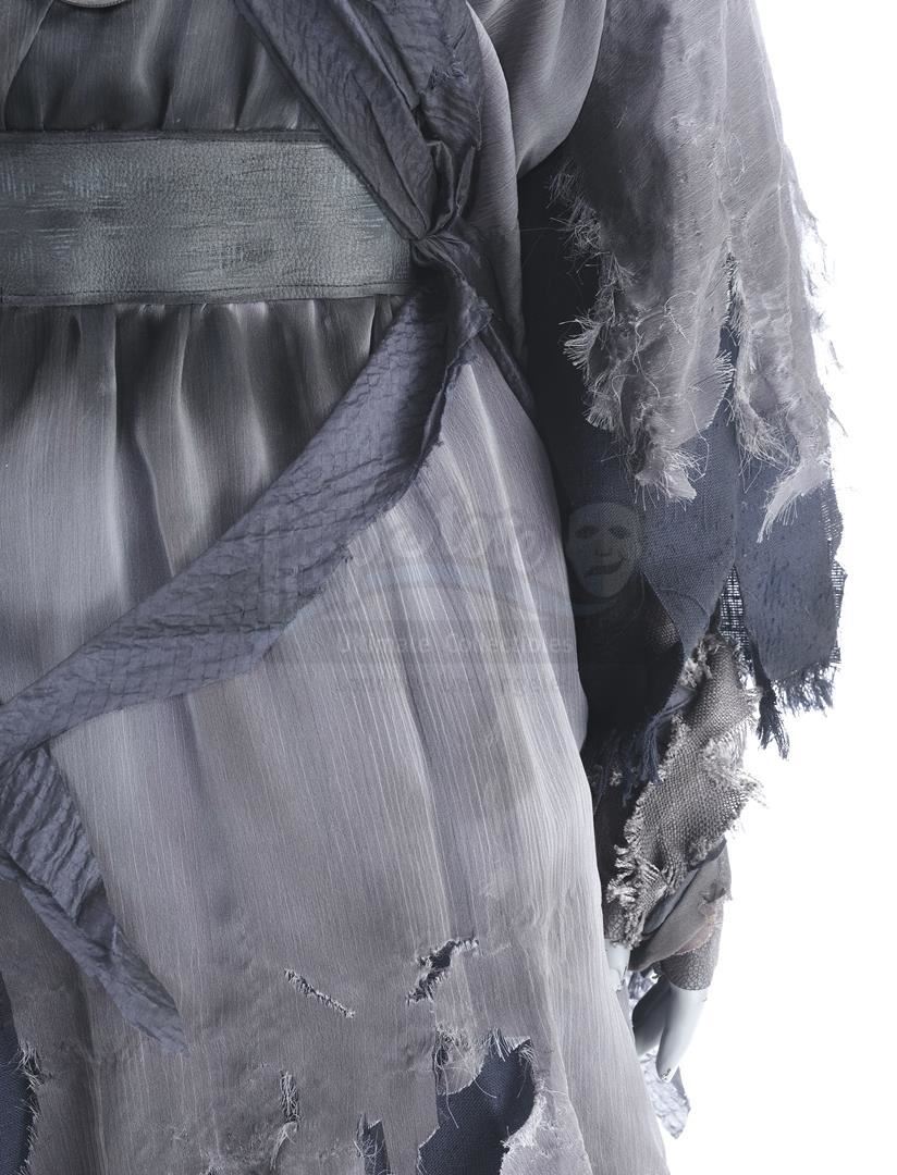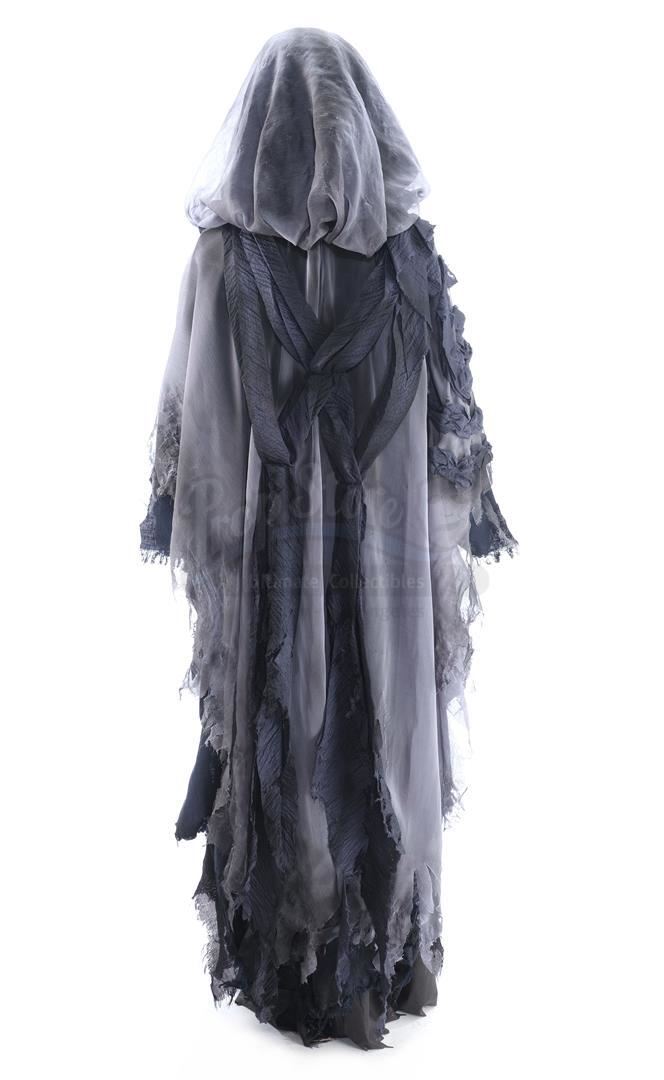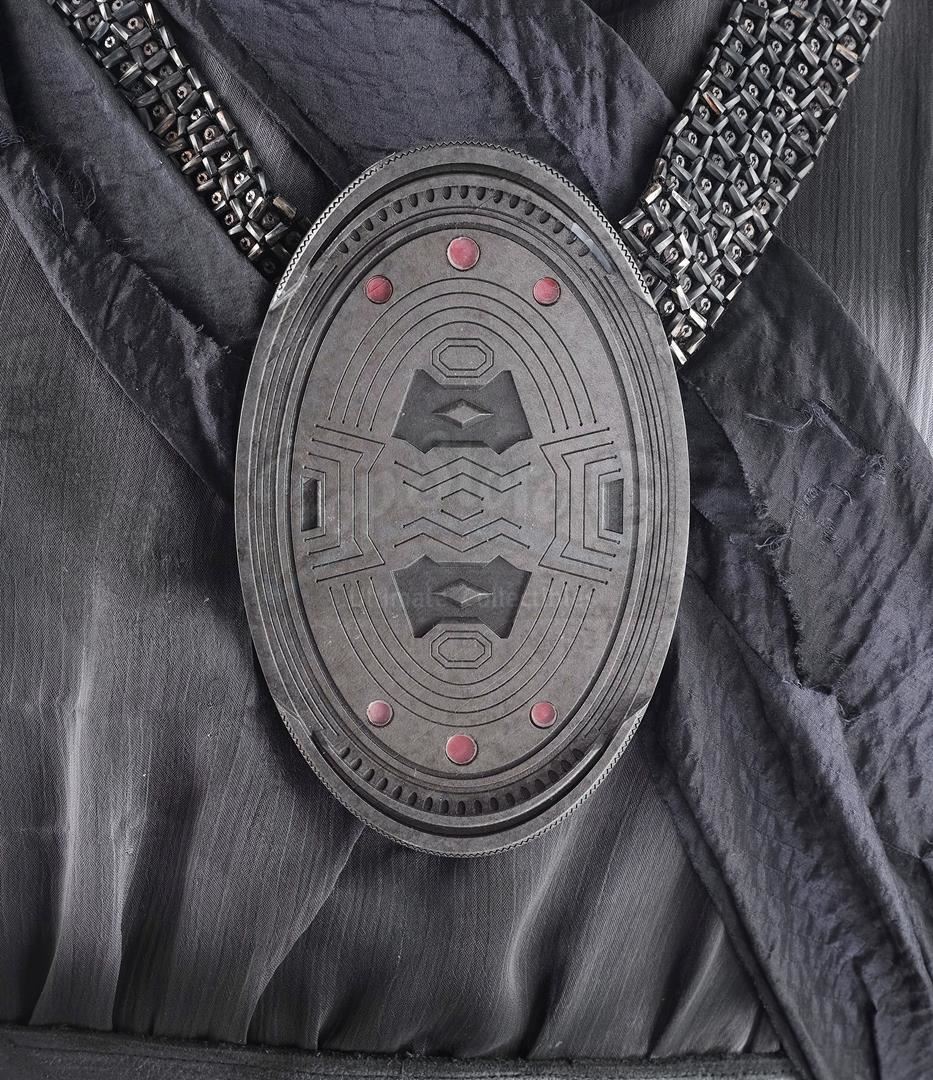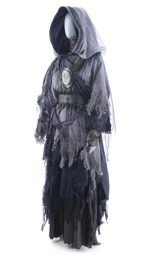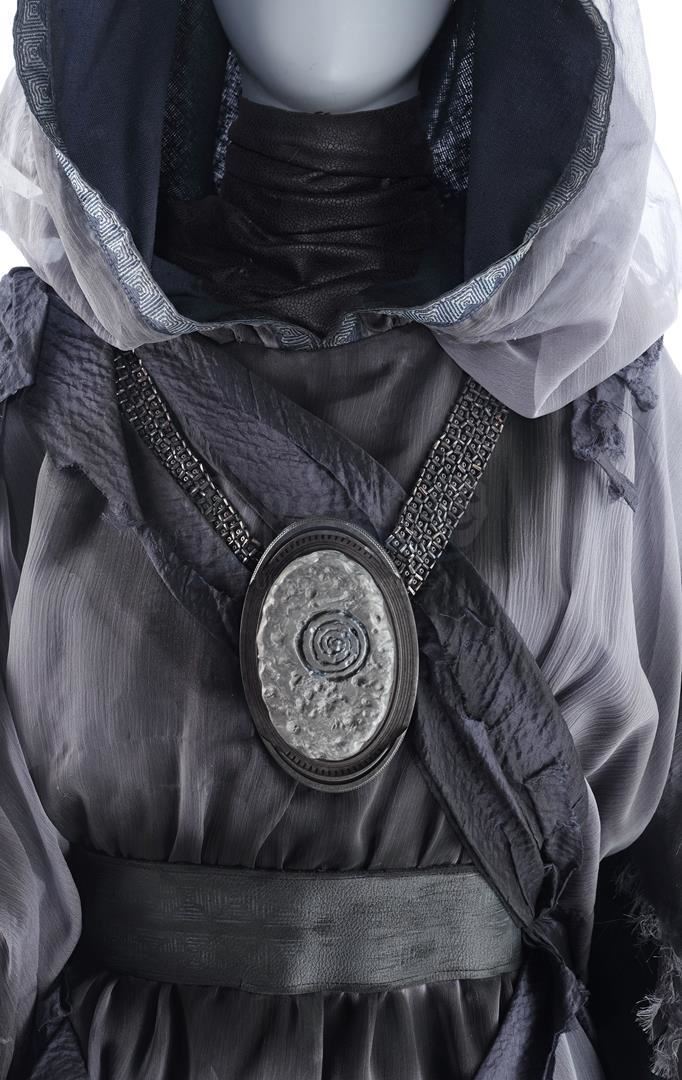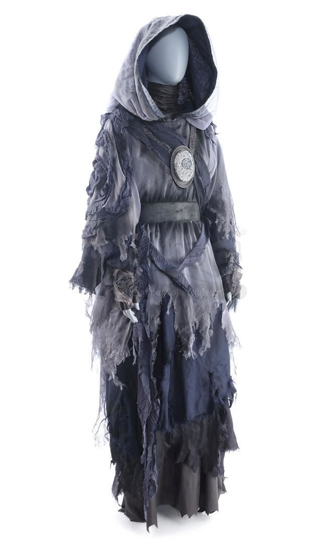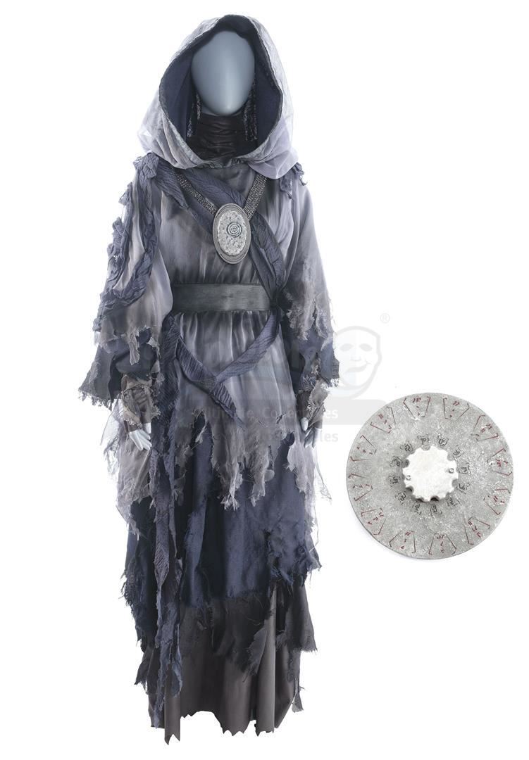 The Creation Spectre Shrike's costume with a Di'Allas space monolith necklace and a time dial from Seasons 5 and 6 of Marvel's Agents of S.H.I.E.L.D. The spectral manifestation of the Di'Alla of Creation from the Fear Dimension wears her costume throughout both seasons after she is summoned to Earth by Izel with help from the time dial machine. This costume consists of a black leatherette tunic with fastening strips marked for the principal actor, a heather blue, beige, and gray sequined linen, gauze, burlap, and leatherette hooded cloak, a gray resin amulet affixed with magnets and fastening strips, a gray resin necklace with a foam rubber and metal interior, a pair of gray and black cotton, linen and burlap fingerless gloves with fastening strips labeled for the principal actor, a black polyester and leatherette skirt labeled for the principal actor, and a metal dial with red markings affixed with a metal dial grip. The lot is in excellent overall condition with some minor signs of wear from production throughout.